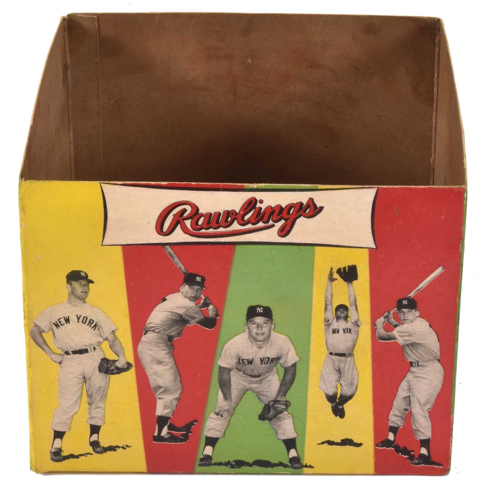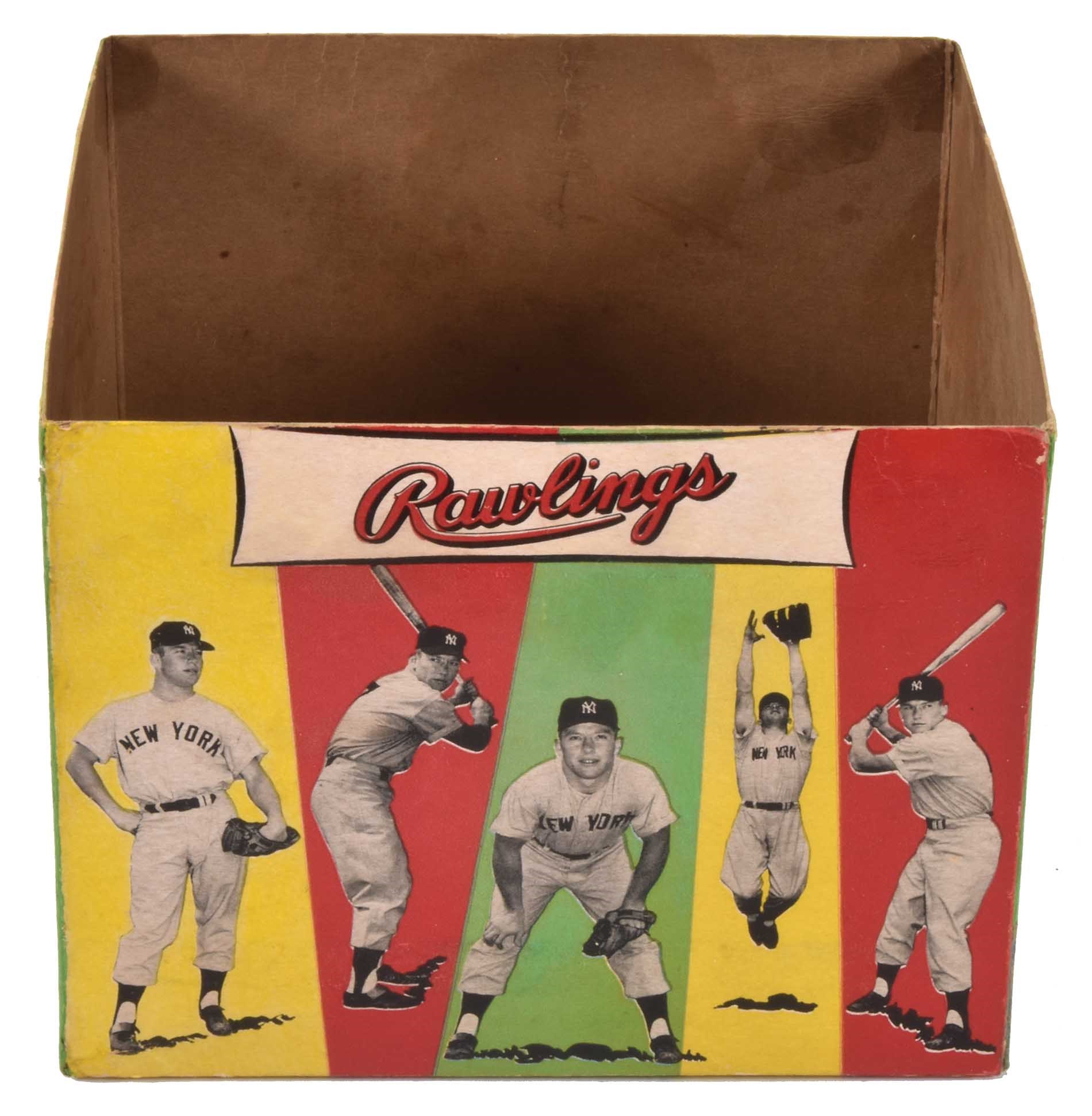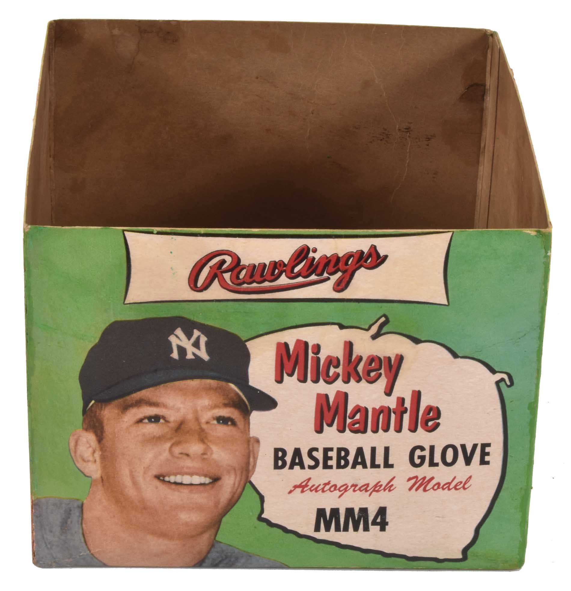 Offered here is what is universally regarded as the most attractive Mickey Mantle retail glove box ever issued, complete with its original glove. It is also just the second example of this Mantle rarity that we have ever offered. The colorful box, which houses a 1954-1956 Mickey Mantle Rawlings model "MM4" glove, features Mantle's image on the lid and all four sides. The lid pictures Mantle in uniform kneeling next to a large illustration of the glove, while the front and back sides of the box depict a large portrait of "The Mick". One of the many factors that sets this box apart from all others in terms of display value is the design of the two side panels, each of which pictures the same five identical photos of Mantle in uniform striking various poses: two batting (one from the left side, the other from the right), leaping, in a fielder's stance, and standing. Mantle was the king of New York at the time of this glove's issue and the striking design of the box was one that would certainly catch the eye of any youngster looking for a new glove to buy. This is a scarce box and we can only recall having seen three or four others. The box (8.25 x 8.25 x 6.5 inches) has had extensive professional restoration to numerous tears, abrasions, and splits along the seams. While the restoration is evident upon close inspection, it has been well executed and the box displays as Near Mint. The glove displays little-to-no use, with all of the manufacturer's stampings clearly legible. The leather remains supple and all of the lacing is intact. Minor corrosion affects most of the metal lacing holes (common for most gloves of this era); otherwise the glove is in Excellent to Mint condition. Reserve $1,000. Estimate $4,000+.