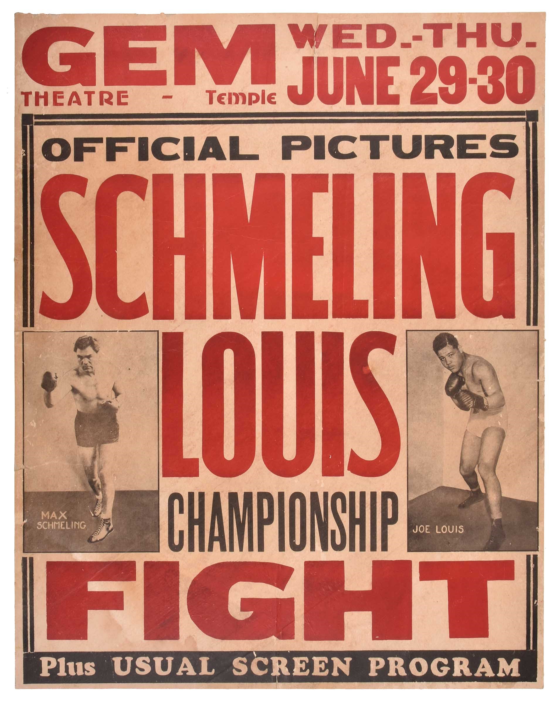 In an age before television, the only way in which people could see the fight live was to attend in person. For those not fortunate enough to do so, theaters across the country presented a film of the fight shortly afterwards. This theater poster is one of the rare surviving examples promoting that filming. The poster, issued by the "Gem" theater (no town or state is listed) advertises for two showings on "Wed-Thu-June 29-30." Full-length images of both boxers are featured prominently on the front, with the text reading "Official Pictures - Schmeling Louis Championship Fight - Plus Usual Screen Program." The poster (22 x 28), which is printed on cardboard stock, displays heavy wear, including moderate-to-heavy creases, edge tears, tack and staple holes, a few light stains, and tape repair on the reverse to one of the tears (the largest tear is approximately four inches running vertically from the top border). In Fair to Good condition. It should be noted that many of the flaws can be addressed by professional restoration and the poster displays at a higher level than that suggested by its technically accurate grade. The substantial size/weight of this item requires that there will be an additional shipping charge for this lot. Reserve $200. Estimate (open).