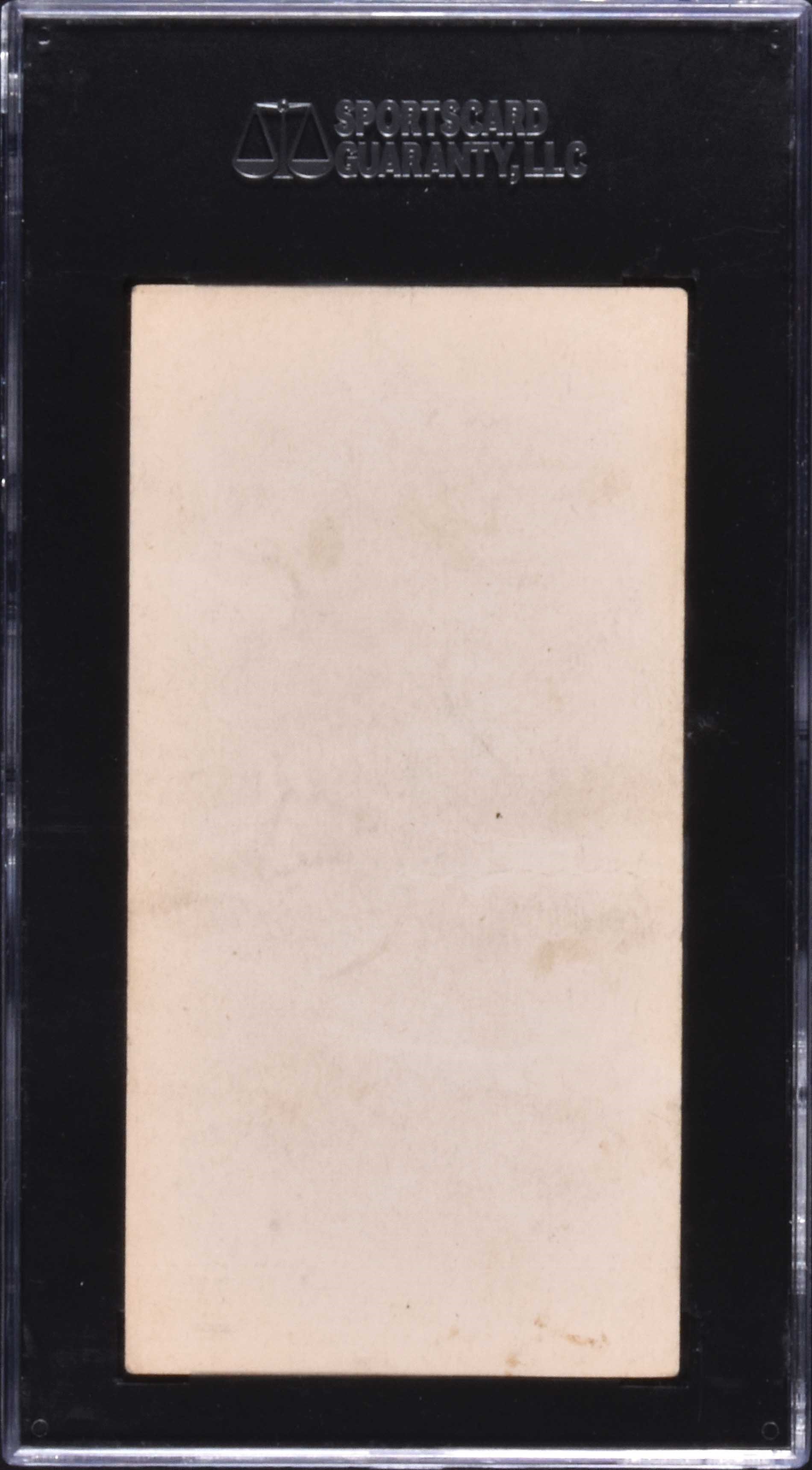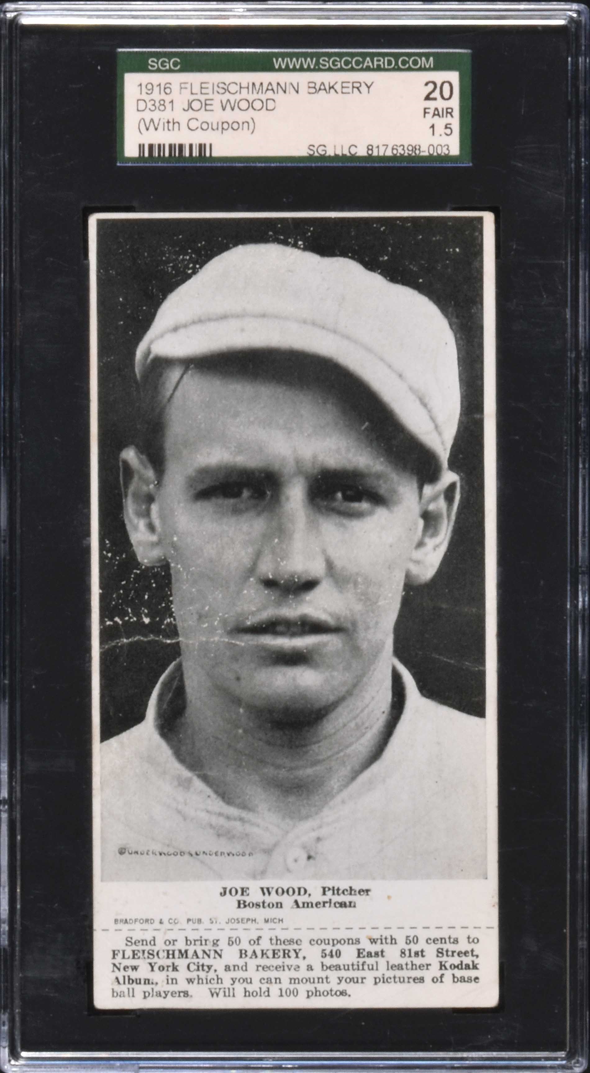 Superb example of Boston Red Sox star "Smoky Joe" Wood from the scarce 1916 D381 Fleischmann Bakery issue. The D381 set is a scarce bread issue produced by New York City-based Fleischmann Bakery for distribution with its products. These large cards (2-3/8 x 4-7/8 inches) are printed on thin stock and feature a coupon at the bottom designed to be clipped away and exchanged (fifty coupons plus fifty cents) for a leather album designed to hold the cards. Many of the surviving examples are found with the coupon clipped, but ideally, the offered example is fully intact. The offered card displays a crisp image, light wear at the corners, and centering slightly towards the top left. It has been downgraded to FAIR 20 by SGC due to multiple creases and light surface wear visible on the black background surrounding Wood’s image. The blank reverse is clean. This is one of only four examples of Wood ever graded by SGC from the D381 set! The thin stock makes D381s especially fragile and susceptible to minor faults, including creases, tears, and wear at the corners. This is a very attractive and desirable sample card from one of the scarcest and most condition-sensitive prewar bakery-card issues. Reserve $500. Estimate $1,000+.