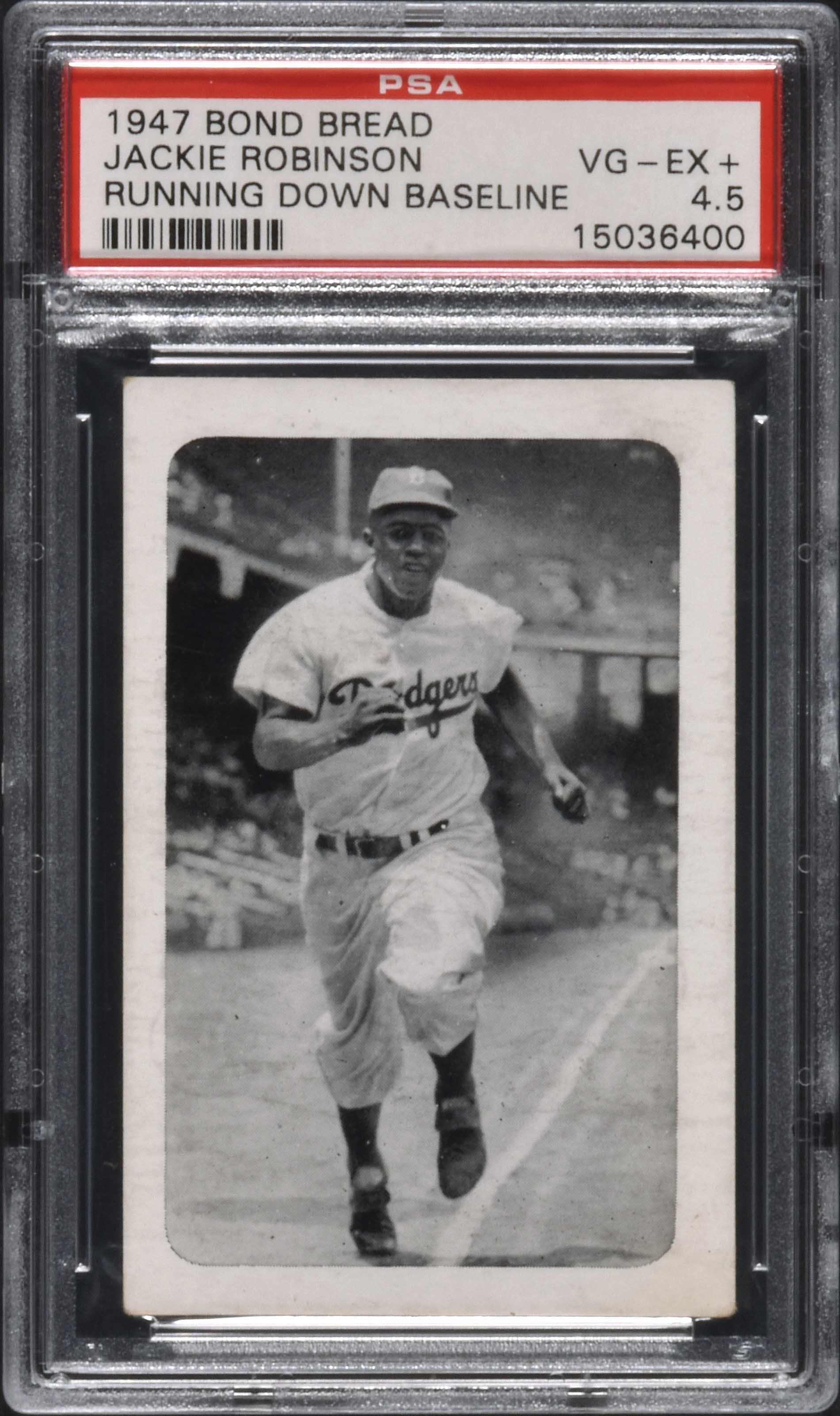 Graded VG-EX+ 4.5 by PSA. Rarely offered example of Jackie Robinson (running down baseline pose) from the circa 1947 Bond Bread set. The thirteen-card set is devoted entirely to Jackie Robinson and features the Brooklyn Dodgers Hall of Famer in various black-and-white poses on glossy card stock. The offered card is centered slightly toward the bottom left with a crisp image of Robinson and even wear on the corners. The back, which features an image of Robinson alongside a testimonial for Bond Bread as well as advertising for the company, is boldly printed. (Important set dating note: In the past, guides have always dated all Jackie Robinson Bond Bread cards as issued in 1947. Recent outstanding research conducted by two true card scholars and presented on Net54 conclusively proves the set was actually issued over a period of several years, 1947-1950. That is why we've added a "circa" to "1947" in this description. Here's the link: http://www.net54baseball.com/showthread.php?t=171169.) The circa 1947 Bond Bread issue is a historic set, dating from Jackie Robinson's earliest days in the Major Leagues, and individual cards from this classic issue will always be extremely desirable. Reserve $300. Estimate (open).