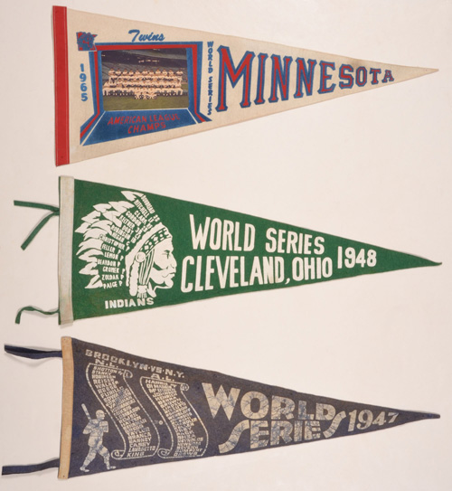 Collection of 10 different vintage World Series pennants spanning the years 1947 to 1966. 1) 1947 "Brooklyn vs. New York." Blue felt. Includes list of player names from each team including Jackie Robinson and Joe DiMaggio. 28.5 inches. Gd-Vg. 2) 1948 Cleveland. Green felt. 29 inches. Ex. 3) 1948 Cleveland. Red felt. 29 inches. No tassels (most likely as issued). Ex. 4) 1954 "New York Giants vs. Cleveland Indians." Blue felt. 28.75 inches (clipped tip). Vg. 5) 1957. Maroon felt. 29 inches. Ex-Mt. 6) 1958. Red felt. 29 inches. Ex. 7) 1959 Los Angeles Dodgers. Red felt. 29.5 inches. No tassels (most likely as issued). Ex-Mt. 8) 1959 Los Angeles Dodgers. Black felt. 29 inches. No tassels (most likely as issued). Ex-Mt. 9) 1965 Minnesota Twins. Includes team photo. White felt. 29 inches. No tassels (most likely as issued). Vg-Ex. 10) "L. A. Dodgers vs. Baltimore Orioles. Blue felt. 29.5 inches. Nr-Mt. Total: 10 pennants. Reserve $500. Estimate (open).