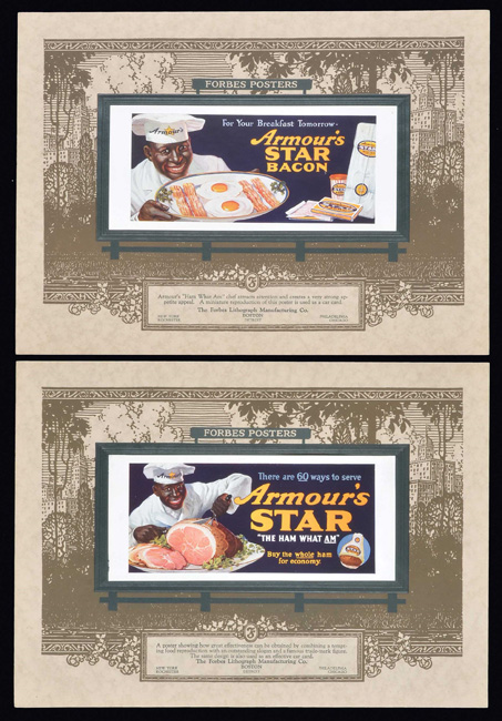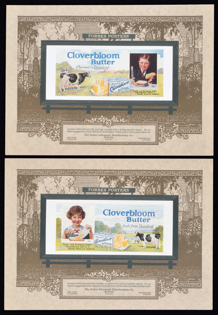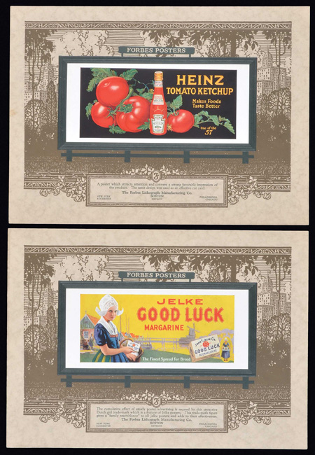 Circa 1920 salesman's portfolio, issued by the Forbes Lithograph Manufacturing Company, featuring eight beautiful full-color samples of the company's billboard advertisements. The unique design of each sample sheet features an identical illustration of a roadside billboard, with a different Forbes' full-color advertising lithograph affixed within its borders. The company's descriptive text appears in a preprinted box along the base. The highlight of this portfolio is two different vintage Coca-Cola advertisements. One was aimed specifically at retailers, while the other was produced for the typical consumer. The remaining sheets in the portfolio advertise for Heinz Tomato Ketchup, Jelke Good Luck Margarine, Armour's Star Bacon, Armours Star "The Ham What Am," and Cloverbloom Butter (2 different examples). Each sheet (12.5 x 9 inches) remains in Near Mint to Mint condition. The portfolio sleeve (9.5 x 13 inches) displays moderate-to-heavy handling wear, including a small chip in the lower right corner of the front cover. In Very Good to Excellent condition overall. Reserve $200. Estimate (open).
