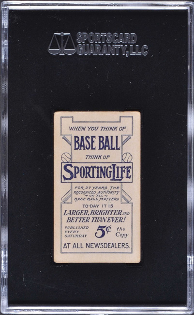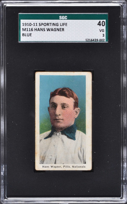 Graded VG 40 by SGC. Very attractive mid-grade example of Honus Wagner from the prized "Blue Background" series of M116 Sporting Life. This rare card is popular on many counts, including that the portrait is so similar in appearance to the famous T206 Wagner and dates from the same era. The "Blue Background" series is by far the most desirable series of the 1911 M116 Sporting Life set. These cards have always been especially appreciated by collectors for their scarcity and distinctive style, as well as for the unparalleled concentration of quality players in the series. Honus Wagner, of course, is one of the key cards of the "Blue Background" subset series. Bright and clean both front and back, with an extremely bold blue background, outstanding centering, even corner wear, and flawless registration. A couple light creases on the right portion of the card are responsible for the assigned grade. The Sporting Life advertisement on the reverse is entirely clean and boldly printed. This is an extremely attractive example in a very desirable and relatively affordable mid-grade of one of Honus Wagner's most distinctive and popular portrait cards. Reserve $1,000. Estimate $2,000+.
