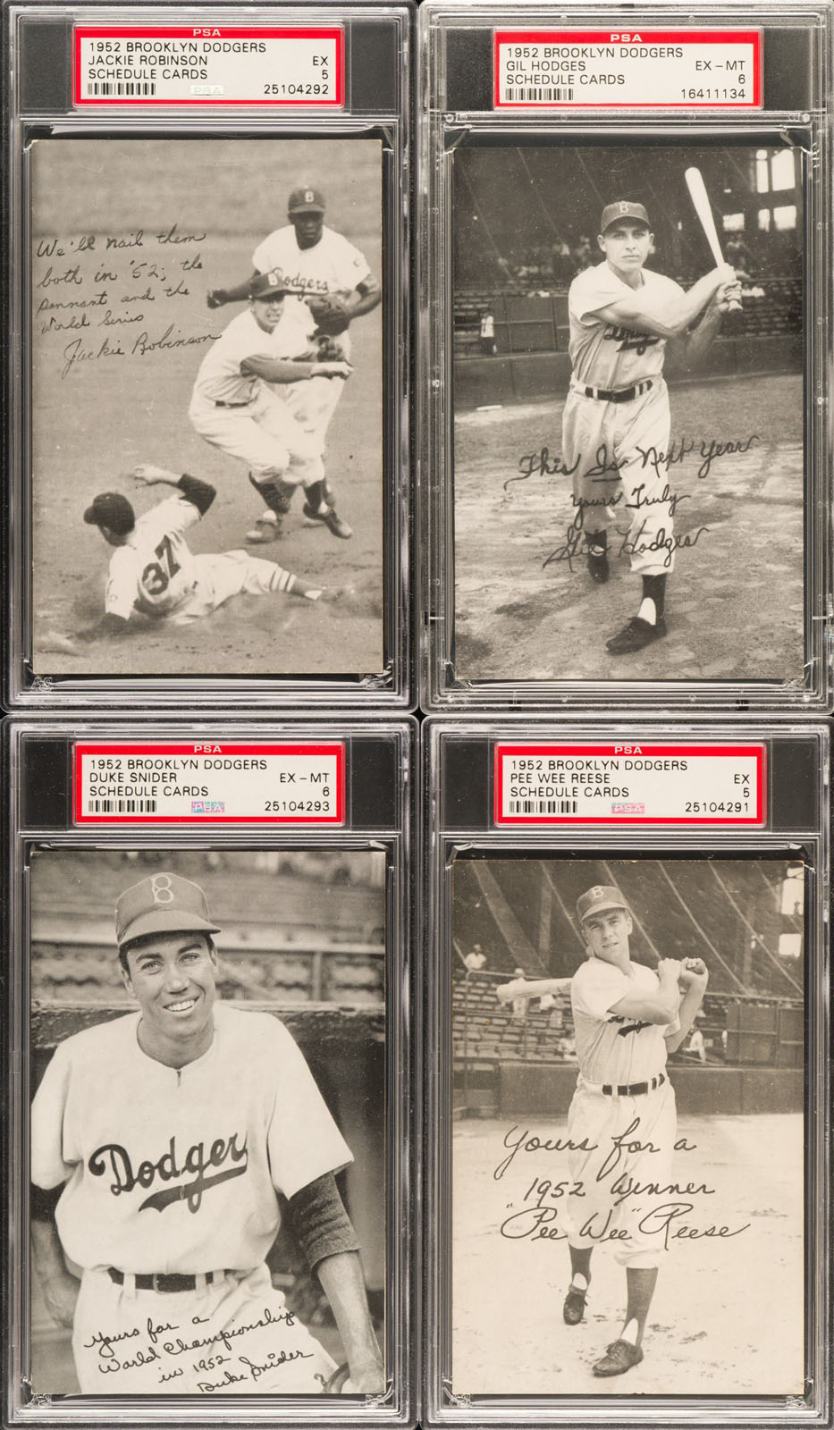 Incredible complete set of four different 1952 Brooklyn Dodgers ticket office schedule postcards, each featuring on-the-field poses of Dodgers players, with the player's preprinted salutation and signature in the background, and with the Dodgers' 1952 "Home" schedule and directions "How To Get To Ebbets Field" on the reverse. These postcards were published just prior to the 1952 baseball season for distribution by the Dodgers ticket office. This is the first complete set we have ever offered! Each card is graded and encapsulated by PSA: Gil Hodges (EX-MT 6), Pee Wee Reese (EX 5), Jackie Robinson (EX 5), and Duke Snider (EX-MT 6). 1952 Dodgers schedule postcards are rarely available in complete-set form, in any condition, and this offering presents an outstanding opportunity to acquire a high-grade complete set of this classic regional issue. Total: 4 cards. Reserve $300. Estimate (open).