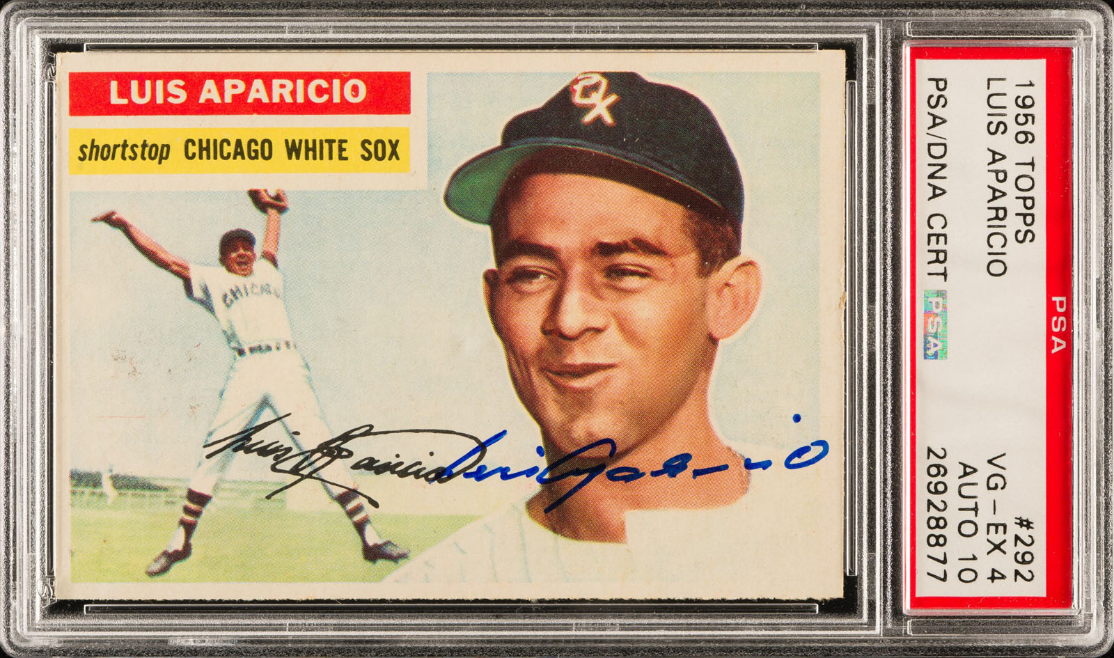 1956 Topps Luis Aparicio card #292 signed by Aparicio in blue Sharpie on the front. PSA/DNA has encapsulated the card; grading the signature GEM MINT 10 and the card VG-EX 4. This is an outstanding signed example of Aparicio's rookie card and one of the keys from the 1956 Topps set. Reserve $200. Estimate (open).