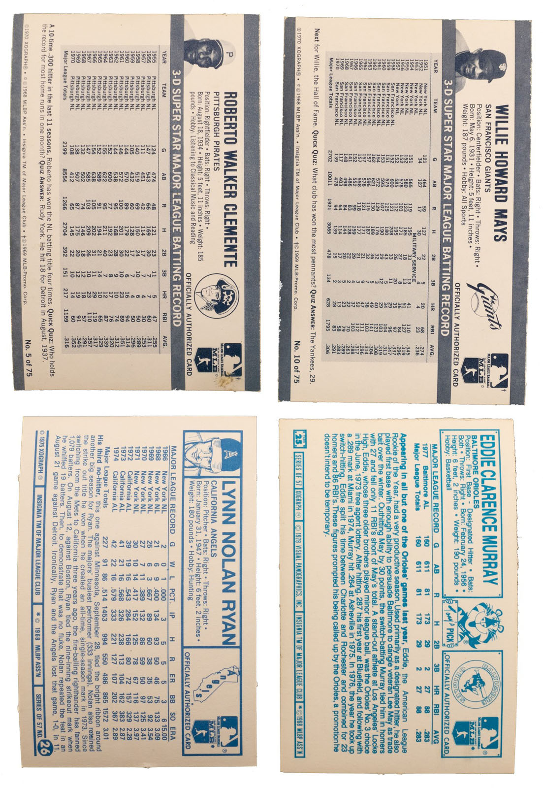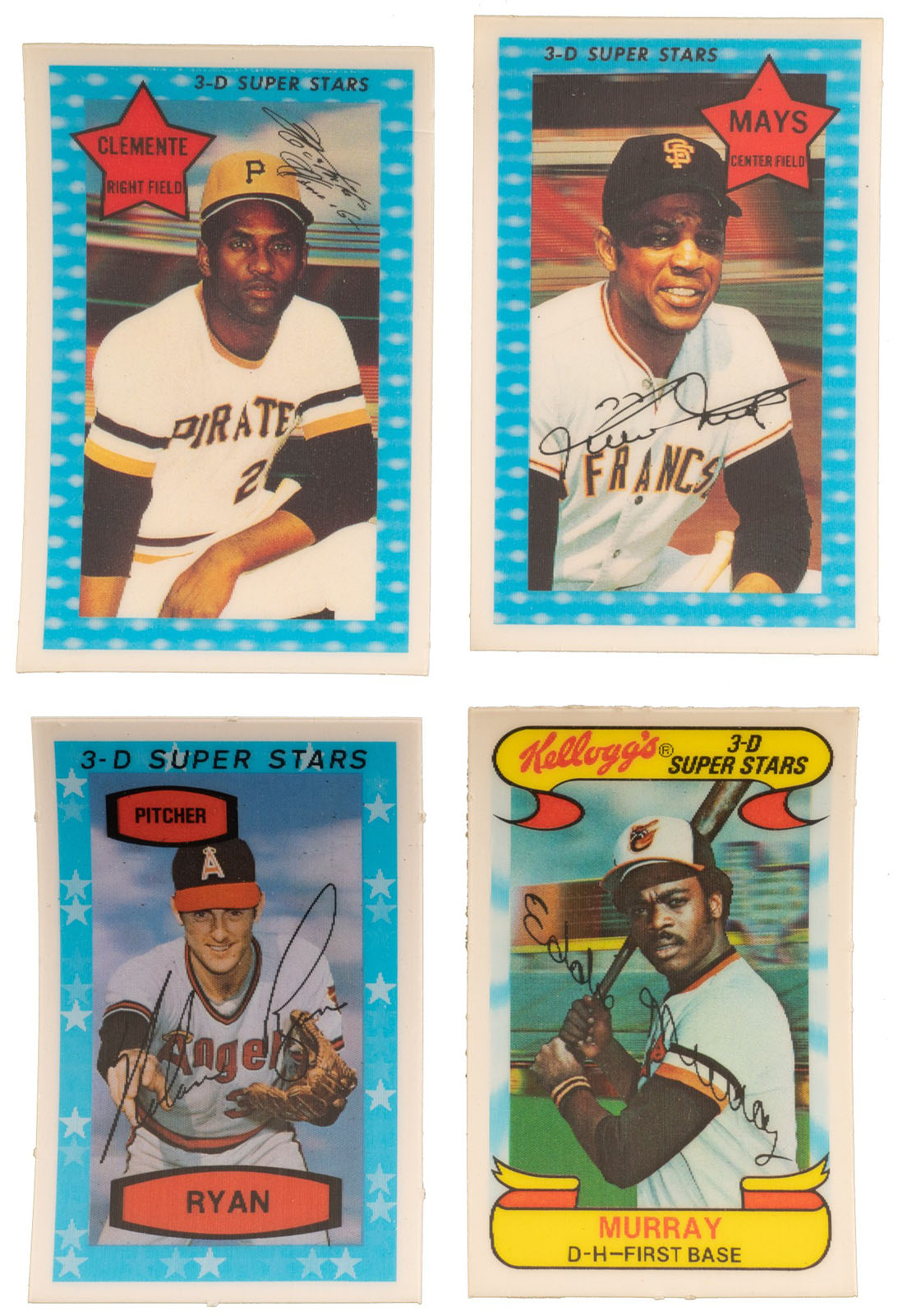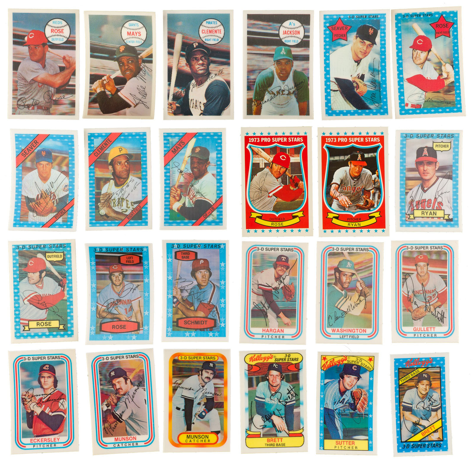 Comprehensive collection of fourteen complete sets of Kellogg's baseball cards, spanning the years 1970 to 1983, for a total of 850 cards. Throughout the 1970s and early 1980s, the Kellogg's cereal company was the only true competition for Topps in the baseball-card market. These sets include cards of Willie Mays, Roberto Clemente, Ernie Banks, Nolan Ryan, Tom Seaver, Reggie Jackson, and Pete Rose. All the other stars of the day are also included. Of course, instead of having to buy only a stick of gum to get a stack of cards, you had to buy an entire box of cereal just to get one card (unless you sent in for a set by mail, an offer that was not available with the 1971 Kellogg's set)! This collection consists of the following: