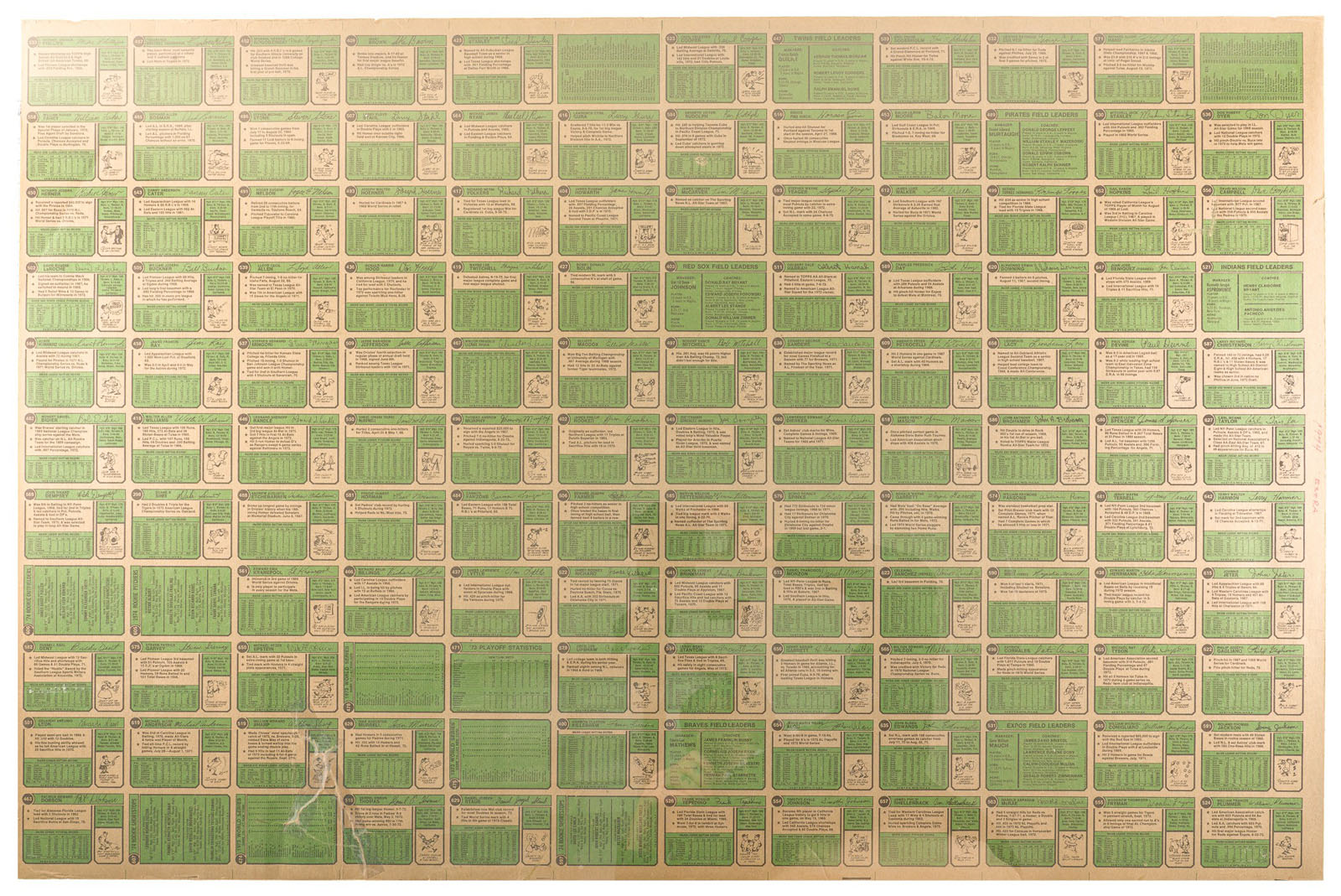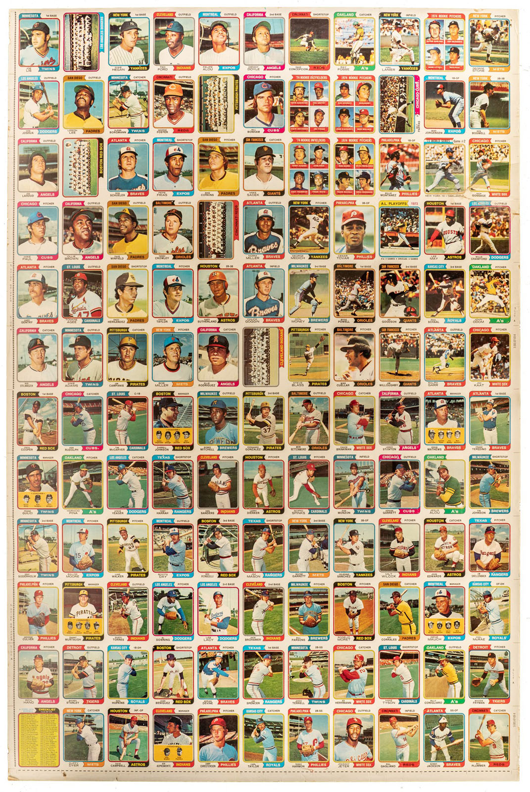 Original 1974 Topps baseball uncut final production sheet consisting of 132 cards with fully printed reverses, highlighted by the key rookie card of Hall of Famer Dave Winfield. The sheet is arranged in twelve rows of eleven cards. Additional key cards included are Gossage, Mathews, and Griffey (rookie). Grading of sheets has always posed a problem as we naturally tend to grade a sheet as if it were a "big card" when really a grade does not capture the condition or visual appeal of a sheet (all the more so as sheets tend to be large). That is certainly the case here. Technically, the sheet is in Poor condition due to various condition flaws, including a six-inch tear on the right side repaired with clear tape affecting four cards (including Gossage), moderate creases, a few edge tears and nicks, and the notation "1974 Extra" in red ink on the reverse. Despite these flaws, this is still a presentable display sheet. Dimensions: approximately 28-1/2 x 43 inches. Please note: This sheet has been stored rolled for many years as intended and will be shipped as such. Reserve $300. Estimate (open).