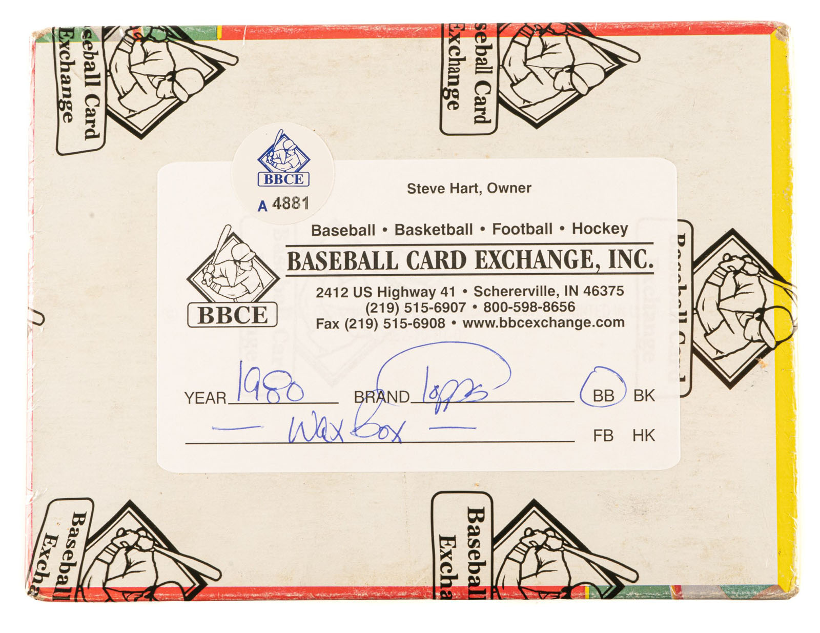 Complete original unopened wax box of 1980 Topps baseball. The box houses thirty-six wax packs, with each pack containing fifteen cards, for a total of 540 cards. The 1980 Topps set includes the rookie card of Rickey Henderson, and many other Hall of Famers including Nolan Ryan, George Brett, and Ozzie Smith. All the other stars of the day are also included. While it is impossible to provide guarantees with reference to grading of unopened material, there is, of course, the very real possibility that within this box are Gem Mint cards. The display box comes shrink-wrapped by Baseball Card Exchange (owned by Steve Hart, the foremost expert on unopened material). Reserve $500. Estimate $1,000+.