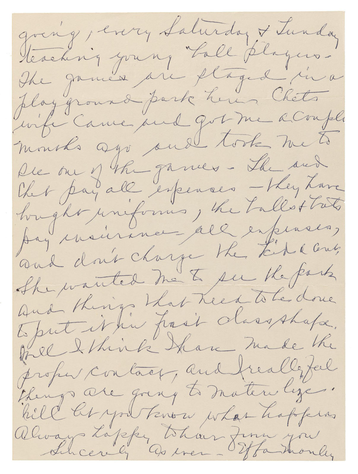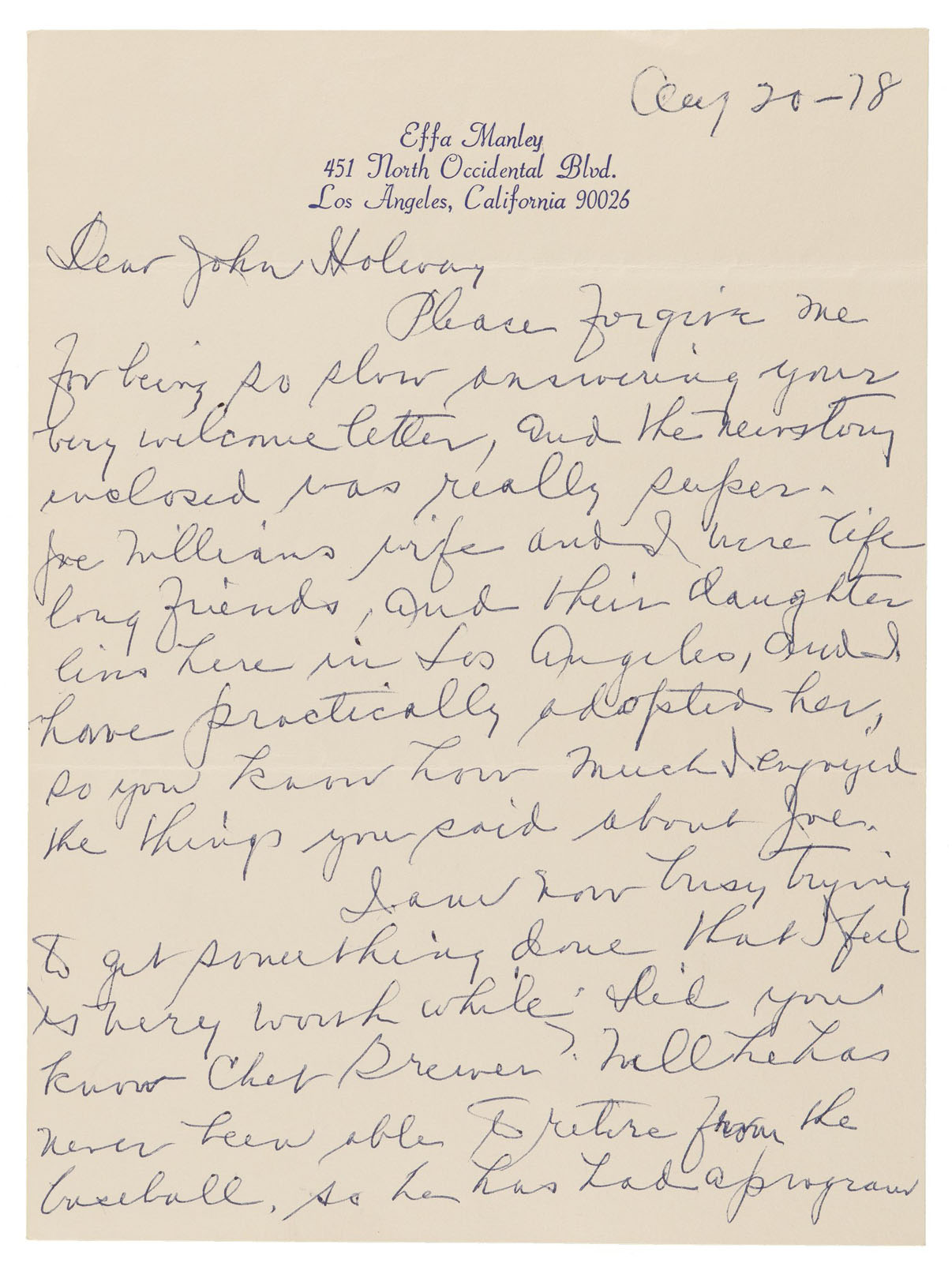 Two-page handwritten letter (on both sides of a single sheet) signed by Effa Manley, the only woman elected to the Baseball Hall of Fame. The letter, dated August 20, 1978, is written to Negro League baseball historian John Holway. She begins by discussing her relationship with the daughter of former Negro League pitcher Joe Williams and then informs Holway of Chet Brewer's work with young ballplayers. In part: "Did you know Chet Brewer? Well, he has never been able to retire from the baseball, so he has led a program going, every Saturday & Sunday teaching young ball players. The games are played in a playground park here. Chet's wife came and got me a couple months ago and took me out to see one of the games. She and Chet pay all expenses - they have bought uniforms, the balls + bats, pay insurance - all expenses and don't charge the kids." The letter is signed "Effa Manley" in blue ink, with both the text and signature grading "9." Chet Brewer was a former Negro League pitcher who played with a number of teams, most notably the Kansas City Monarchs, where he teamed with Satchel Paige. Effa Manley, together with husband Abe, owned the Newark Eagles, which was a member of the Negro National League from 1936 to 1948. Effa ran the team's business affairs, and she later became a strong advocate for both players' rights and civil rights. In addition to her baseball duties, Manley was treasurer of the Newark chapter of the NAACP and often used the team to promote civic causes. In 1946, following the death of her husband, she assumed total control of the team. During the next two years she fought vigorously against the raiding of her players by Major League clubs (she lost top stars such as Larry Doby, Don Newcombe, and Monte Irvin). Unfortunately, it was a battle she could not win, and in 1948 she was finally forced to disband the club. Effa Manley letters are scarce, especially those featuring baseball content. The letter (5.75 x 7.75 inches) displays two horizontal mailing folds and is otherwise in Excellent to Mint condition. Full LOA from PSA/DNA. Reserve $500. Estimate (open).