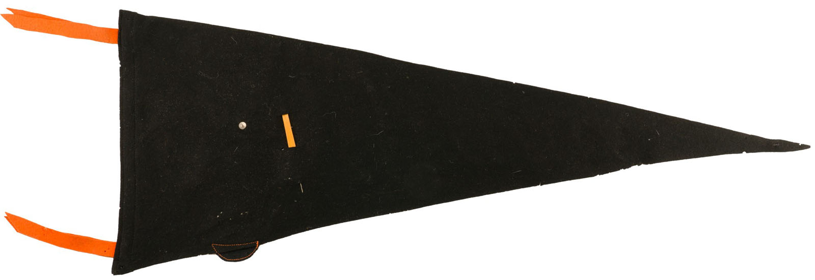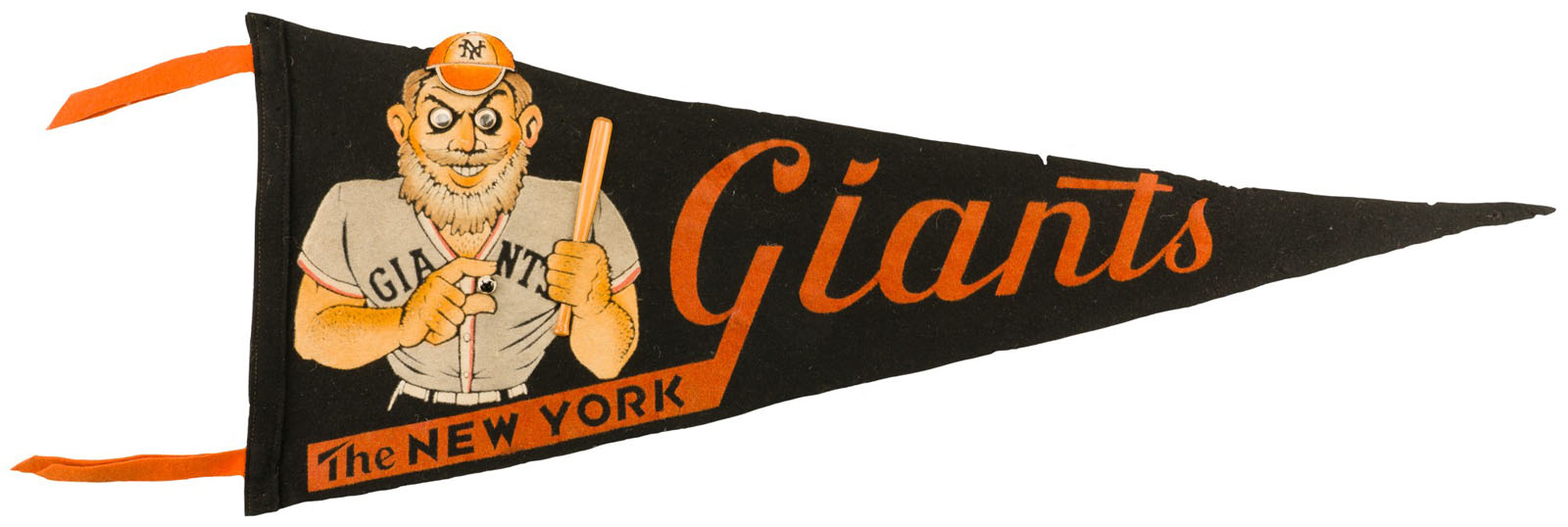 Exceedingly rare New York Giants "three-dimensional" pennant dating from the 1950s. This is the first example of this extraordinary pennant we have ever offered and we cannot recall having seen another at auction in the past 20 years. The unique design features a colorful illustration of a bearded New York Giants player holding a bat in one hand and a baseball in the other. The words "The New York Giants" are printed below and to the right of the image. The "three-dimensional" aspect of the pennant is in the use of a real, wooden bat (sliced in half and mounted by means of staples and a slit in the fabric), a separately applied cap that extends beyond the borders of the pennant, and both plastic eyes, and baseball (mounted by means of a metal fasteners). It should be noted that during the 1950s the Brooklyn Dodgers and New York Giants also produced similarly designed, and equally rare, "three-dimensional" pennants, examples of each are also featured in this auction. (Incredibly, all three pennants were just recently discovered by our consignor at an estate sale and are therefore new to the hobby.) Another unique feature of this pennant is that the illustration and all the lettering appear to be done in colored felt, as opposed to standard paint. Given the cost of its manufacture, this was probably a very expensive pennant at the time, and one that only the wealthiest fans could afford. That fact, plus its fragile nature, probably explains why so few are known today. The pennant, which is complete with tassels, displays wear to the baseball (much of the paint has chipped away), and a number of small edge tears. Tack holes are evident in the tip and each corner. In Very Good to Excellent condition overall. This is a most extraordinary example of one of the "Holy Grails" of both pennant and New York Giants collecting. 29 inches in length. Reserve $1,000. Estimate (open).