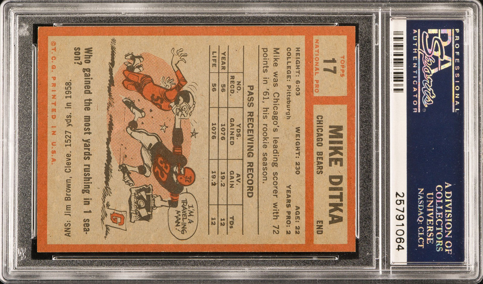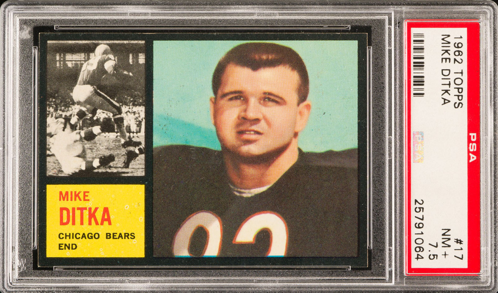 Graded NM+ 7.5 by PSA. Outstanding example of #17 Mike Ditka (Chicago Bears), one of the key Hall of Famer rookie cards from the 1962 Topps Football series, one of the most popular football-card issues of the 1960s. The 1962 Topps football set is particularly difficult to collect in high grade, as the black flush-to-the-border design of the set makes them particularly susceptible to corner and edge wear. The offered card is bright, crisp, and clean, with four sharp corners, bold colors, near-perfect centering, and no wear to the condition-sensitive black borders. Clean reverse. This is a very attractive high-grade example that would be a worthy addition of any top-quality 1962 Topps football set or Hall of Fame rookie-card collection. Reserve $300. Estimate $500+.