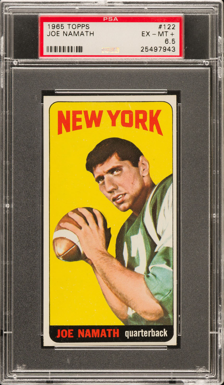 Graded EX-MT+ 6.5 by PSA. Very sharp looking, high-grade example of one of football-card collecting's great classics, the rookie card of "Broadway" Joe Namath from the very popular and condition-sensitive 1965 Topps "Tall Boys" football series, also noted as a short print within the set. The offered example presents with bright colors and a flawless image. The card displays four strong corners and centering slightly toward the bottom right. Clean reverse. It takes a certain type of athlete to guarantee victory. An even more select group is composed of those who have made good on their victory guarantee, and perhaps none of these athletes was as confident, exciting, successful, and outstanding as Hall of Fame quarterback Joe Namath. Namath's New York Jets, the AFL Champions, were 19-1/2 point underdogs to the NFL Champion Baltimore Colts in Super Bowl III, yet "Broadway" Joe guaranteed a Jets victory. Sure enough, Namath vindicated himself by leading his Jets to a 16-7 win, paving the way for the AFL-NFL merger by essentially legitimizing the AFL in the eyes of its critics. His legend was assured. This is a beautiful example of Joe Namath's rookie card, which is the key card from the set, and one of the all-time classic football cards. Reserve $1,000. Estimate (open).
