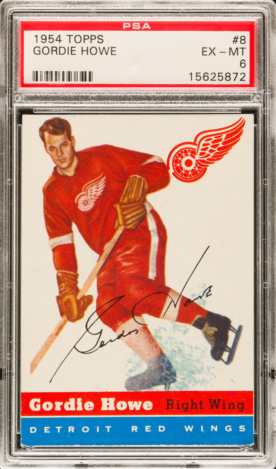 Graded EX-MT 6 by PSA. Extremely attractive example of Detroit Red Wings Hall of Famer Gordie Howe from the landmark 1954-1955 Topps Hockey series, the first hockey set issued by Topps. The flush-to-the-bottom-border design of the 1954-1955 Topps Hockey set makes this issue particularly susceptible to edge and corner wear so finding high-grade examples is extremely difficult. Bright, crisp, and clean, the offered example is entirely deserving of its assigned grade, with brilliant colors, outstanding centering, four strong corners, and very light wear on the bottom edge. Clean reverse. This is a tremendous mid-grade example of one of Gordie Howe's most classic cards from this extremely popular hockey-card set. Reserve $300. Estimate $500+.