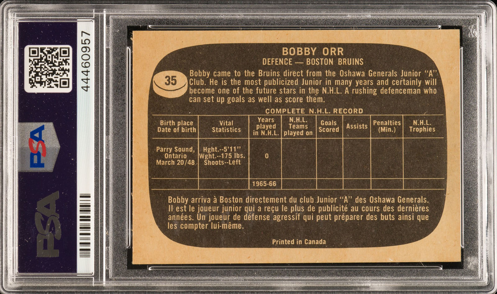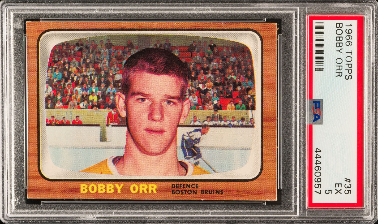 Graded EX 5 by PSA (submitted by REA). Extremely appealing mid-grade rookie card of Bobby Orr, arguably the greatest hockey defenseman to play the game. This card is especially difficult to find in high grade because of the brown flush-to-the-border design of the 1966 Topps Hockey set. This example has light touches of wear on the corners, bright colors, a flawless image, and virtually no wear to the condition-sensitive brown borders. Centered just slightly to the left and with a perfectly clean reverse. There are no major creases or wrinkles. Extremely attractive mid-grade rookie card of Hall of Famer Bobby Orr, the key card from this classic hockey-card issue. Reserve $500. Estimate $1,000/$2,000+.