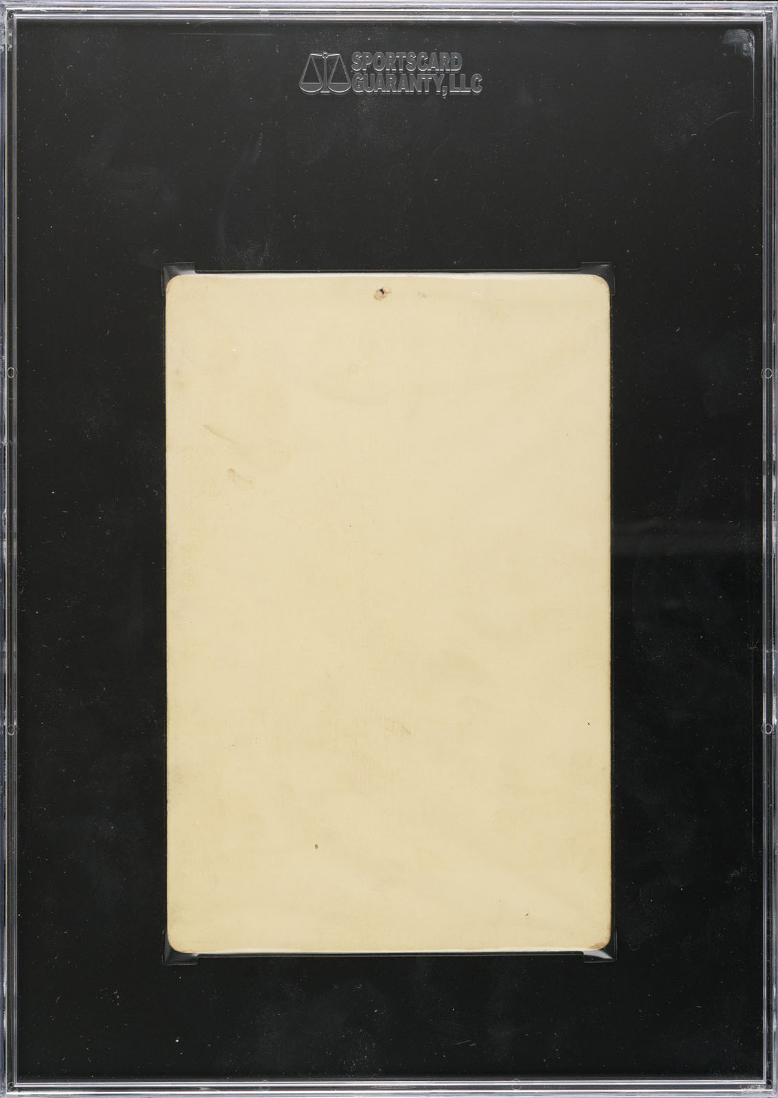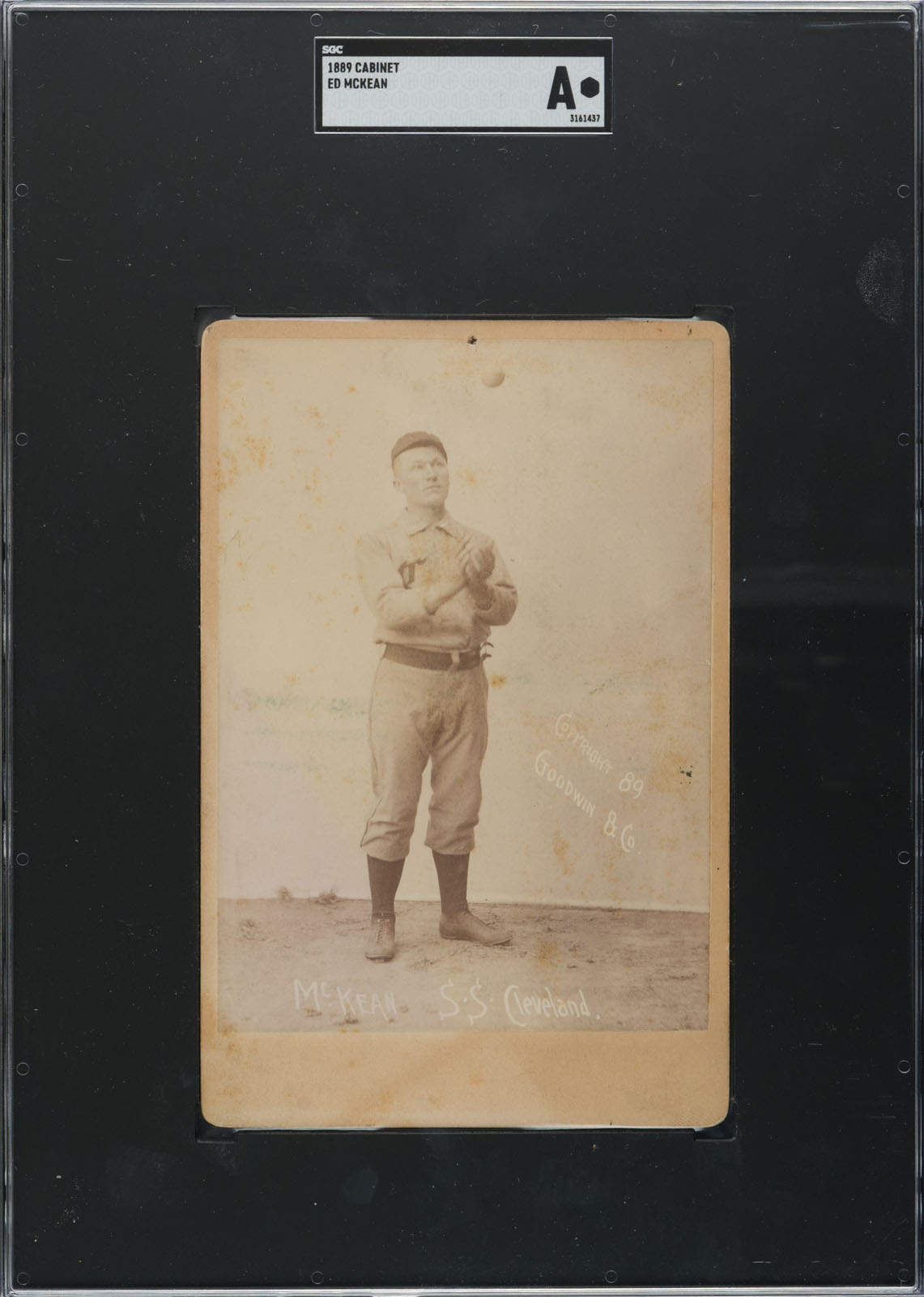 N173 Goodwin Old Judge cabinet proof of shortstop Ed McKean. The card features the printed notation "Copyright 89, Goodwin & Co." in the lower right quadrant of the photo. The printed player identification along the base of the photo reads "McKean S. S. Cleveland." As part of the production process for the N172 set, Goodwin & Co. would contract with various photographers to obtain original images from staged photo shoots done in their studios. The "proof" cabinets produced by these studios were not only provided to Goodwin and other companies for their commercial use, but were also often given to players, family, or made available to the public as a means of advertising for the respective studio. This particular proof is unusual in that no photographer's credit appears on the front or reverse. In the photo, McKean is pictured with his hands cupped in front of him, about to "catch" the ball that is displayed hanging from string above him (pose #314-4). McKean played with the Cleveland Blues of the American Association in 1887 and 1888, and stayed with the club in 1889 when it joined the National League. McKean's spent his first 12 Major League seasons with Cleveland (1887-1898) before ending his career with St. Louis in 1899. An outstanding hitter, McKean batted over .300 on five different occasions and finished his career with a .302 lifetime average. He was also a key member of Cleveland's 1895 World Championship club. The cabinet card (4.25 x 6.5 inches) displays light foxing to both the photo and mount, as well as a single tack hole near the center of the top border. SGC has encapsulated the card and certified it as "Authentic." Reserve $750. Estimate (open).