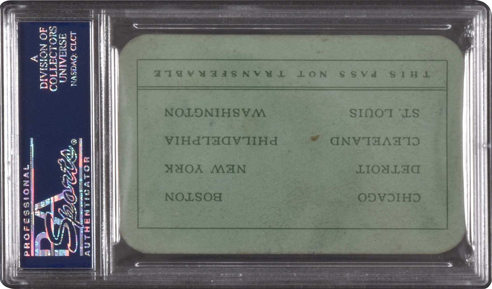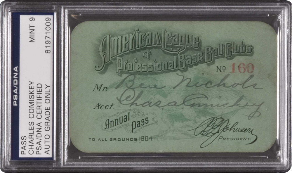 Early American League pass, issued for the 1904 season, signed in black fountain pen on the front by White Sox owner Charles Comiskey. PSA/DNA has encapsulated the pass and graded the signature MINT 9. This is the only 1904 American League season pass we have ever seen and we are aware of just one example that predates it (1903). The fact that this particular pass was issued and signed by Charles Comiskey only adds to its significance. The green pass, printed on cardboard stock, is numbered "160" and features the preprinted lettering "American League Professional Base Ball Clubs - Annual Pass - To All Grounds 1904." The stamped, facsimile signature of American League president Ban Johnson appears at the base. The name of the recipient, "Ben Nichols," is handwritten in black ink directly above Comiskey's signature, upon whose account the pass was issued. The reverse features the names of each American League City, as well as the admonishment that "This Pass Is Not Transferable." The pass (3.75 x 2.25 inches) displays light handling wear and is in Excellent condition overall. Reserve $500. Estimate (open).