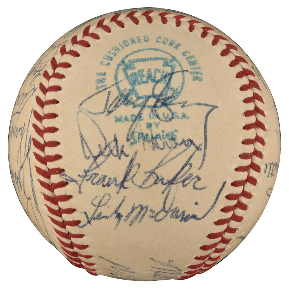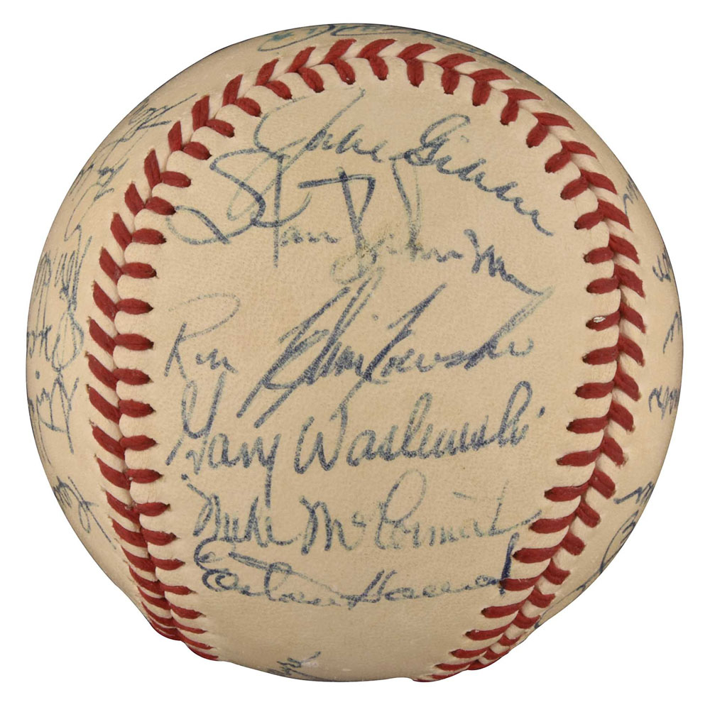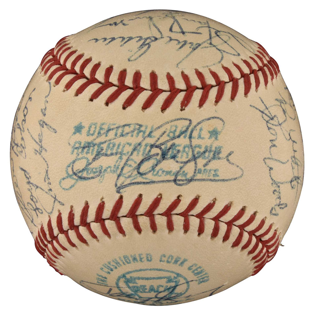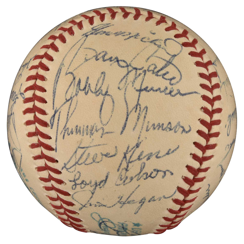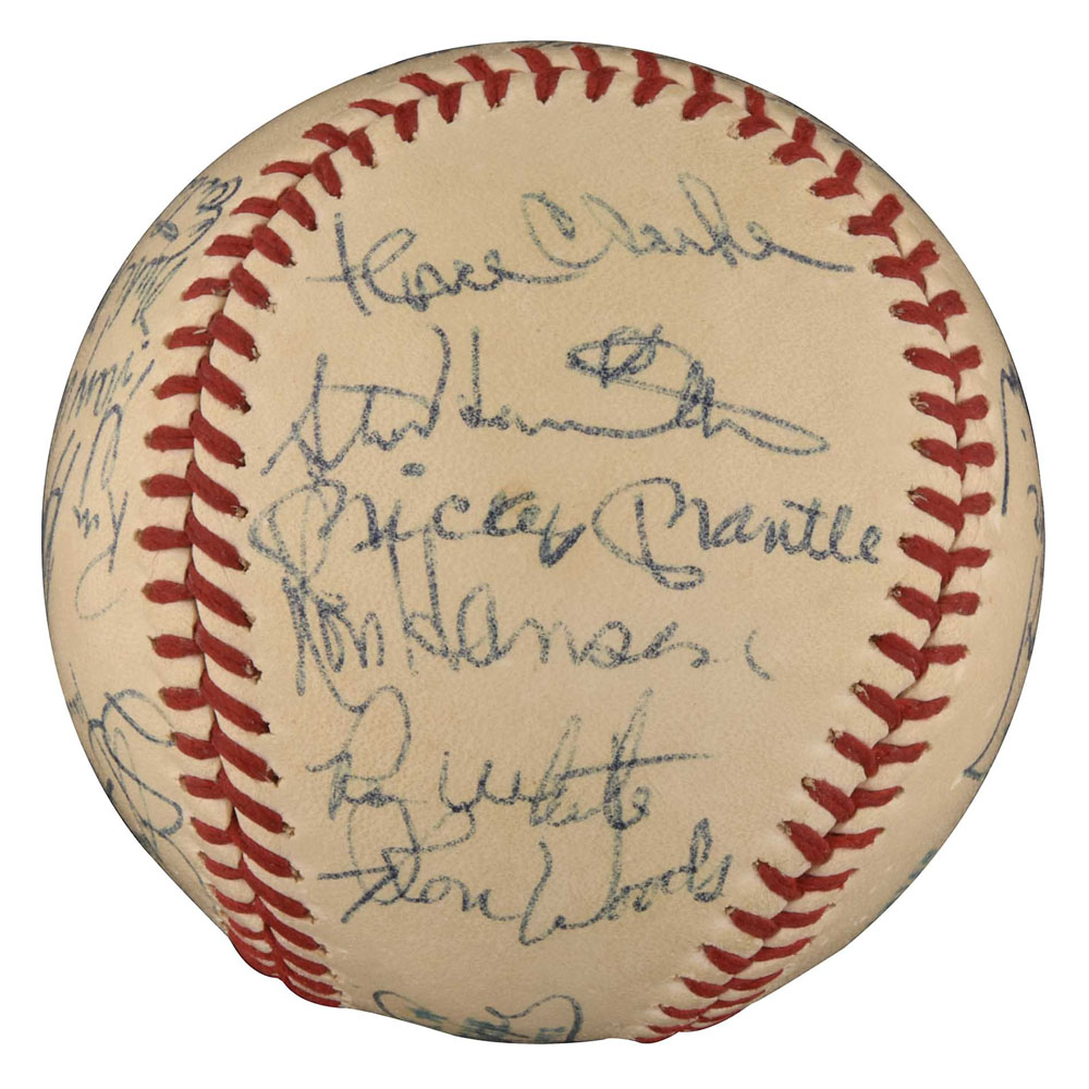 Exceedingly rare high-grade 1970 New York Yankees team-signed ball featuring the signatures of both Thurman Munson and Mickey Mantle, who was serving briefly as the Yankees first base coach at the time. Graded NM+ 7.5 by PSA/DNA (the signatures grade NM-MT 8 overall; the ball grades NM 7; resulting in an overall grade of NM+ 7.5). What makes this ball so rare is that Mantle was an official coach with club for only one month. Mantle began the 1970 season working as an announcer for the club, but on August 30th he joined Ralph Houk's staff as first base coach. It took Mantle just one month to realize that coaching was not in his future and he respectfully retired as an official coach at the end of the season (he would still serve as a special coach during spring training over the next decade or two). This is the first 1970 New York Yankees team ball we have ever seen that includes Mantle and the fact that it is a high-grade example makes it especially significant. The official American League (Cronin) ball has been signed in blue ink by the following 26 team members: Mantle (coach), Munson, Murcer, Stottlemyre (sweet spot), Keckich (sweet spot), Kline, Cater, Colson, Hegan (coach), Blefary (on ball label), White, Hansen, Hamilton, Clarke, Howser (coach), McDaniel, McCormick, Howard (coach), Bahnsen, Gibbs, Michael, Kenny, Woods, Waslewski, Klimkowski, and Baker. It's interesting to note that Steve Hamilton was selected off waivers by the Chicago White Sox on September 9th, which means that this ball was signed sometime during the ten-day period August 30th to September 9th. Full LOA from PSA/DNA. Pre-certified by Steve Grad and Brian Sobrero/Beckett Authentication Services. Reserve $300. Estimate (open).