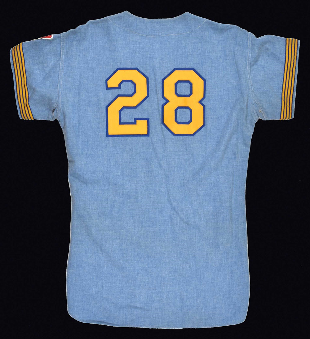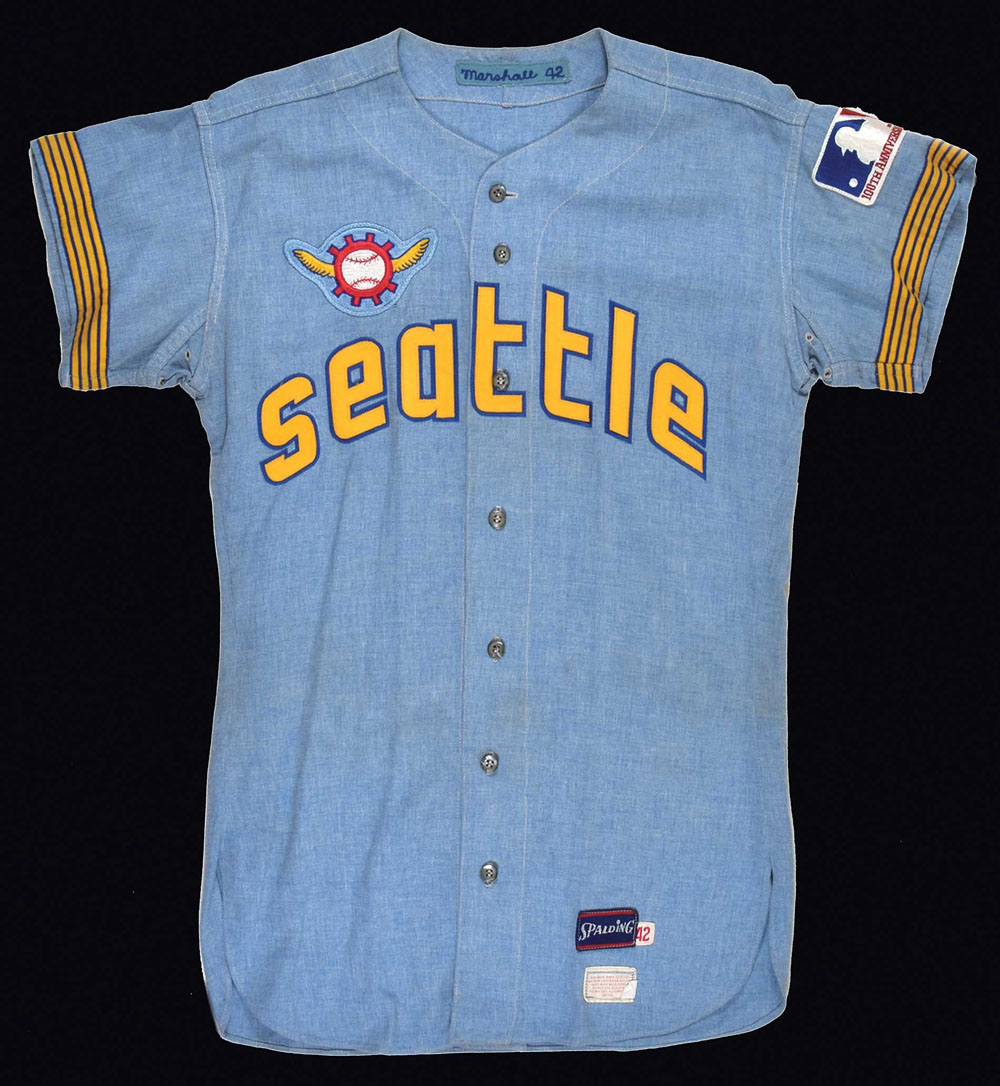 Rare 1969 Seattle Pilots road jersey worn by former National League Cy Young Award winner Mike Marshall during the club's one and only season. The blue flannel jersey is lettered "Seattle" across the front and features the club’s embroidered logo patch on the right breast. The number "28" appears on the reverse. All letters and numerals are appliquéd in gold on blue tackle twill. A Major League Baseball "100th Anniversary" patch adorns the left sleeve. The player's name and jersey size ("Marshall 42") are chain-stitched in blue upon a blue strip tag in the collar. Located on the left front tail are a "Spalding" label, an adjacent "42" size tag, a laundry tag, and a flag tag reading "Set 1 1969." All of the letters and numerals on the front and back, including the front logo patch, as well as the 100th Anniversary patch on the left sleeve have been restored. The name tag in the collar and the tagging/labels on the left front tail are all original. Light wear is displayed throughout.