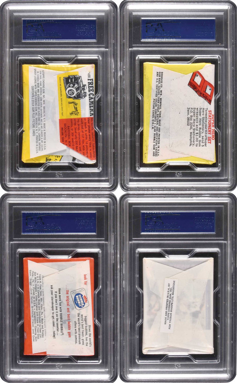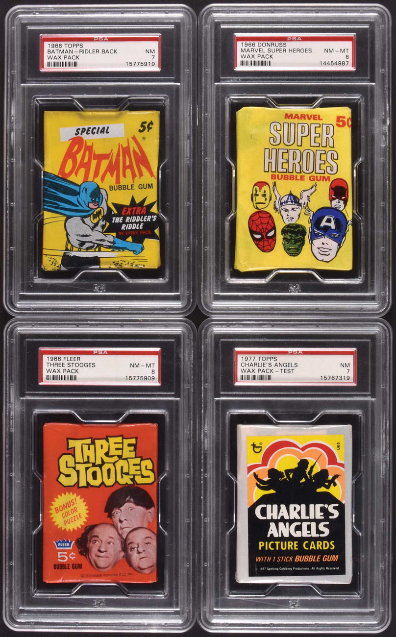 Extremely attractive collection of vintage entertainment- and T.V. show-themed nonsport unopened wax packs. Each pack has been graded and encapsulated by PSA as NM-MT 8 (3) or NM 7 (2), and is clean, with vibrant colors, a tight factory seal along the back, and only very minor wear. The packs feature photos or colorful illustrations related to their respective series and subject matter. Issued in the 1960s (except for the 1977 Topps Test Charlie's Angels pack), these classic sets produced by Donruss, Fleer and Topps were very popular with youngsters in that era. Included are the following unopened packs: 1) 1965 Donruss "Disneyland" five cents wax pack (NM-MT 8). 2) 1966 Donruss "Marvel Super Heroes" five cents wax pack (NM-MT 8). 3) 1966 Fleer "Three Stooges" five cents wax pack (NM-MT 8). 4) 1966 Topps "Batman - Riddler Back" series five cents wax pack (NM 7). 5) 1977 Topps Test Charlie's Angels wax pack (NM 7, white "test" wrapper with illustrated label). There is a printed notation "UK:3" at the upper right of the front label of the Charlie's Angels pack, as well as a reference to Trebor Sharps Ltd., Maidstone on the sticker/seal on the reverse, implying that this was likely a Test pack for the UK market. We are unable to determine if the cards inside are the standard U.S. versions, or what series they may be from. While it is impossible to provide guarantees with reference to grading of unopened material, there is, of course, the very real possibility that within these packs are high-grade cards from these popular nonsport series. With the exception of the Topps Test pack, the other packs appear almost exactly as they did on store shelves over fifty years ago! This collection of vintage packs would make an outstanding addition to any entertainment, nonsport, or unopened pack collection. Reserve $300. Estimate (open).