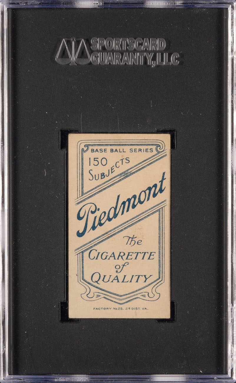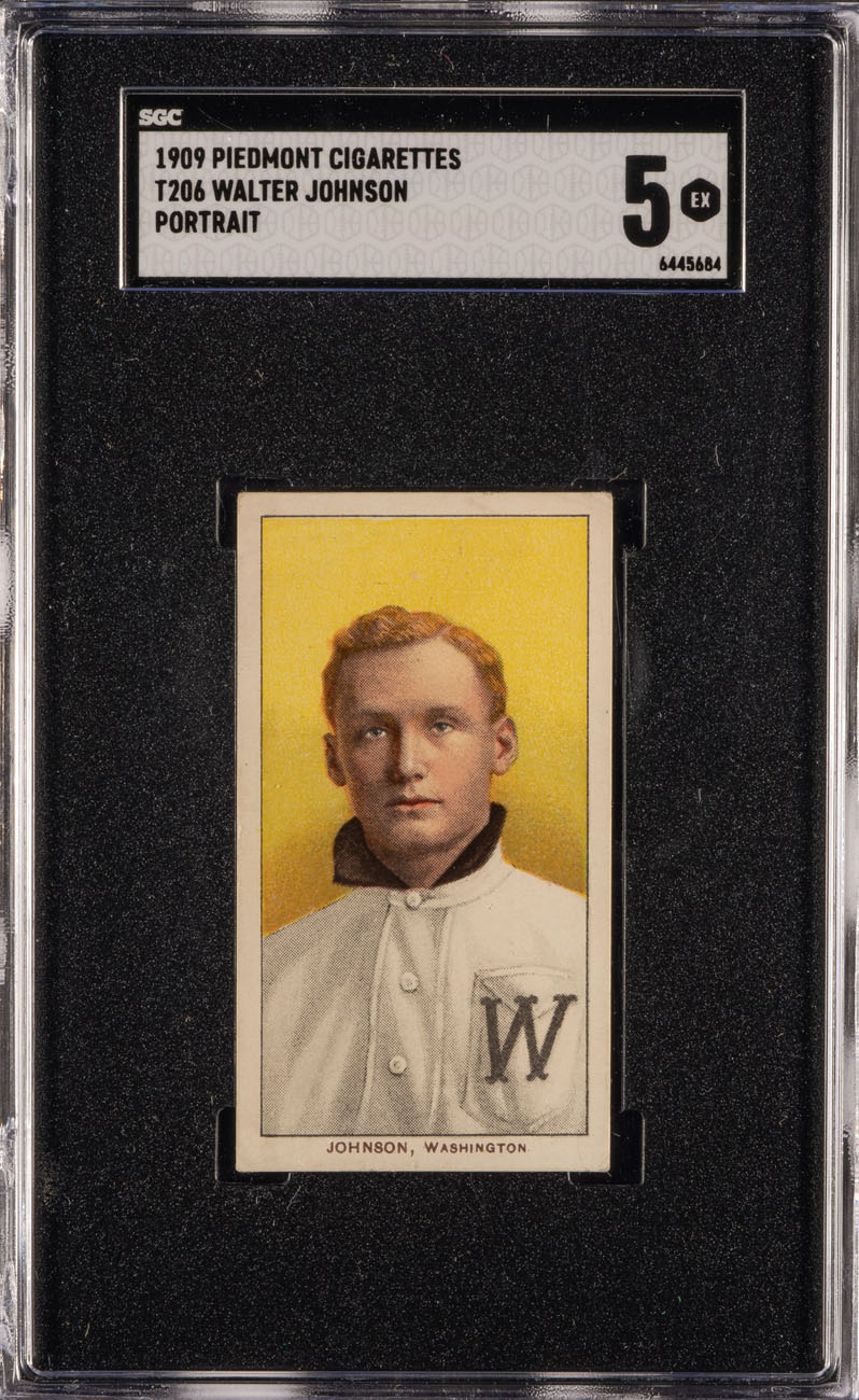 Graded EX 5 by SGC. Extremely attractive high-grade example of one of the hobby's most classic cards. T206 Walter Johnson portrait is one of the most famous of all vintage baseball cards. This card is widely recognized to be among Walter Johnson's most striking cards. In fact, the majestic portrait of Johnson on this card is considered by many advanced collectors to be the single best image of Walter Johnson to appear on any baseball card. The card is crisp and clean, with bold colors and a bright yellow background. It is well centered with four strong corners (slightly more in the lower right). The Piedmont 150 advertising on the back is boldly printed. This is an exceptional card in an extremely desirable grade, and would be a worthy addition to any T206, Walter Johnson, or classic Hall of Fame card collection. Reserve $1,000. Estimate $2,000+.