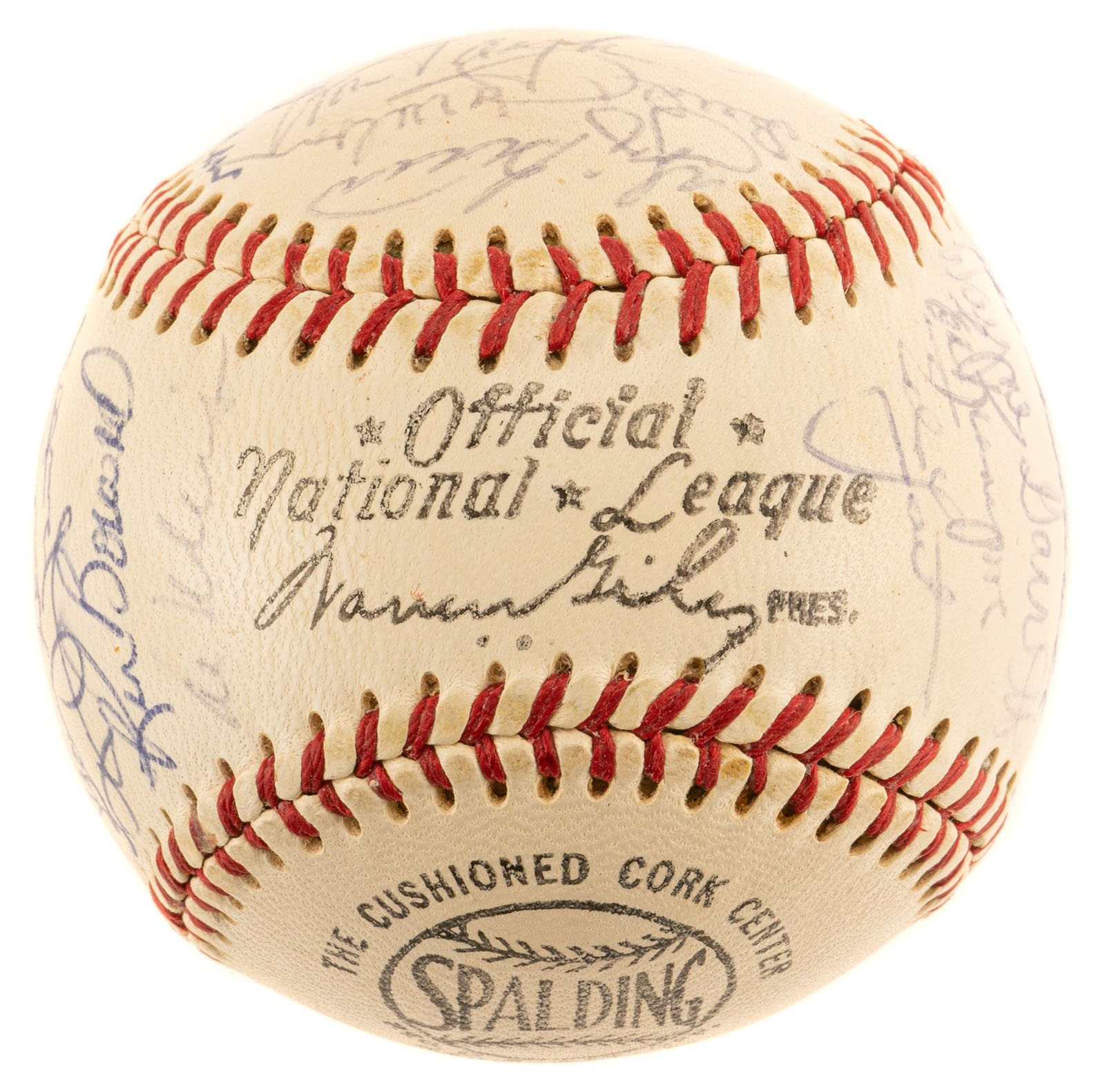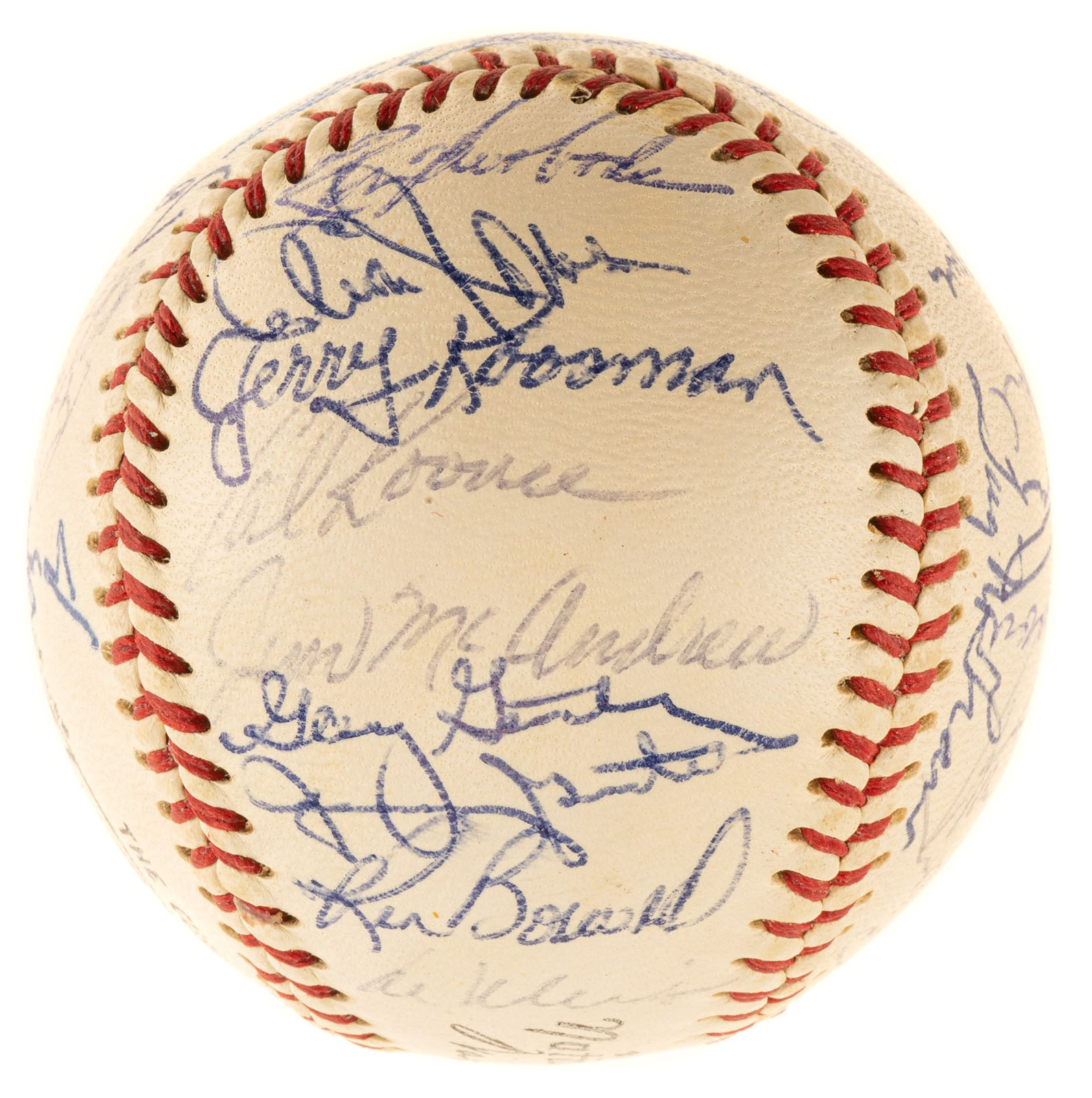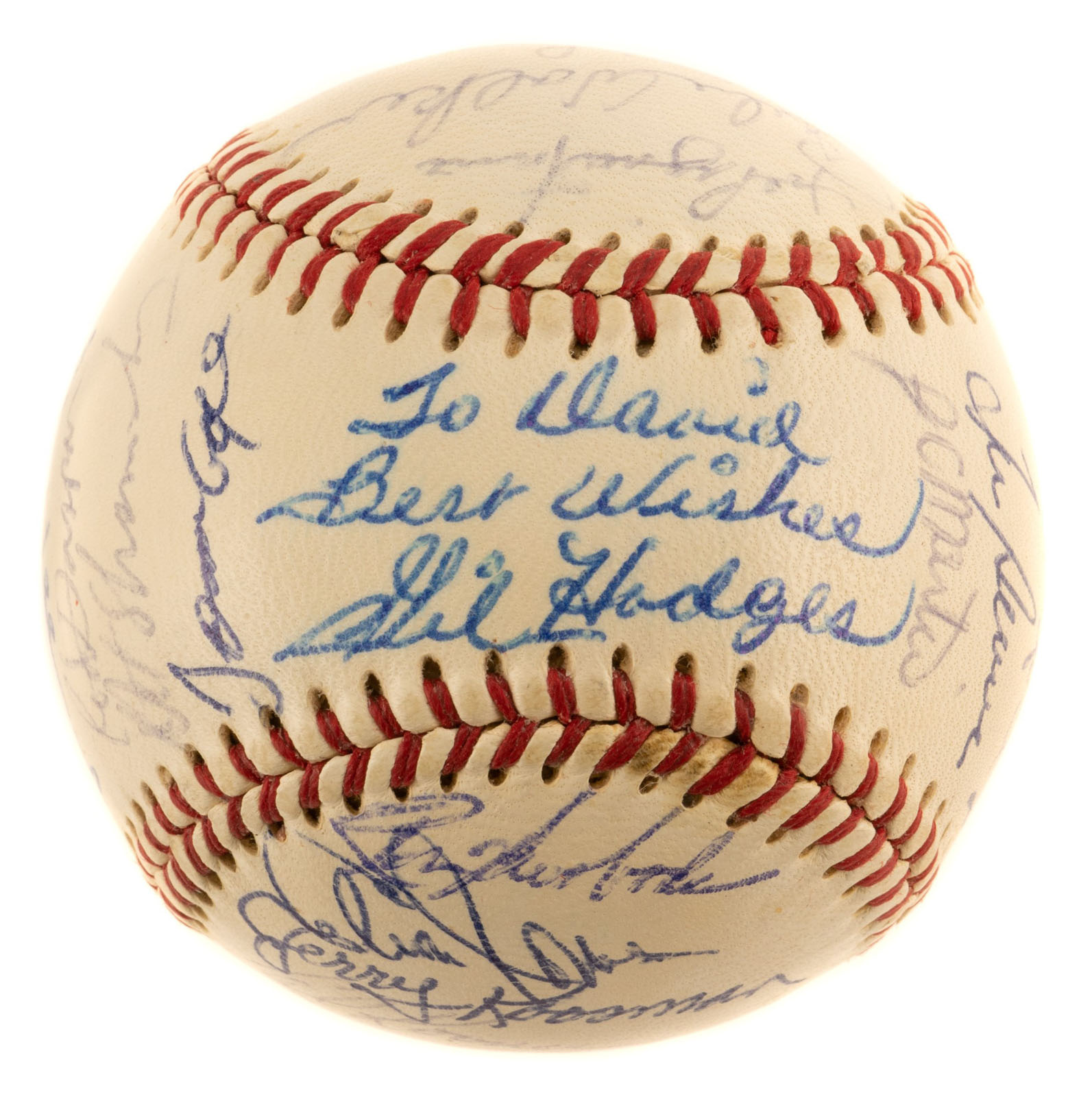 Official National League (Giles) ball signed in blue ink by 31 members of the 1969 World Champion New York Mets. Graded NM-MT+ 8.5 by PSA/DNA (PSA/DNA has graded the signatures NM-MT 8 and the ball NM-MT 8, resulting in an overall grade of NM-MT+ 8.5. As noted in its accompanying letter, PSA/DNA can add or subtract a half point from the average of the two grades based upon eye appeal.) This is one of the finest 1969 New York Mets team-signed balls we have ever seen. Most significant is the presence of Manager Gil Hodges' signature on the ball. 1969 New York Mets team-signed balls featuring authentic Gil Hodges signatures are the rare exception rather than the rule, making this an especially highly prized example dating from the most memorable season in franchise history. In fact, most 1969 Mets team balls are actually reunion balls, dating from decades after the 1969 season, which, of course, do not include Hodges. This is a rare and ideal original dating from 1969. Hodges has personalized the ball on the sweet spot "To David/Best Wishes/Gil Hodges." The remaining 30 signatures on the ball are those of Seaver, Berra (coach), Ryan, Dyer, Gaspar, Shamsky, Agee, Swoboda, Jones, Koosman, Koonce, McAndrew, Gentry, Grote, Boswell, Weiss, Harrelson, Hunt, Clendenon, Pfeil, Martin, McGraw, Pignatano, Walker (coach), Dilauro, Charles, Cardwell, Garrett, Kranepool, and Yost (coach). Full LOA from PSA/DNA. Reserve $500. Estimate $1,000+.