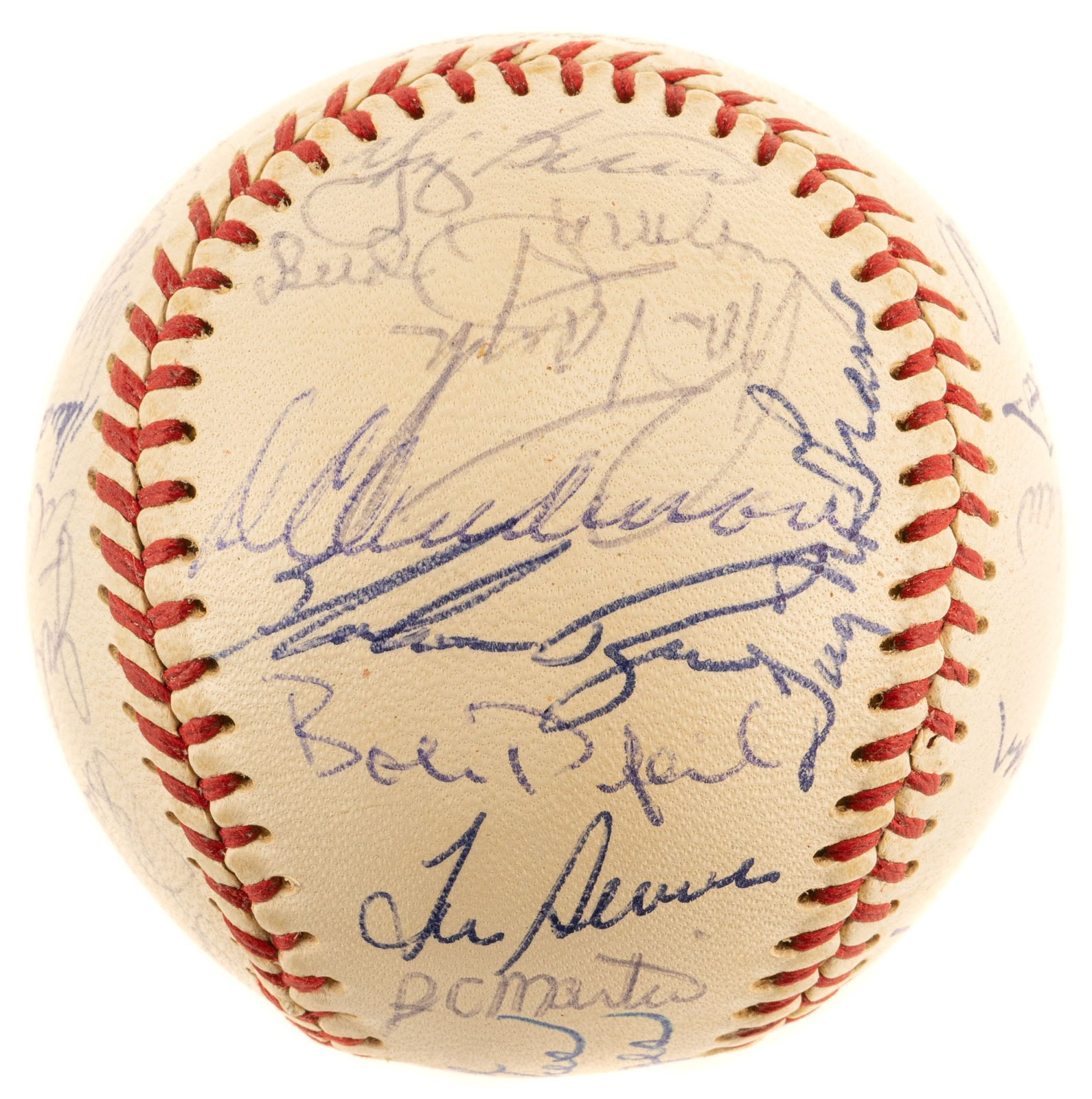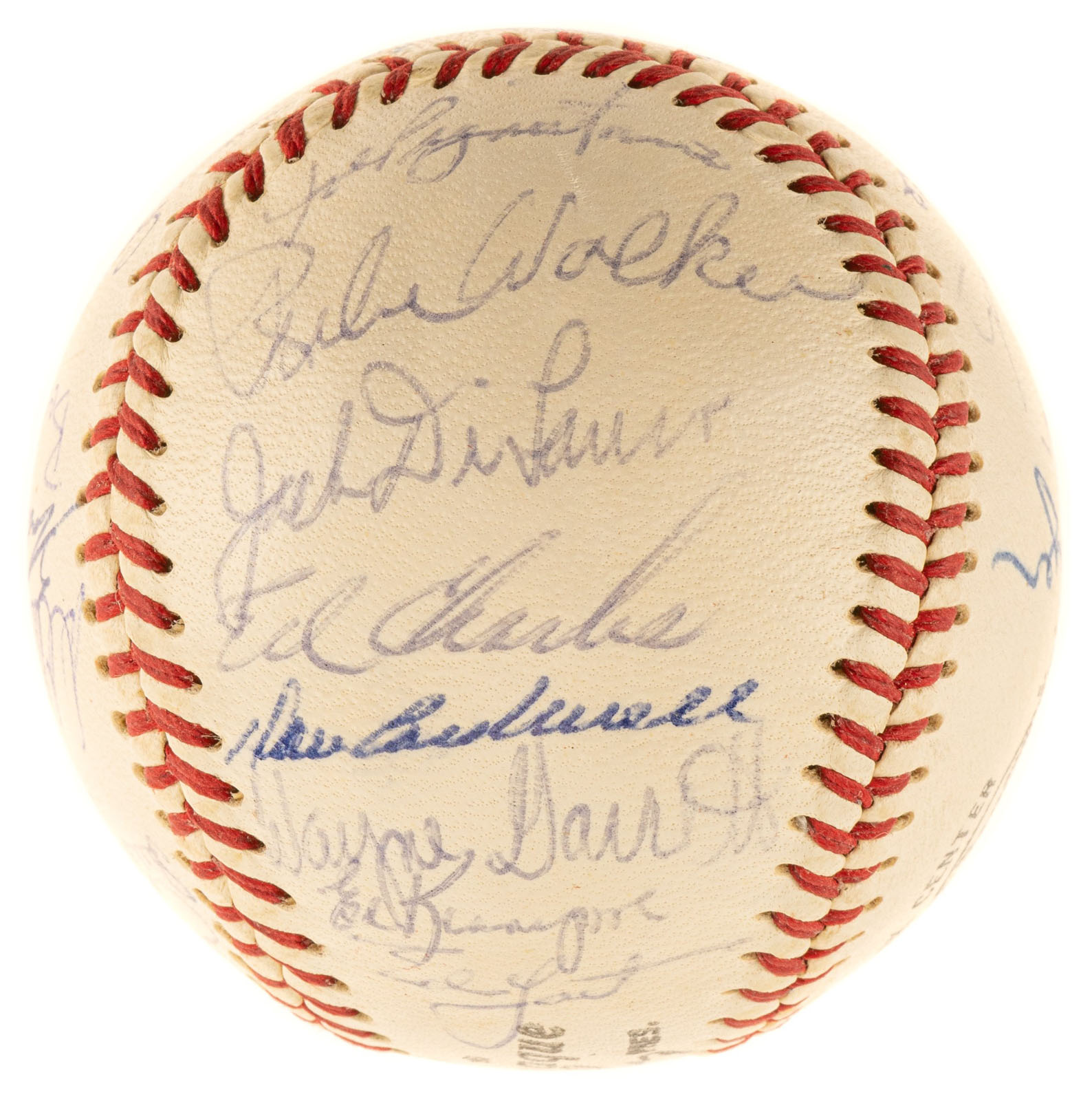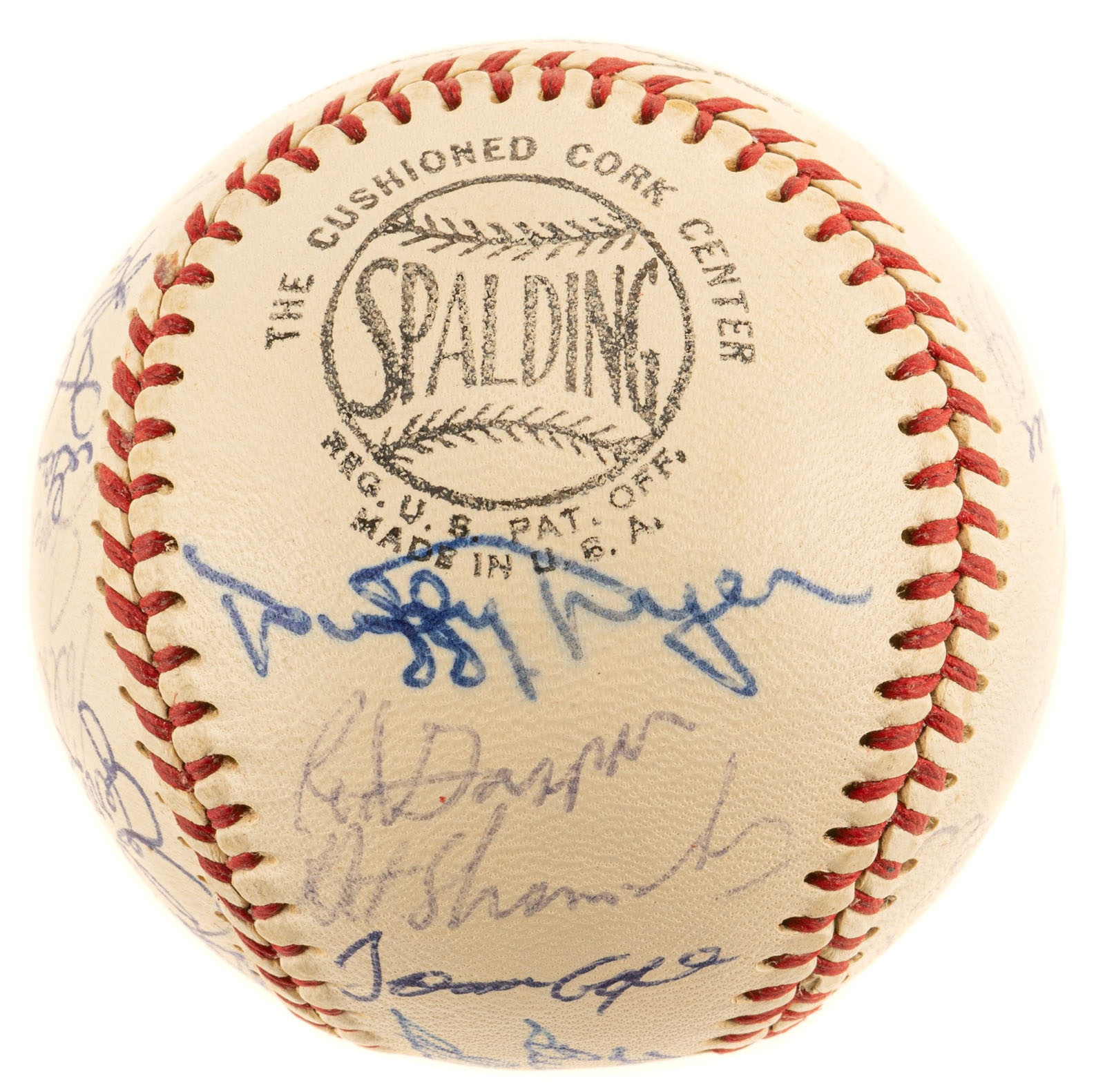 Official National League (Giles) ball signed in blue ink by 31 members of the 1969 World Champion New York Mets. Graded NM-MT+ 8.5 by PSA/DNA (PSA/DNA has graded the signatures NM-MT 8 and the ball NM-MT 8, resulting in an overall grade of NM-MT+ 8.5. As noted in its accompanying letter, PSA/DNA can add or subtract a half point from the average of the two grades based upon eye appeal.) This is one of the finest 1969 New York Mets team-signed balls we have ever seen. Most significant is the presence of Manager Gil Hodges' signature on the ball. 1969 New York Mets team-signed balls featuring authentic Gil Hodges signatures are the rare exception rather than the rule, making this an especially highly prized example dating from the most memorable season in franchise history. In fact, most 1969 Mets team balls are actually reunion balls, dating from decades after the 1969 season, which, of course, do not include Hodges. This is a rare and ideal original dating from 1969. Hodges has personalized the ball on the sweet spot "To David/Best Wishes/Gil Hodges." The remaining 30 signatures on the ball are those of Seaver, Berra (coach), Ryan, Dyer, Gaspar, Shamsky, Agee, Swoboda, Jones, Koosman, Koonce, McAndrew, Gentry, Grote, Boswell, Weiss, Harrelson, Hunt, Clendenon, Pfeil, Martin, McGraw, Pignatano, Walker (coach), Dilauro, Charles, Cardwell, Garrett, Kranepool, and Yost (coach). Full LOA from PSA/DNA. Reserve $500. Estimate $1,000+.