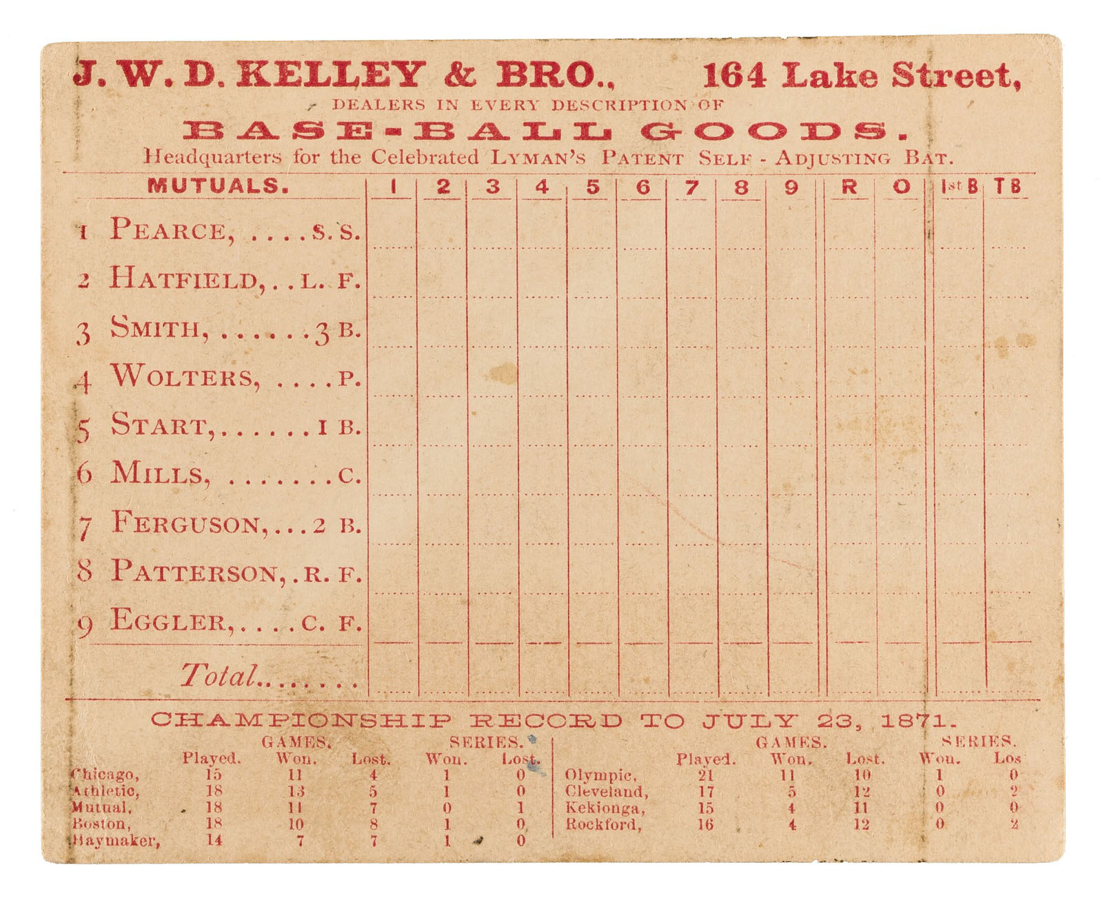 Rare National Association inaugural-season scorecard issued for a game between the Chicago White Stockings and New York Mutuals held at the Union Grounds in Chicago on July 28, 1871. The preprinted lineups include Jimmy Wood, Fred Treacy, Ed Pinkham, Ed Duffy, Marshall King, and George Zettlein for Chicago, and Dickey Pearce, Bob Ferguson, Joe Start, Dave Eggler, Rynie Wolters, Charlie Smith, and John Hatfield for New York. The scorecard, which is a single unfolded card, printed on both sides, has not been scored. Despite not having been scored, the offered scorecard can be conclusively dated to the July 28th game between the clubs because the league standings "to July 23, 1871" are printed along the base of each side. The next game for the White Stockings following that date was July 28th against the Mutuals. Research indicates that the White Stockings won the game on that date by a score of 17-6. The National Association, which was founded in 1871, was baseball's first professional league. Any items relating to that inaugural campaign are rare and scorecards are no exception. This is just the second example we have ever offered and we have seen only a few others. The White Stockings and Mutuals remained in the National Association during the league's short five-year existence and both were charter members of the National League in 1876. The Mutuals later folded, but the White Stockings franchise survives to this day as the Chicago Cubs, thereby making this one of the oldest known scorecards issued by the club. The scorecard (4.25 x 3.5 inches) displays a few minor surface blemishes on each side and is in Excellent condition overall. Reserve $500. Estimate (open).