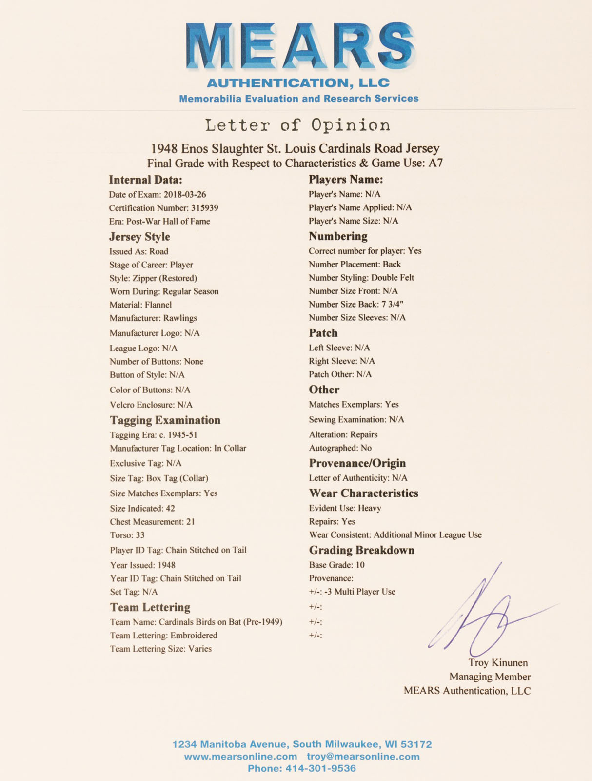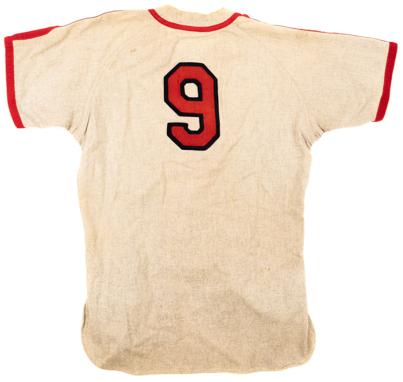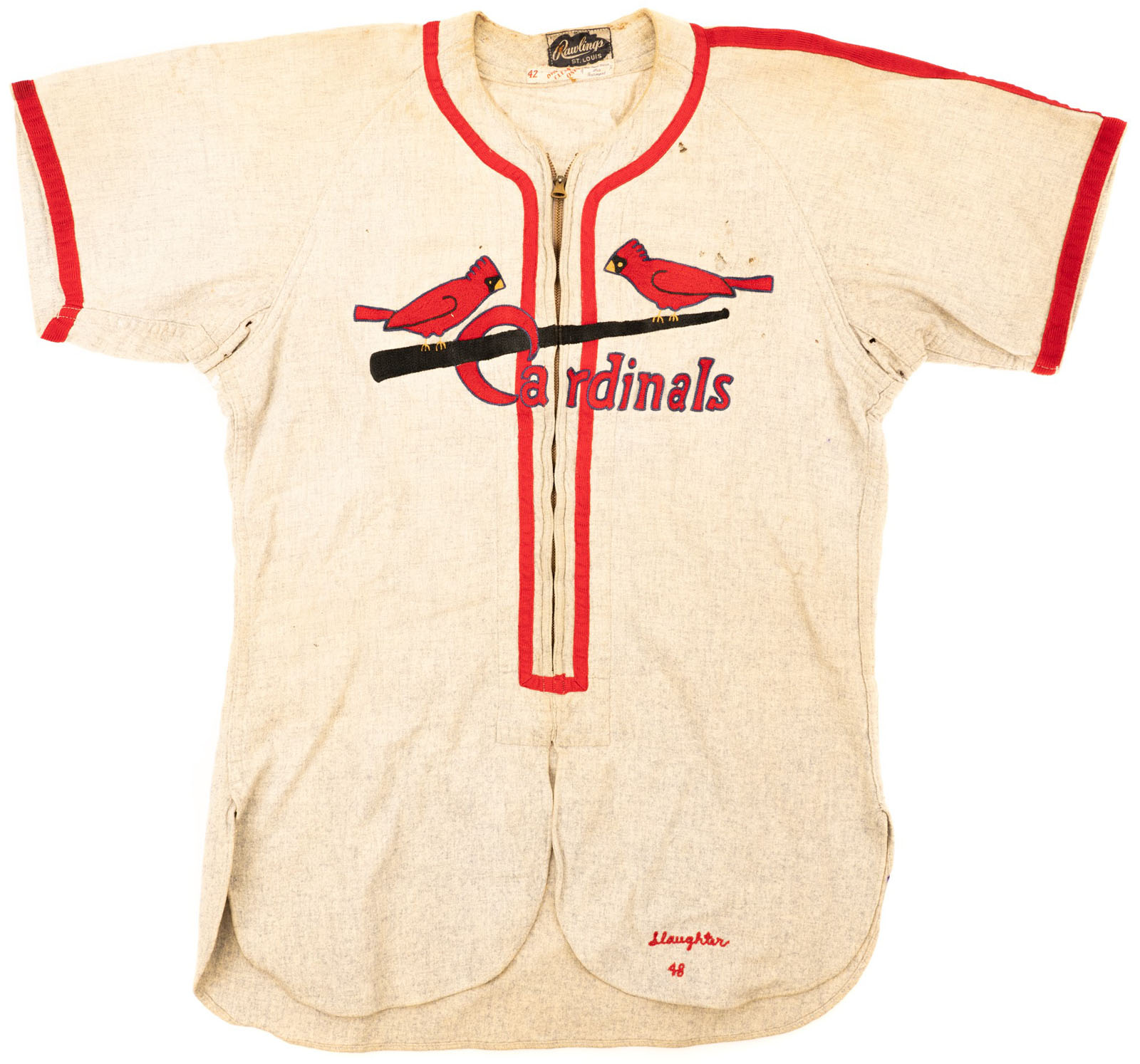 St. Louis Cardinals jersey worn by Hall of Fame outfielder Enos Slaughter during the 1948 season. Graded A7 by MEARS. The gray flannel zipper-front jersey features the team name "Cardinals" embroidered on the front, above which is displayed the club's distinctive logo of two cardinals perched upon a bat. The number “9" is appliquéd on the reverse in red on navy felt. Both the name, "Slaughter," and the year, "48," are chain-stitched in red along the left front tail. Situated in the collar are a "Rawlings" label, a "42" size tag, and a laundry tag. The zipper is fully functional but appears to be a vintage replacement. Other than that, the jersey is original as issued, with no other alterations. Heavy wear is exhibited throughout, including three team-repaired tears on the reverse, light soiling, and a number of insect holes front and back, the largest of which occupy the area of the left breast. This jersey was later sent to one of the Cardinals' minor-league affiliates following the 1948 season and is accompanied by a letter of provenance signed by the daughter of the minor league player to whom it was issued. 1948 was also the last year in which the Cardinals wore this particular style of jersey, as the front logo changed slightly the next year. Enos "Country" Slaughter enjoyed a banner season in 1948, finishing the year with a .321 batting average, 11 home runs, and 90 RBI. Those numbers helped earn him a third-place finish in the National League MVP Award voting at season's end. Although best known today for his "Mad Dash" in the 1946 World Series that helped St. Louis defeat Boston, Slaughter was an accomplished hitter and finished his nineteen-year career with a .300 lifetime average and 2,383 hits (despite missing three full seasons due to military service during World War II). He was elected to the Hall of Fame in 1985. Slaughter's number "9" was retired by the St. Louis Cardinals in 1996. Graded A7 by MEARS (base grade of 10, with 3 points deducted for its use by another player in the minor leagues). Full LOAs from Troy Kinunen/MEARS and David Randolph and Bill Henderson/Sports Investors Authentication. Opening Bid $5,000. Estimate (open).