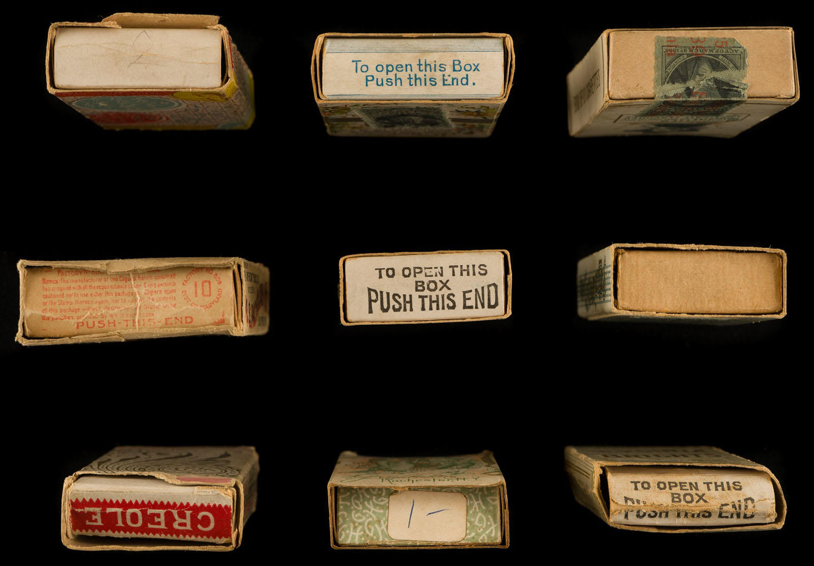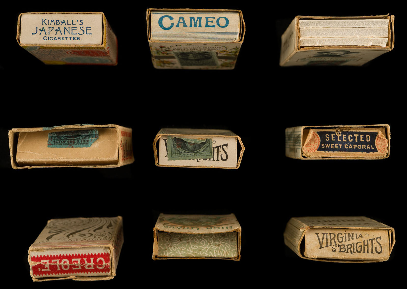 Outstanding collection of eleven nineteenth-century cigarette packages plus four coupons. Most of these unlikely survivors once housed a nonsports trading card along with a small group of cigarettes. Now empty, except for loose tobacco in one package, these packages are very attractive with stylish designs. This collection consists of the following: