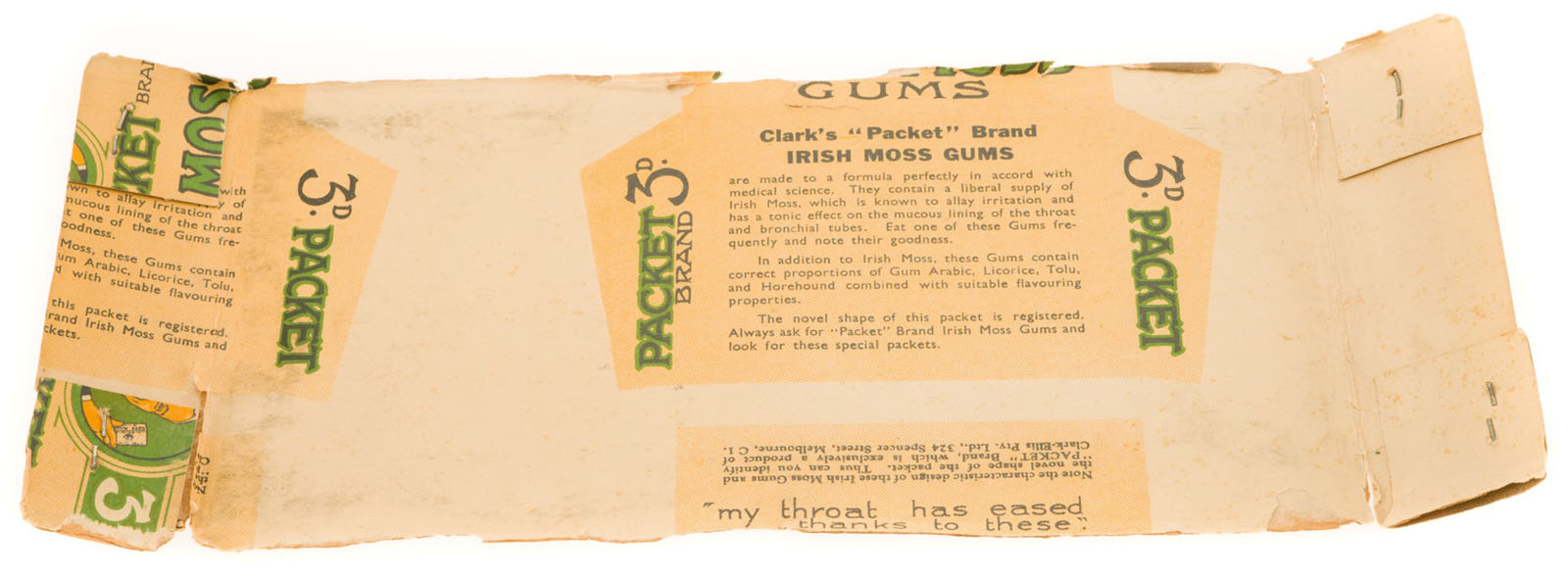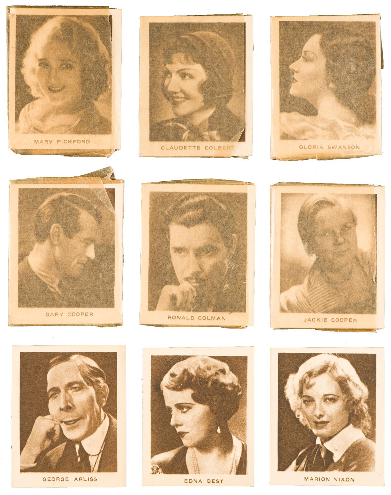 Near-complete box of 1934 Allen's Film Favourites Chewing Gum featuring 62 unopened packs. This an Australian issue and while we have seen a few card examples over the years, the original retail box is exceedingly rare, especially one filled with unopened packs. As noted on a side flap, a complete box consists of 72 packs. This box, along with other vintage gum boxes and gum-related material, were just recently discovered in a Midwest warehouse. Incredibly, our consignor, who was involved in the purchase of the building, rescued all of the material from a large trash bin. (The balance of that material, which we are calling "The Midwest Warehouse Find," is featured in 17 separate lots in this auction.) Each pack of gum, which is wrapped in clear wax paper, includes a card featuring an actor or actress. While most of the cards picture British or Australian celebrities, a number of well-known Hollywood stars are featured here, including Gary Cooper, Jeanette MacDonald, Claudette Colbert, Mary Pickford, Wallace Beery, Joan Blondell, Douglas Fairbanks, Jackie Cooper, Ronald Coleman, Helen Hayes, and Gloria Swanson. In addition to the 62 unopened packs, the box also includes three loose cards (George Arliss, Edna Best, and Marion Nixon). The cards, which are numbered, display a brief biography of the respective performer on the reverse, along with an advertisement for "Allen's Cure-'Em Quick." The cardboard marquee reads "Allen's Film Favourites Chewing Gum" and pictures Geo. Wallace and Sydney Fox. The box (4.5 x 8.5 x 1.5 inches) is heavily worn, with both side flaps missing from the lid. The interior of lid features advertising for "Clark's 'Packet' Brand Irish Moss Gums." Both an inventory number ("D-82-G") and date ("5-8-34") are written on the underside of the box. Please Note: the box is extremely brittle. REA will do our best to store and pack the box as safely as possible, but the buyer assumes the risk of further deterioration during shipping. Reserve $200. Estimate (open).