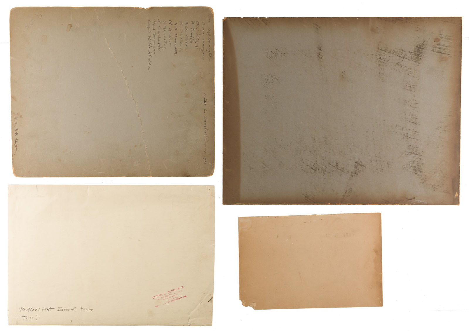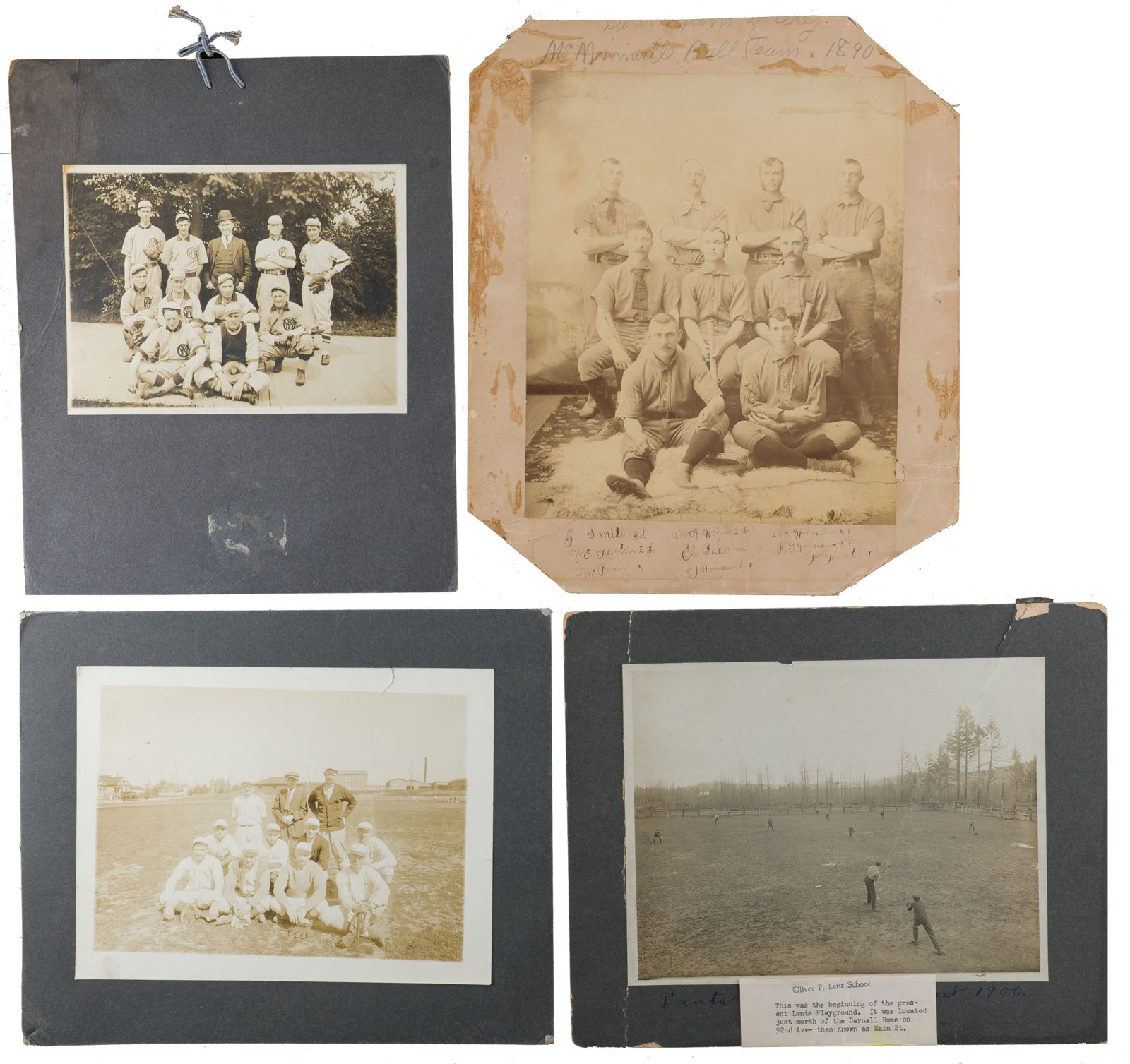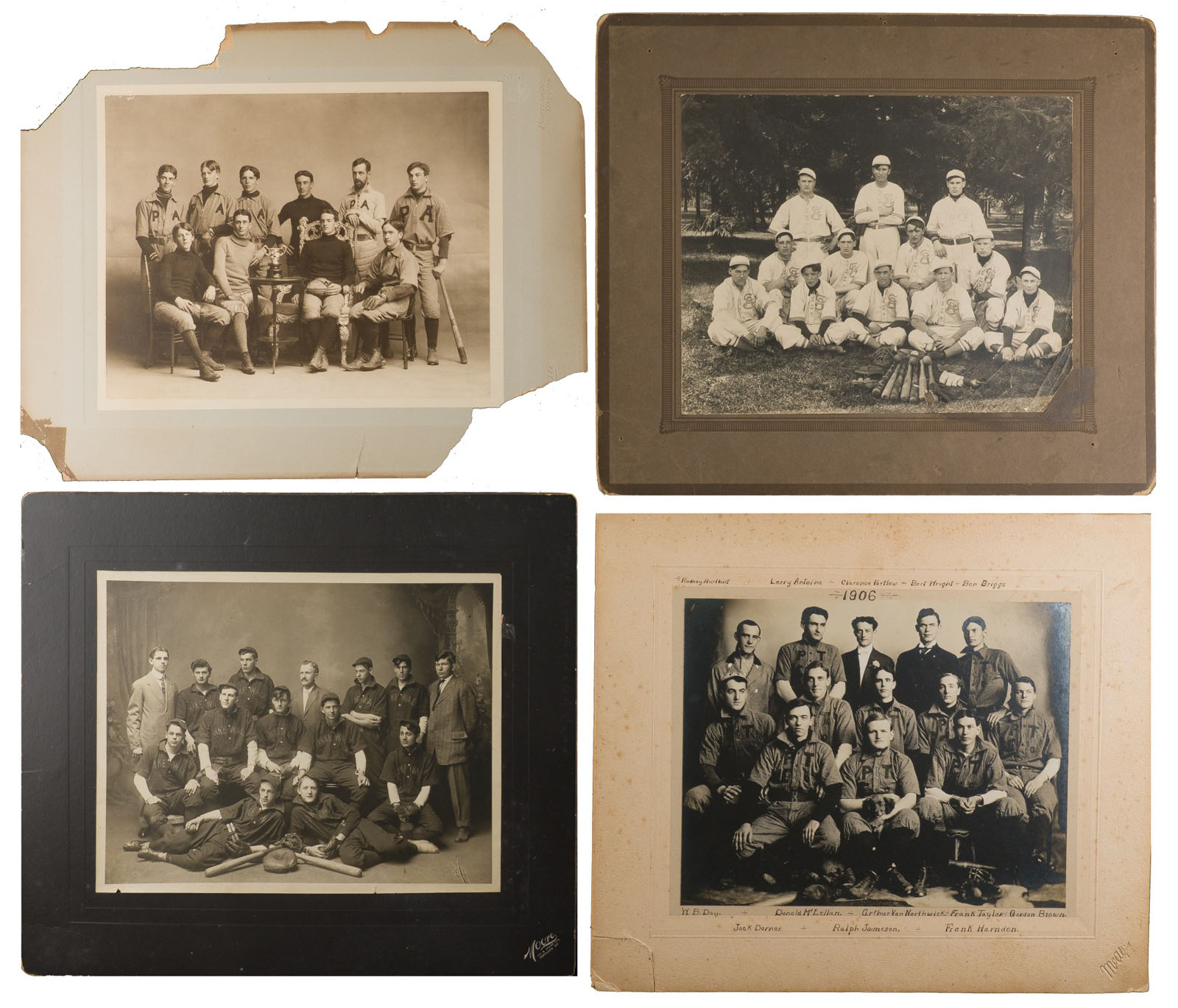 Collection of 25 vintage photographs, each capturing a different baseball team. While a few of these photos appear to date to the late nineteenth century, most are from the early 1900s. Like most photos of this type, not much is known about the clubs or players pictured, except that nearly all originate from the Pacific Northwest. A number of photos have handwritten team or player identifications on the reverse, but all appear to be town, semi-pro, or school teams. Twenty-three of the photos are affixed to heavy mounts. Among the most interesting scenes included here are a photo picturing a number of players congregating on the field, including an African-American player, a team posing with a trained bear, and a high-school team posing in studio, where one can clearly see a beautiful example of a Spalding "Wagon Tongue" bat in the hands of one of the players. The majority of the photos are in Excellent condition overall, but many of the mounts display significant flaws, including chipping, tears, and light staining. Sizes range from 6.5 x 5.5 inches to 13.75 x 12 inches (including the mounts). Total 25 photographs. Reserve $200. Estimate (open).