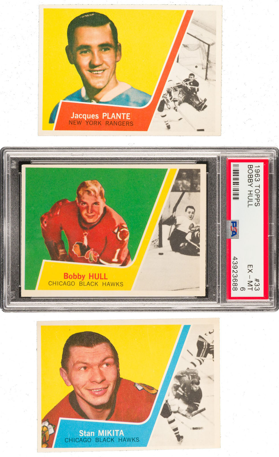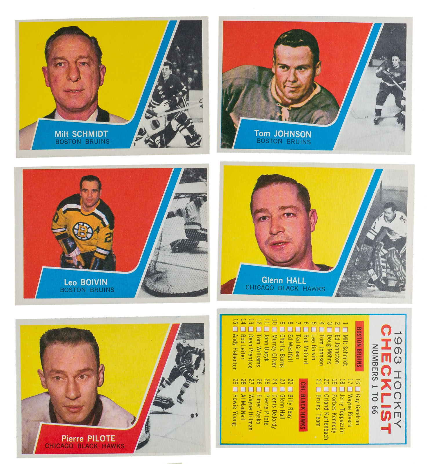Complete set of sixty-six cards from the 1963-1964 Topps Hockey series. The set is highlighted by many great stars of the era, including Hall of Famers Bobby Hull, Stan Mikita, and Jacques Plante. Condition is 24% Nr/Mt or slightly better, 76% Ex to Ex-Mt (including a couple slightly lesser). Keys: #1 Schmidt (Ex), 4 Johnson (Ex/Ex-Mt), 5 Boivin (80/20 L/R, otherwise Nr/Mt), 23 Hall (Ex-Mt), 25 Pilote (Ex), 33 Hull (EX-MT 6, submitted by REA), 36 Mikita (slight tilt, otherwise Nr/Mt), 45 Plante (Ex+), and 66 Checklist (Ex+). This is a very attractive complete set of this popular 1960s hockey set, loaded with stars and Hall of Famers. Total: 66 cards. Reserve $300. Estimate (open).