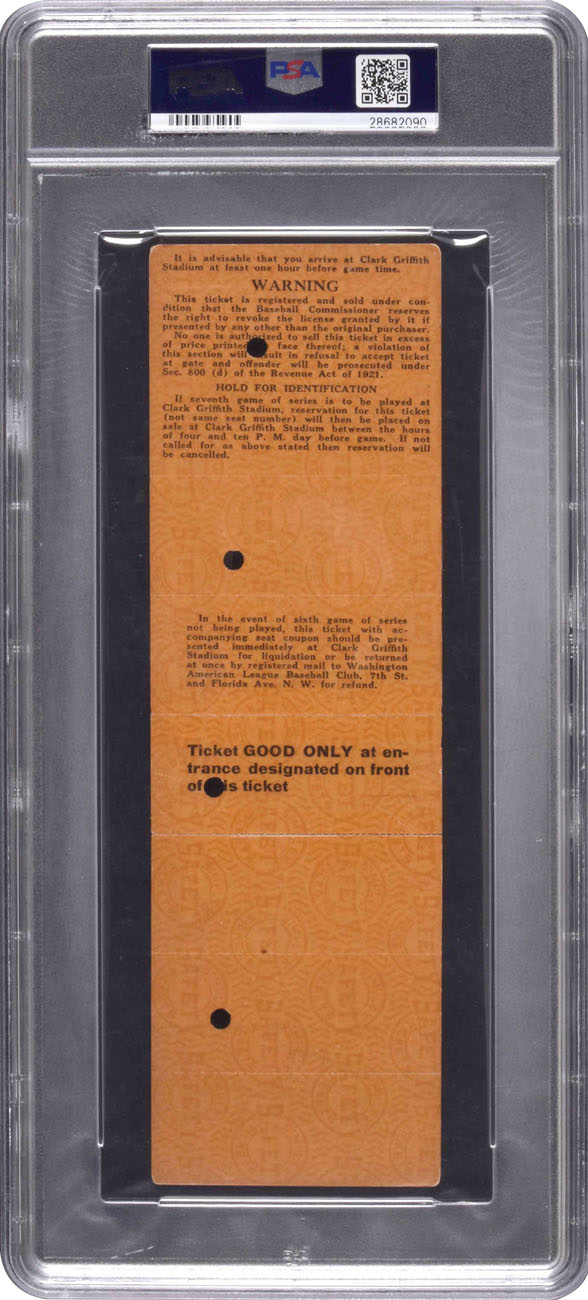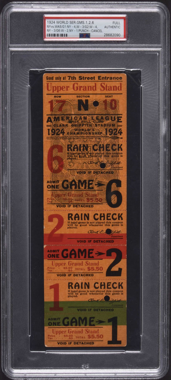 Uncut ticket sheet consisting of tickets for Game 1, 2, and 6 of the 1924 World Series scheduled to be played at Griffith Stadium in Washington, D. C. PSA has encapsulated the sheet and certified it as “Authentic.” This is one of five examples of this uncut ticket sheet evaluated by PSA, with only one having received a numerical grade. As noted on the reverse, if a Game 7 became necessary, a ticket for that game would be reserved for the purchaser of these three tickets and could be obtained (for an additional fee) by turning in the top segment of the sheet (above the Game 6 ticket). The Senators defeated the New York Giants in seven games in the 1924 fall classic, which gave Washington its first World Championship in franchise history. The ticket sheet (2.75 x 9 inches) displays four cancellation punches and is in Very Good condition overall, with a few light creases and minor edge wear. Reserve $300. Estimate (open).