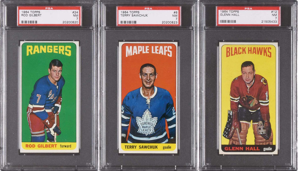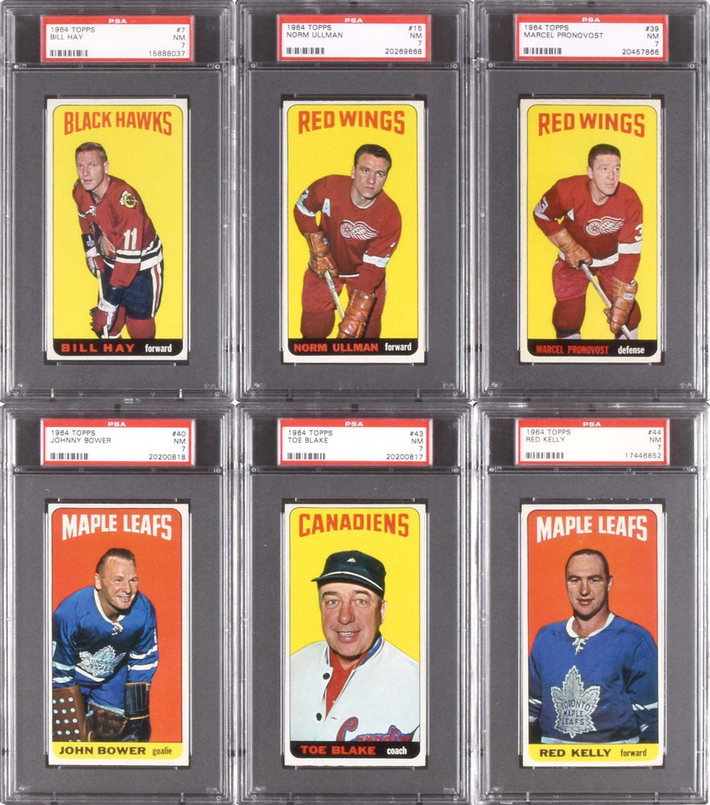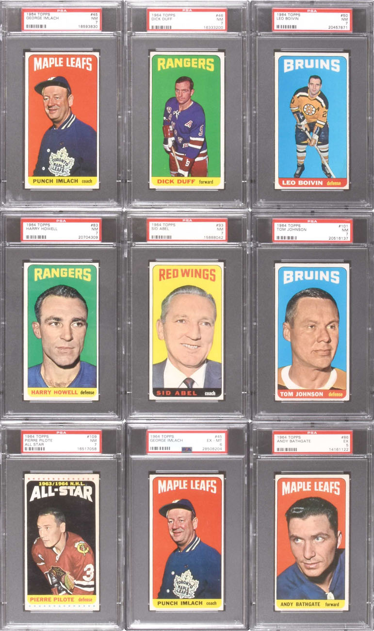 Spectacular high-grade partial set of 1964-1965 Topps Hockey, one of the most popular and classic of all hockey-card sets, consisting of sixty-two different cards (plus one duplicate) out of 110 in a complete set. Each card is graded NM 7 by PSA except for six slightly lesser as noted. Eighteen Hall of Famers highlight the offered collection. PSA Grading Composite: NM 7 (57 cards): #2-4, 6 Sawchuk (HOF), 7 Hay (HOF), 9-11, 12 Hall (HOF), 13, 15 Ullman (HOF), 16-19, 21-23, 24 Gilbert (HOF), 26-30, 32, 34-38, 39 Pronovost (HOF), 40 Bower (HOF), 41, 42, 43 Blake (HOF), 44 Kelly (HOF), 45 Imlach (HOF), 46 Duff (HOF), 47, 50 Boivin (HOF), 52, 57, 61, 64, 65, 75, 76, 79, 83 Howell (HOF), 87, 88, 90, 93 Abel (HOF), 97, 101 Johnson (HOF), 103 and 109 Pilote AS (HOF). EX-MT 6 (4 cards): #45 Imlach (HOF), 56, 66, and 81. EX 5 (2 cards): #14 and 86 Bathgate (HOF). The oversized design of the 1964-1965 Topps Hockey set makes this issue particularly susceptible to damage, and makes the assembly of high-grade sets all the more difficult. This is an exceptionally attractive high-grade partial set with tremendous eye-appeal across the board. A high-quality and very carefully assembled grouping from one of card collecting's most popular hockey issues. The SMR value in the assigned grades is $3,375. Total: 63 cards. Reserve $1,000. Estimate (open).