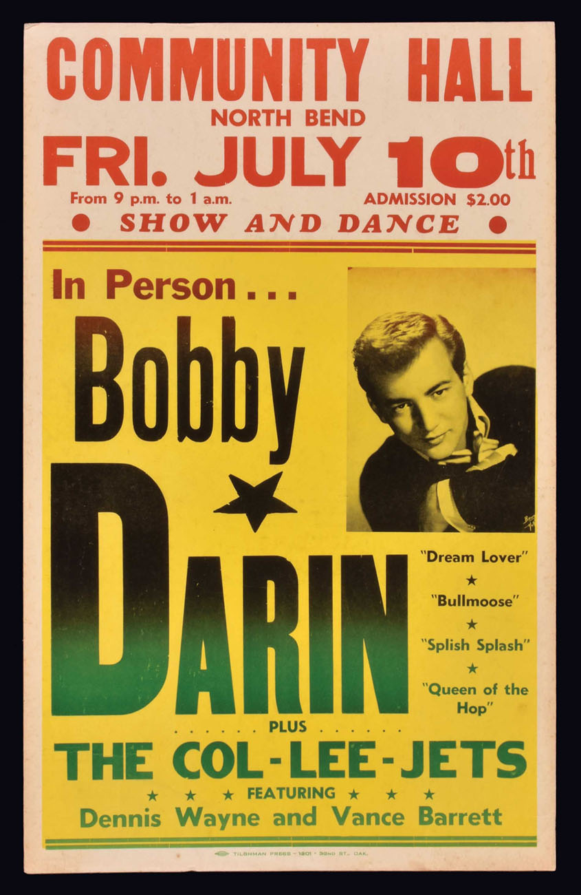 Concert poster heralding the appearance of Bobby Darin at the Community Hall in North Bend, Oregon, on Friday, July 10, 1959. The colorful design features a photo of Darin, plus a list of some of his hit songs: "Dream Lover," "Bullmoose," "Splish Splash," and "Queen of the Hop." The poster (14 x 22.25 inches) displays moderate handling wear, including light toning, slight creasing (mainly along the border and corner areas) and light foxing. In Very Good condition overall.