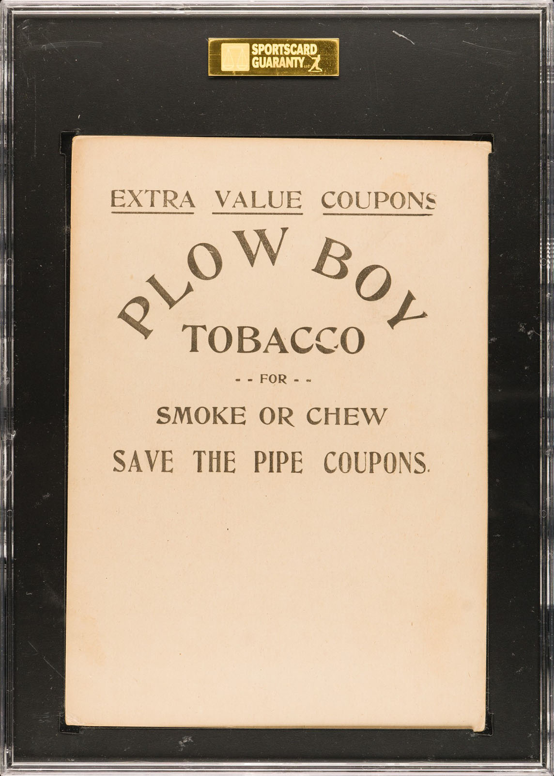 Graded GOOD 30 by SGC. Exceptional sample card of Ed Hahn from this unusual sepia-toned 1910 cabinet-card issue that features Cubs and White Sox players, issued by the Spaulding & Merrick Tobacco Company to promote its Plow Boy Tobacco brand. Their rarity is related to the fact that they were issued only in the Chicago area. Plow Boy Tobacco cards measure 5-3/4 x 8 inches. They are easily one of the rarest of all twentieth-century tobacco issues, and of additional note, these cards show players in poses that are unique to this set. Plow Boy Tobacco cards were issued with two different advertising reverses, one with a simple advertisement and another with the same advertisement along with a checklist of premiums available. The offered example features the advertising reverse without the premium checklist. The card displays a crisp image, with even wear on the corners, and a boldly printed advertisement on the reverse. Minor paper loss extending down the lower left edge accounts for the assigned grade. A superb example worthy of even the most advanced sample or prewar-card collection. Reserve $300. Estimate (open).