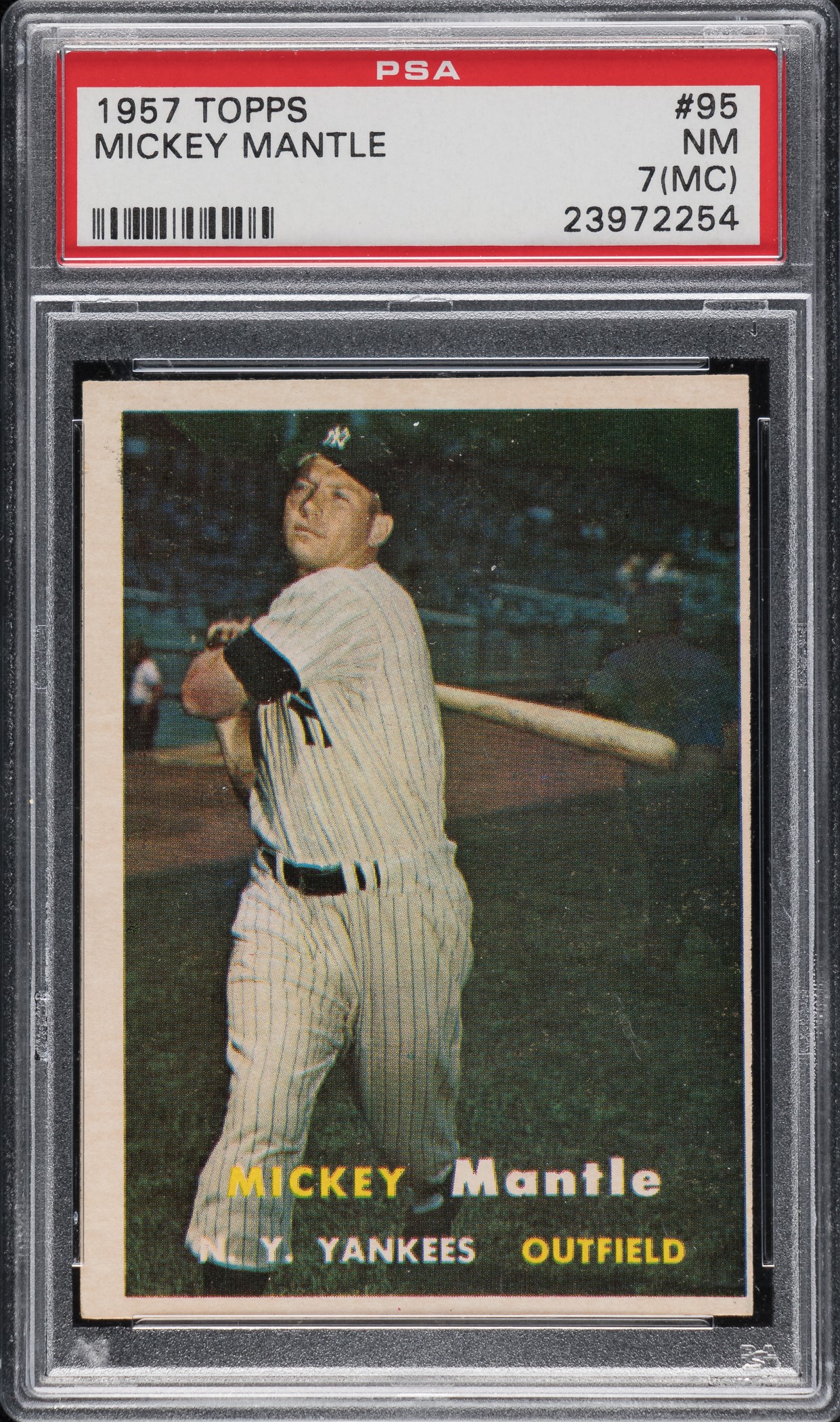 Graded NM 7 (MC) by PSA. High-grade example of what is universally recognized as one of Mantle's most classic cards. In addition to being one of Mantle's most striking and popular cards, this card dates from one of Mantle's MVP years and follows his finest season (1956 triple crown stats: 52 home runs, 130 RBI, .353 batting average). Getting this card in a pack in 1957 was as good as it got. The image used on the card features a young "Mick" in a mighty swing-through pose. This example boasts perfect registration, strong corners, a flawless surface, and centering toward the far right. The reverse is centered to the extreme bottom edge. The SMR lists a value of $600 for PSA EX 5, $800 for PSA EX-MT 6, and a value of $1,750 for PSA NM 7. This card is difficult to value in that we believe it is very accurately graded and, as stated by the label, it is in NM condition, yet it is appropriately qualified for centering. Whatever the value, this is a high-quality card of Mickey Mantle, the key card from the 1957 Topps set. Reserve $200. Estimate (open).