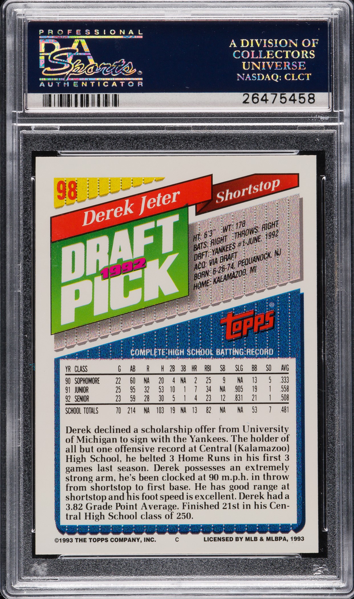 1993 Topps Inaugural Year Florida Marlins #98 Derek Jeter Rookie PSA GEM MINT 10
