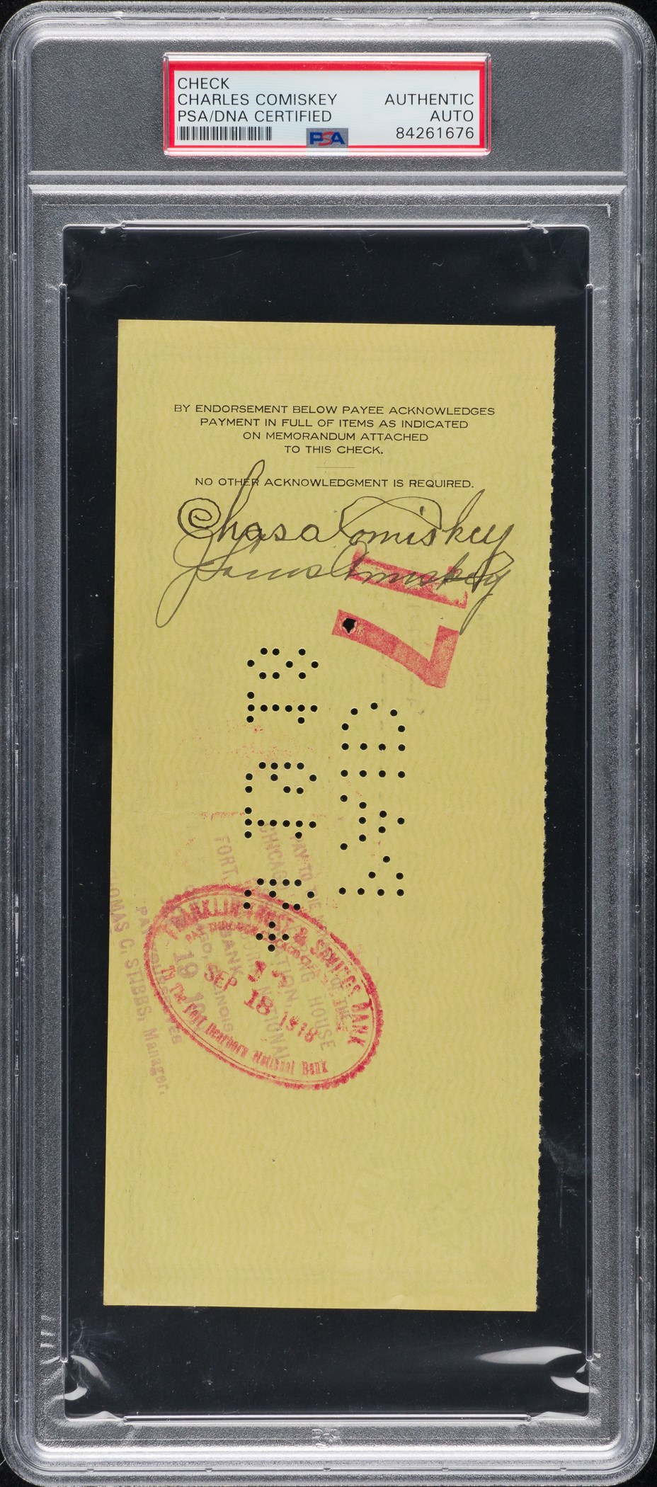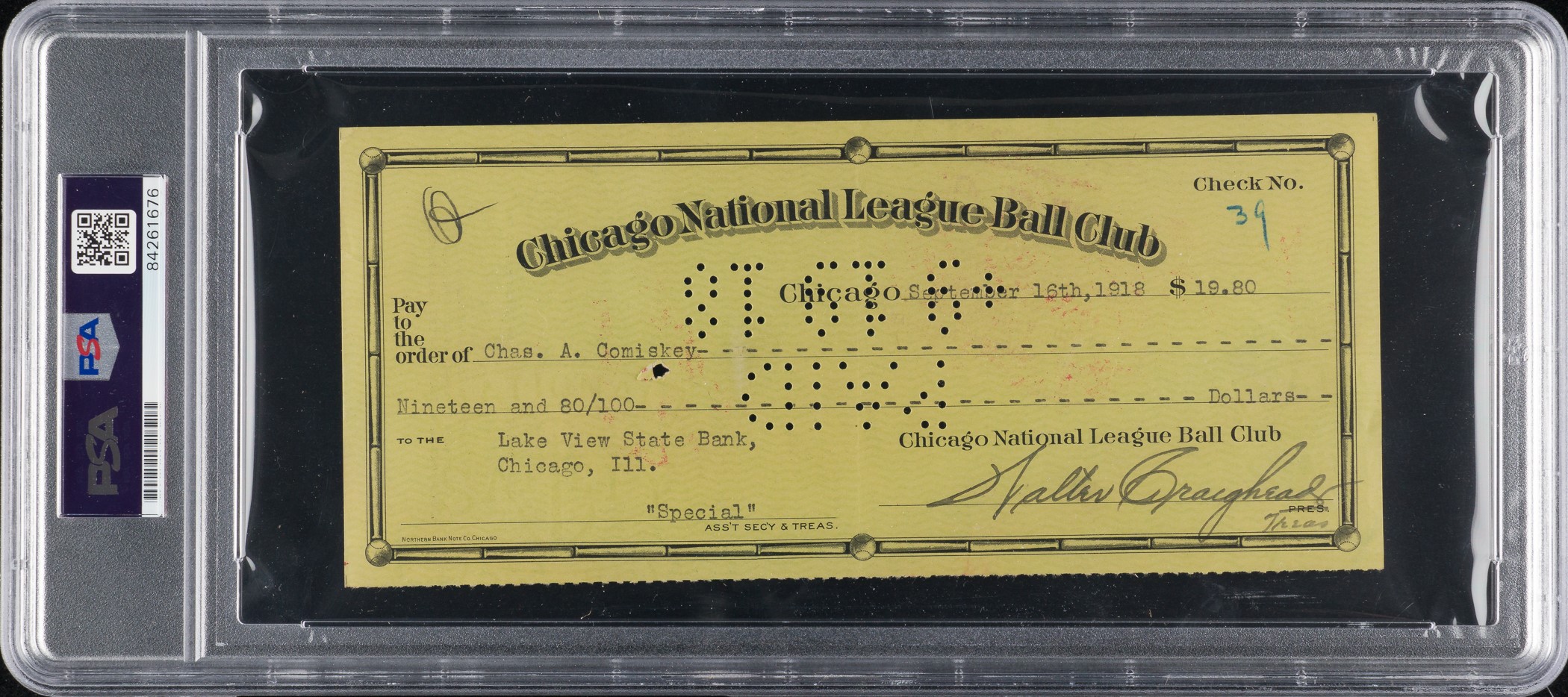 Chicago Cubs business check, dated September 16, 1918, issued to, and endorsed by, Chicago White Sox owner Charles Comiskey. The check, drawn on the Lake View State Bank of Chicago, Illinois, is made out in the amount of $19.80. Signed by the club's treasurer Walter Craighead in the lower right corner. Endorsed by "Chas. A. Comiskey" in black fountain pen (grading "8/9") on the reverse. Comiskey's son, "J. Louis Comiskey," as also endorsed the check, directly below his father's signature. (J. Louis Comiskey was a White Sox executive and inherited the team upon his father's death in 1931.) While we do not know specifically what this payment to Comiskey represents, the word "Special" is typed along the base of the check, indicating that it was a miscellaneous payment. This lot originates from the extraordinary collection of a longtime Chicago Cubs executive, Eldred "Salty" Saltwell, which is consigned to this auction by his family. The collection, which includes a remarkable array of contracts, checks, and other related documents and mementos, will be presented over a series of auctions and will offer publicly for the first time many significant items spanning decades of Chicago baseball. The check (8.25 x 3.5 inches), which has normal bank cancellation stamps and holes, displays a vertical fold, a single spindle hole, a two stray pencil marks on the front (in the upper left and right corners, respectively). In Very Good to Excellent condition overall. Reserve $200. Estimate (open).