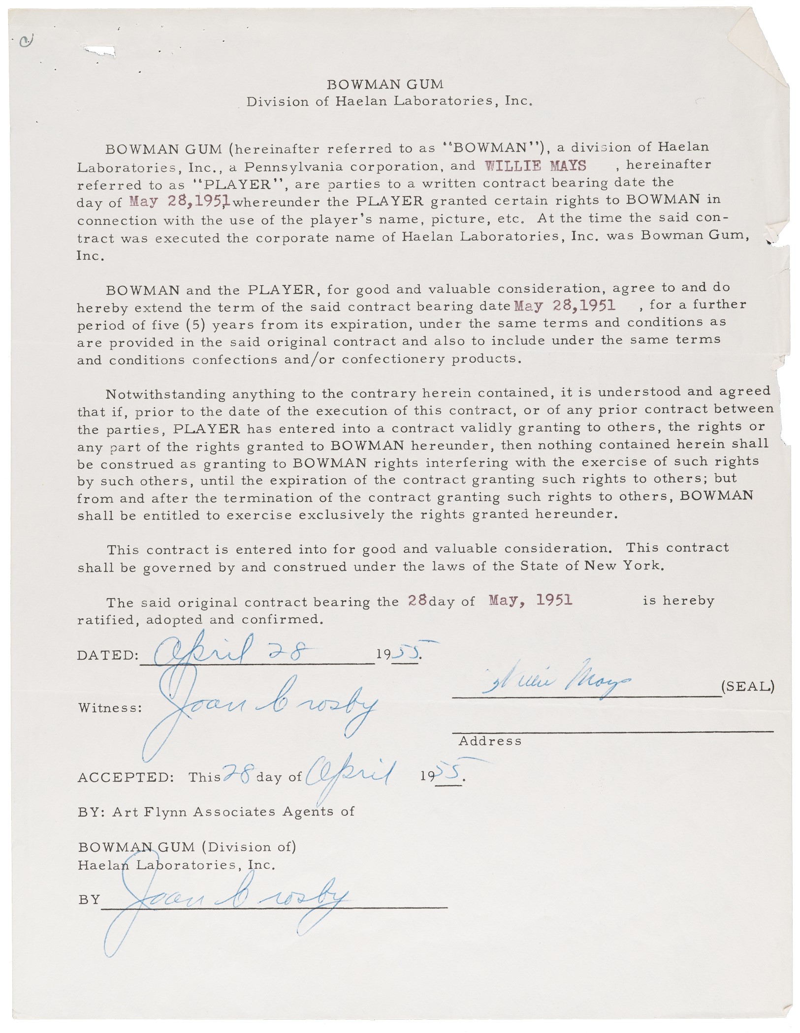 One-page contract, dated April 28, 1955, between Willie Mays and the Bowman Gum, signed in blue fountain pen by both "Willie Mays" (grading "7") and Bowman Gum executive Joan Crosby, who has also signed the contract again as a witness. The contract, which is an extension of a 1951 agreement between the parties, extends the company's right to use Mays' name, likeness, and facsimile signature on its bubble-gum cards in exchange for "good and valuable consideration" for a further period of five years from its expiration. The original contract date is listed as May 28, 1951, which was Mays' rookie season in the Majors. It is important to note that this contract was signed by Mays during the height of the bubble-gum war between Topps and Bowman. Topps eventually won out and 1955 turned out to be the last year that Bowman would issue baseball cards. The contract (8.5 x 11 inches) displays two horizontal folds, a torn staple hole in the upper left corner, and several small chips along the right border. In Very Good condition overall. Auction LOA from James Spence/JSA. Reserve $300. Estimate (open).
