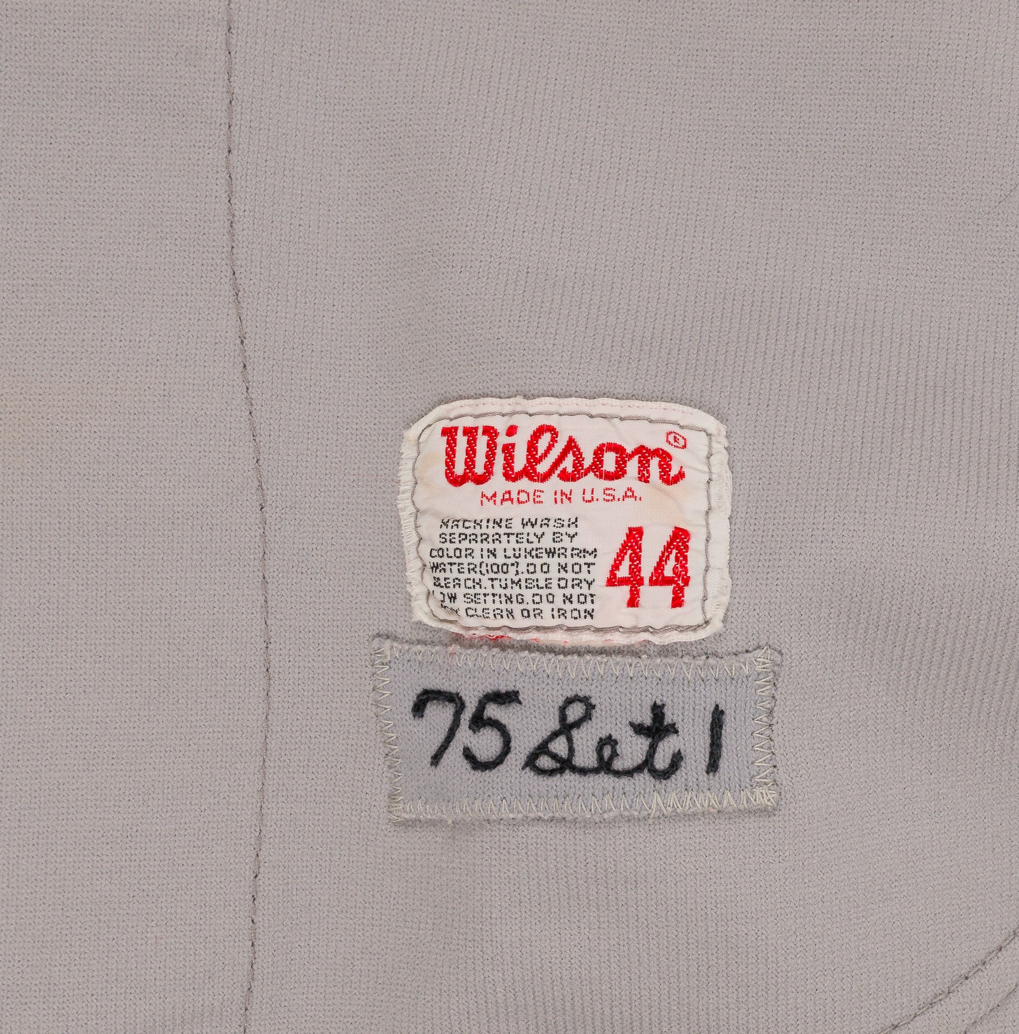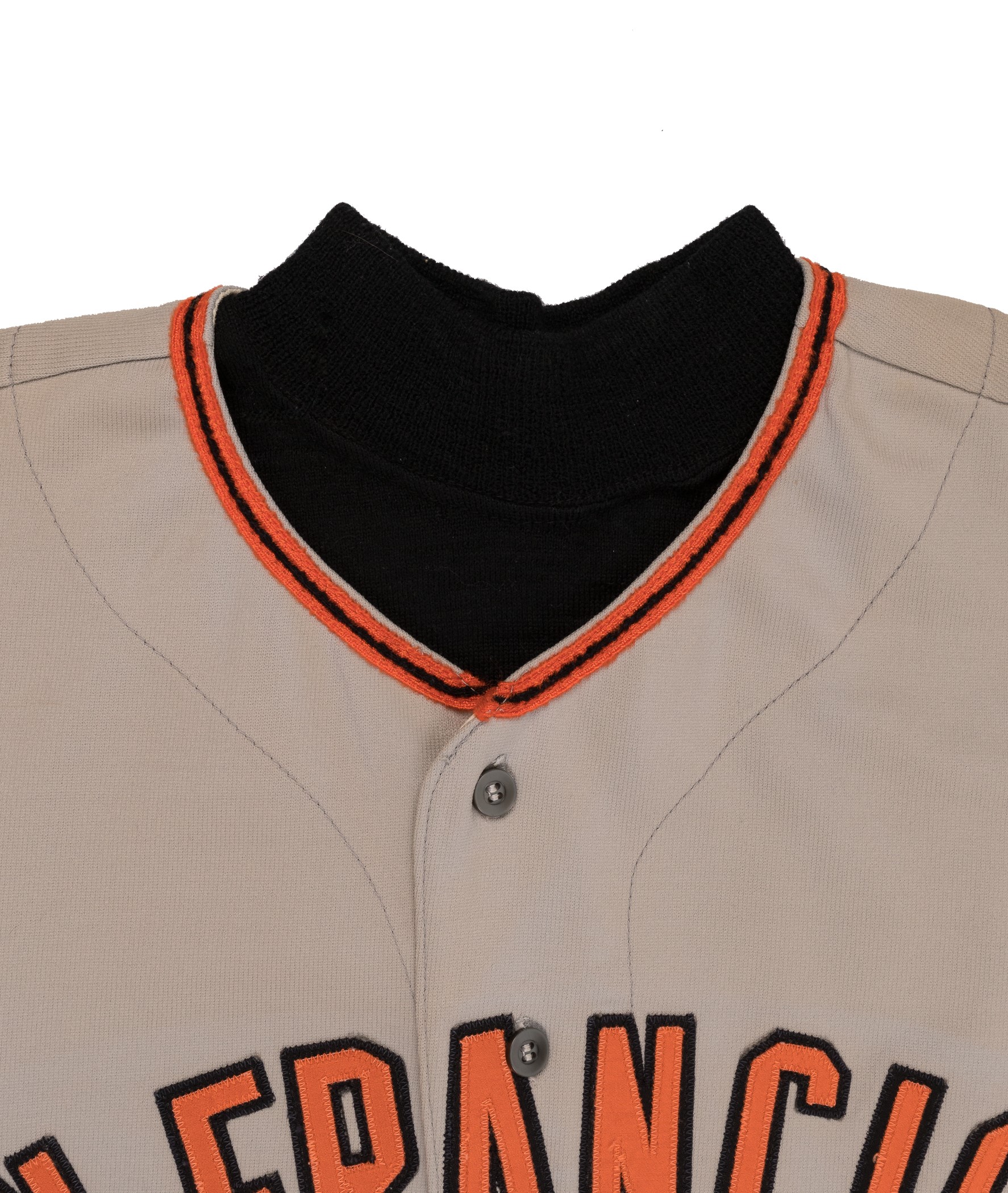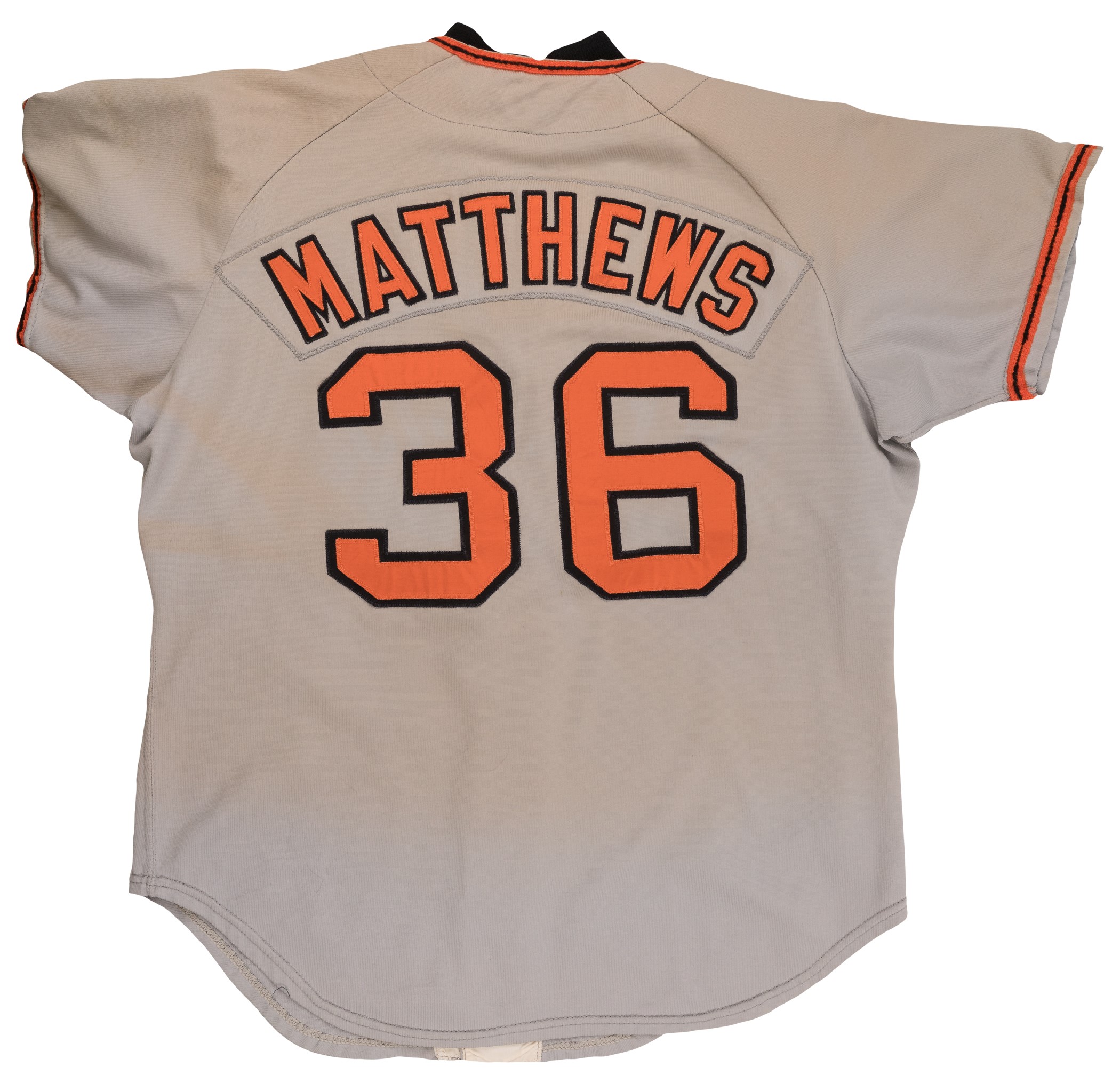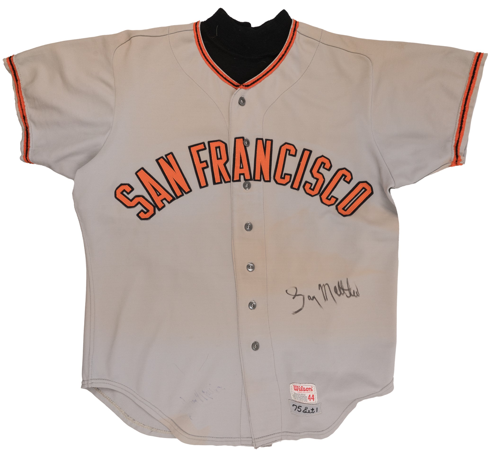 San Francisco Giants road jersey worn by outfielder Gary Matthews during the 1975 season. The gray knit jersey is lettered "San Francisco" across the front and features the number "36" on the reverse. "Matthews" is lettered on the reverse, directly above the number. All letters and numerals are appliquéd in orange on black tackle twill. A "Wilson 44" label appears on the left front tail, below which is a gray strip tag that has the year and set number ("75 Set 1") chain-stitched in black. Matthews has signed the jersey in black marker (grading "8") on the lower left tail. The jersey is original as issued, with no alterations. Moderate-to-heavy wear is displayed throughout, including light fraying to the piping on the sleeves. Accompanied by a heavy black undershirt that has been cut at the waist and sleeves. Matthews made his Major League debut with the Giants in 1972 and the following year was named the National League Rookie of the Year. Matthews batted .280, with 12 home runs and 58 RBI in 1975. He finished his sixteen-year career (1972-1987) with 234 home runs, 978 home runs, and a .281 average. Reserve $100. Estimate (open).