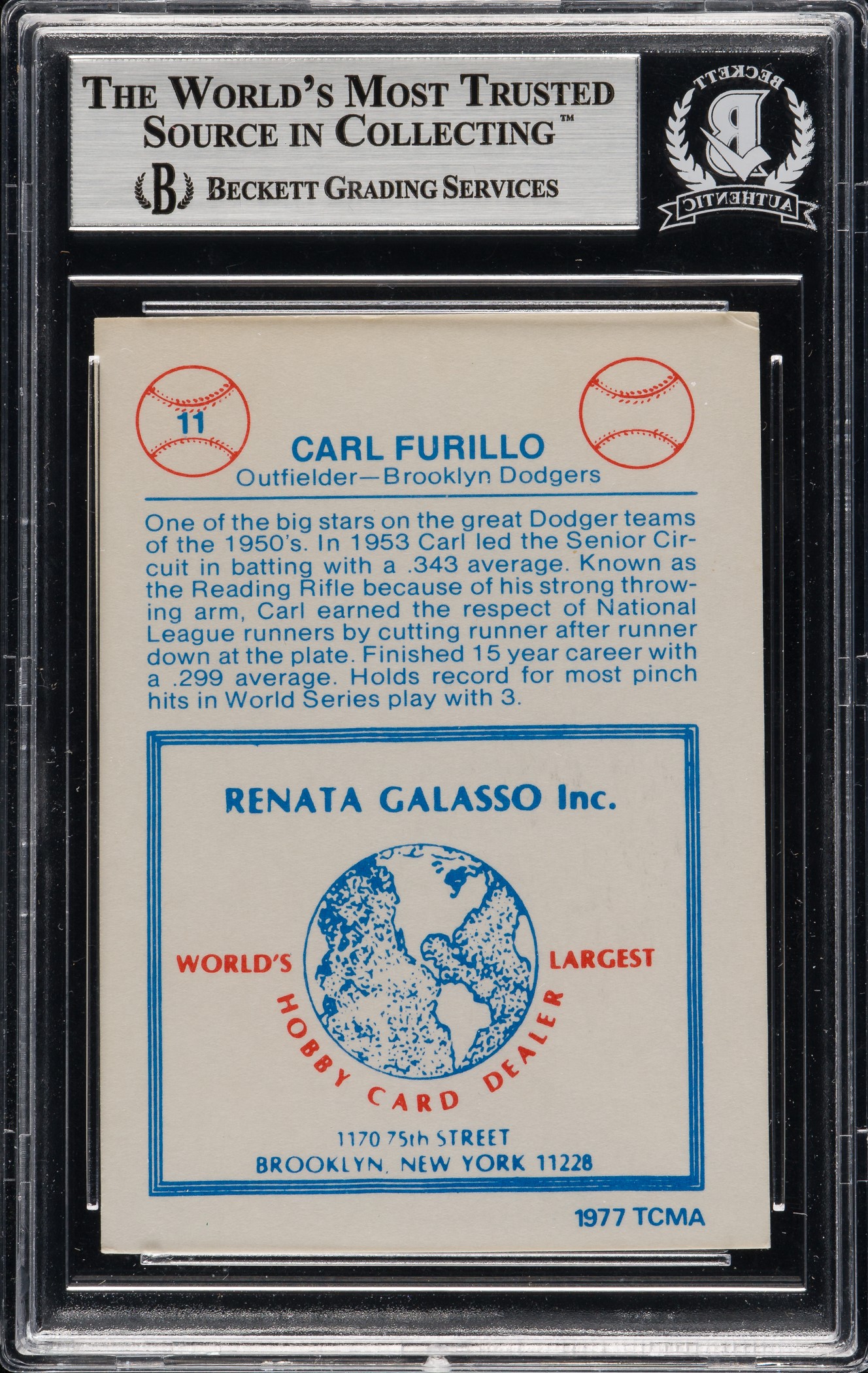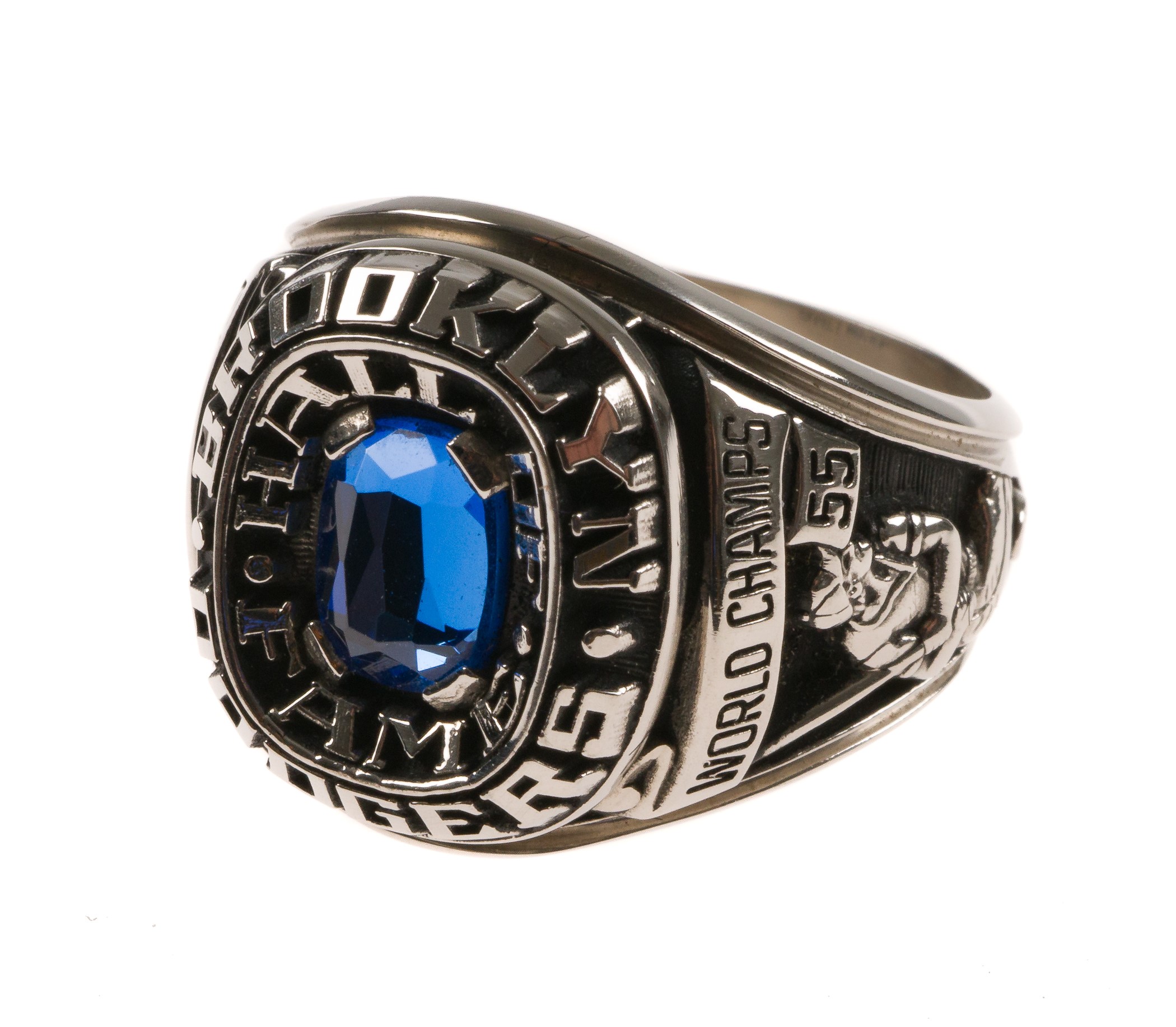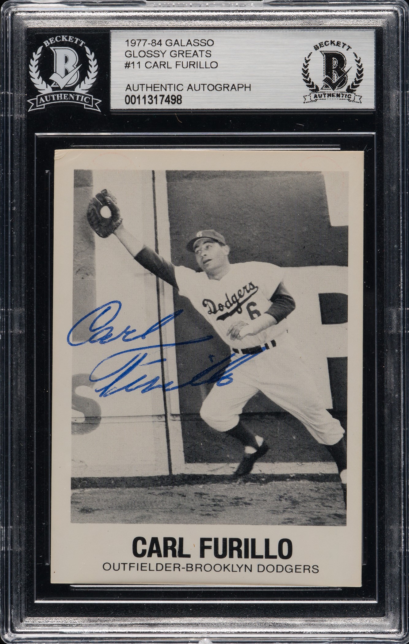 Recent research may shed some light on the nature of these Brooklyn Dodgers Hall of Fame rings: The Brooklyn Dodgers Baseball Hall of Fame was founded in 1984 by lifelong Brooklyn resident and Dodgers fan Marty Adler. According to Adler's August 13, 2013, obituary in the New York Times (http://www.nytimes.com/2013/08/18/sports/baseball/marty-adler-curator-of-the-brooklyn-dodgers-legacy-dies-at-76.html?_r=0), the museum "never had a permanent home — it was essentially a personal journey down his baseball memory lane — but it enabled him to share his passion for the Dodgers with his fellow Brooklynites." Later in the same article, the Times notes that the first three inductees into the Brooklyn Dodgers Baseball Hall of Fame in 1984 "were figures from the 1950s teams that came to be known as the Boys of Summer: pitcher Carl Erskine, right fielder Carl Furillo and first baseman Gil Hodges, who died in 1972 while managing the Mets and was represented by his widow, Joan." The ring remains in Near Mint condition. Size: approximately 11. Weight: approximately 14 grams. Accompanied by a 1977-1984 Galosso Glossy Greats Carl Furillo card #11, signed by Furillo in blue ink (grading "9") on the front (Ex). Beckett has encapsulated the card and certified the signature as "Authentic." Total: 2 items: ring and card. Reserve $500. Estimate (open).
