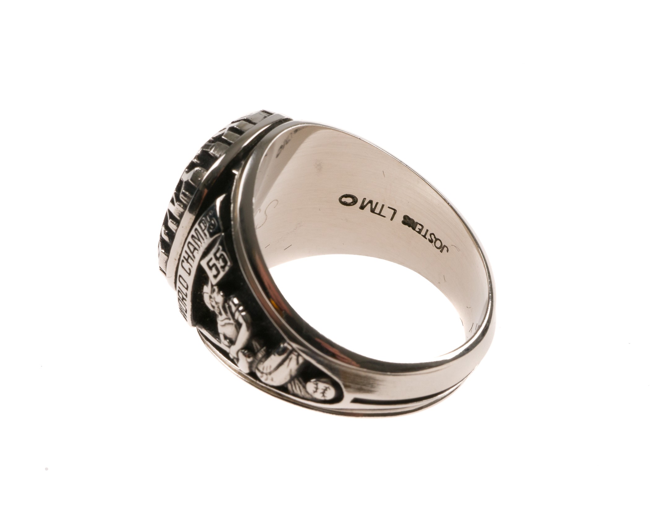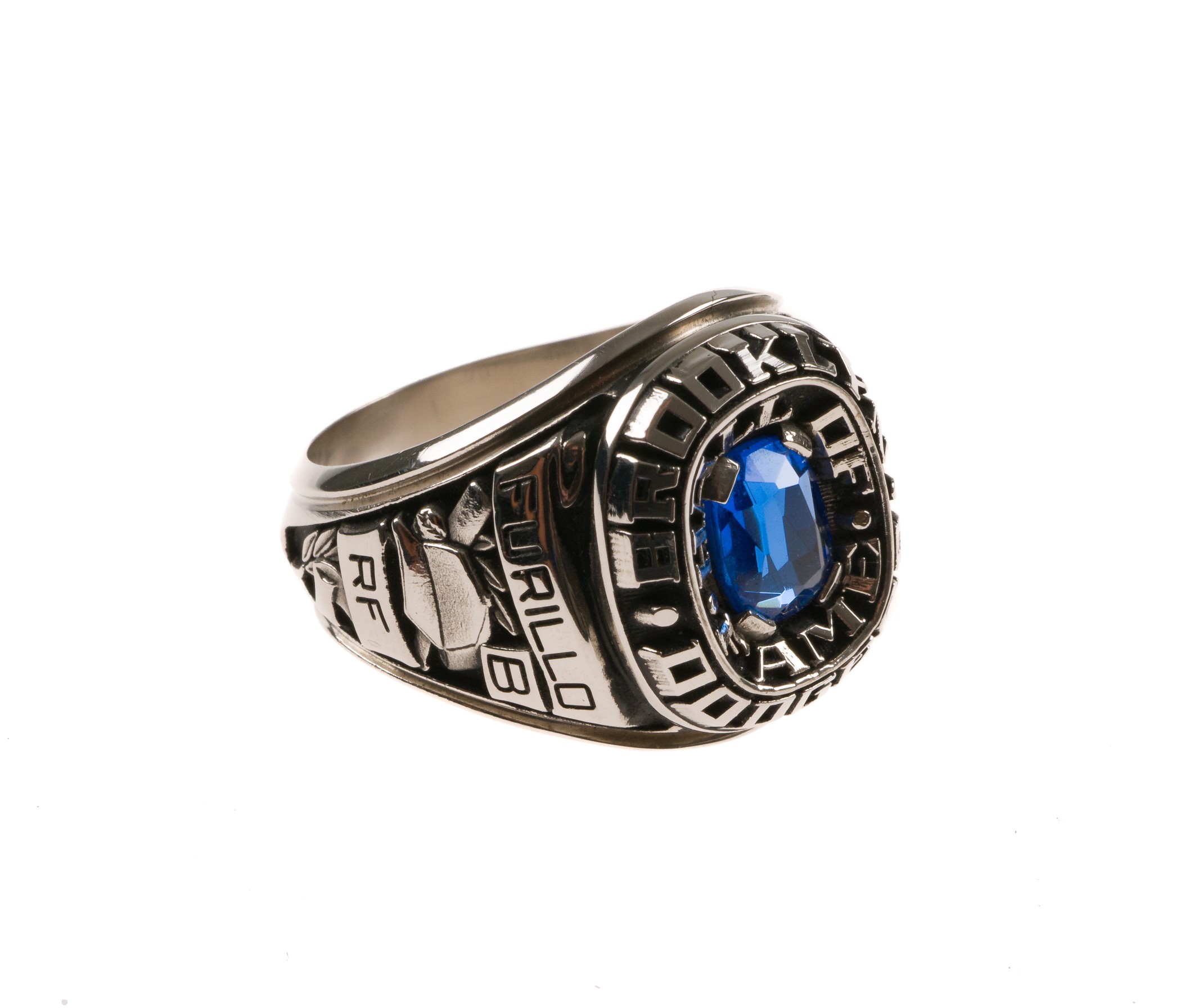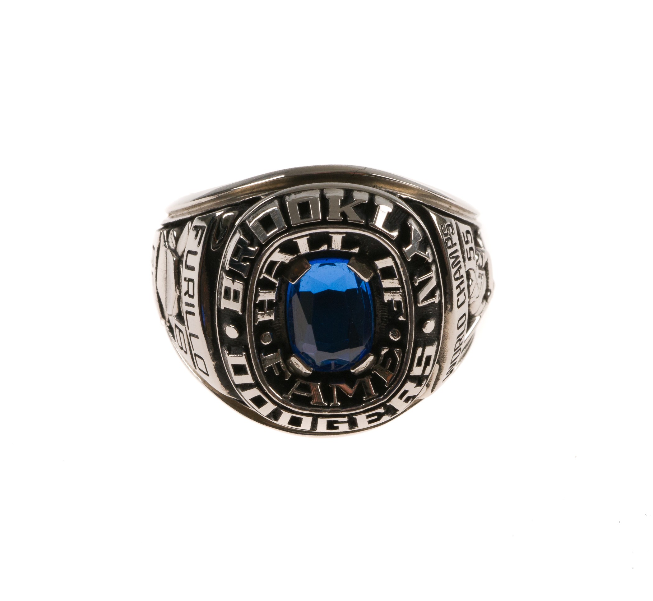 Silver-colored ring, produced by Jostens, commemorating Carl Furillo's induction into the Brooklyn Dodgers Hall of Fame. This is just the second Brooklyn Dodgers Hall of Fame ring we have ever seen. (The first, a Gil Hodges example originating directly from the Hodges family, appeared as Lot 1258 in REA's Spring 2014 auction, where it realized $1,422.) While we do not know exactly how many such rings were produced (if, indeed, more than one) they are obviously rare. The ring features a blue stone in the center, with the lettering around the outer and inner bezel reading, respectively, "Brooklyn Dodgers" and "Hall of Fame." The left shank features a player in a batting pose and is engraved "World Champs/55." The right shank features a likeness of a cap, bat, and ball, and is engraved "Furillo/B/RF." (The "B" denotes "Brooklyn" and "RF" denotes Furillo's position.) The manufacturer's name, "Jostens LTM," is engraved on the interior band along with the initials "SF" (most likely denoting "Skoonj" Furillo).