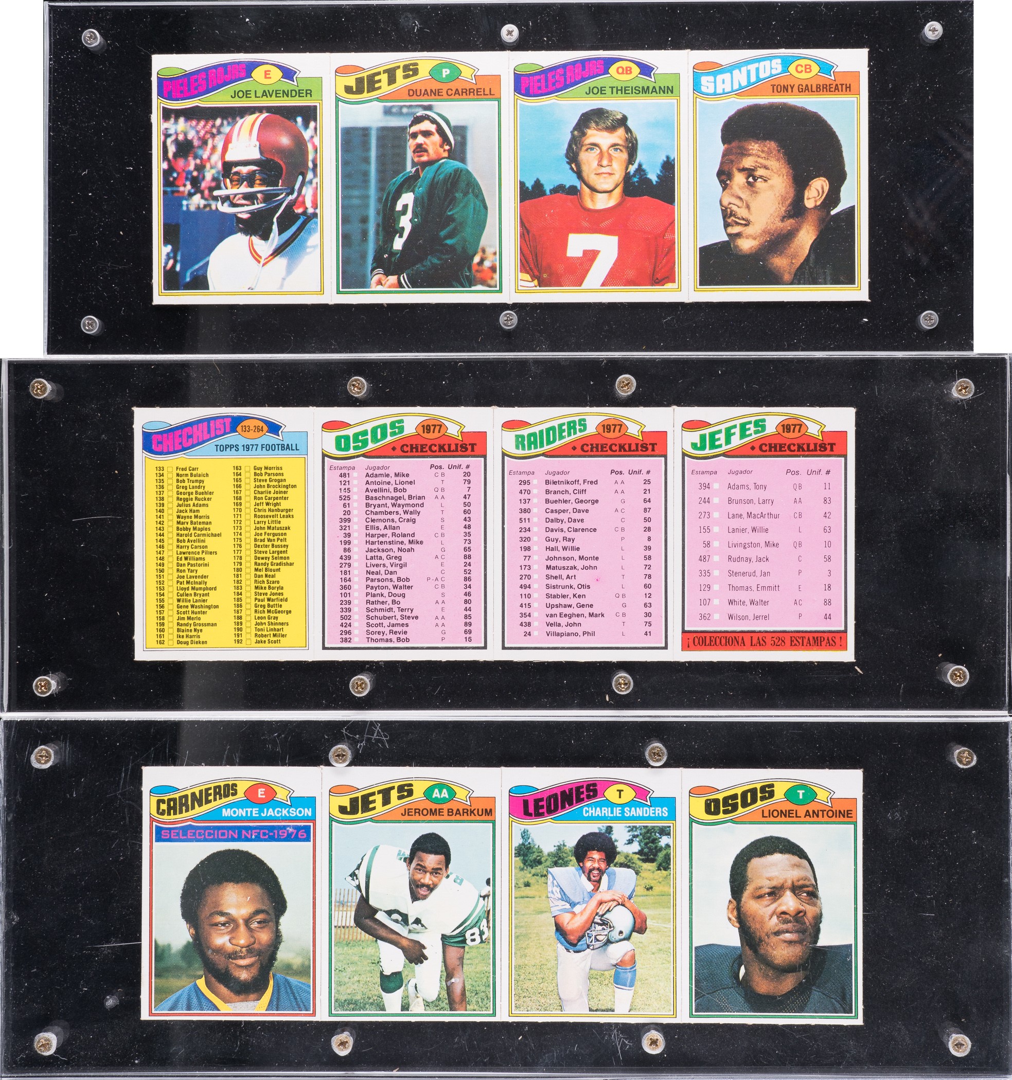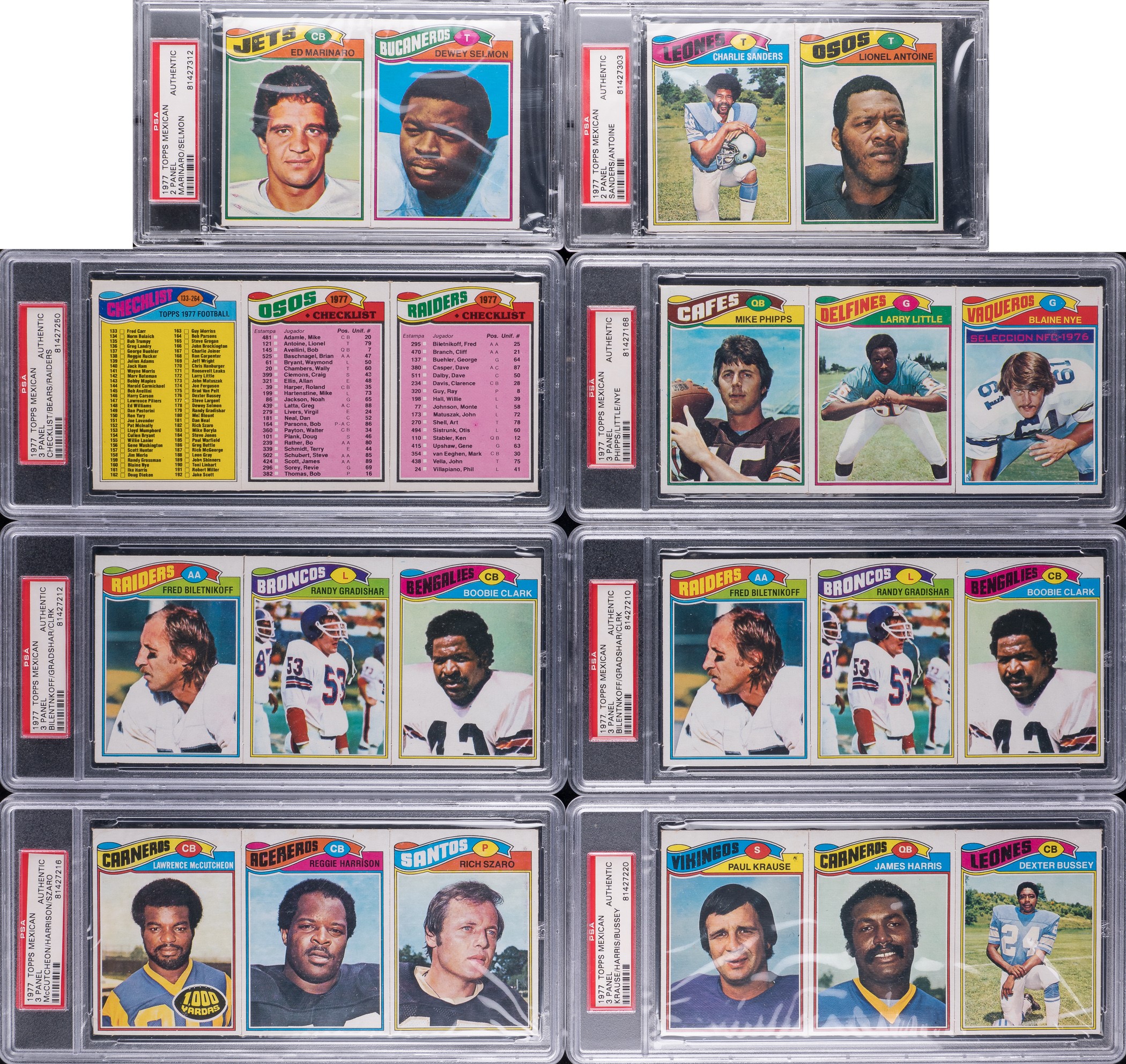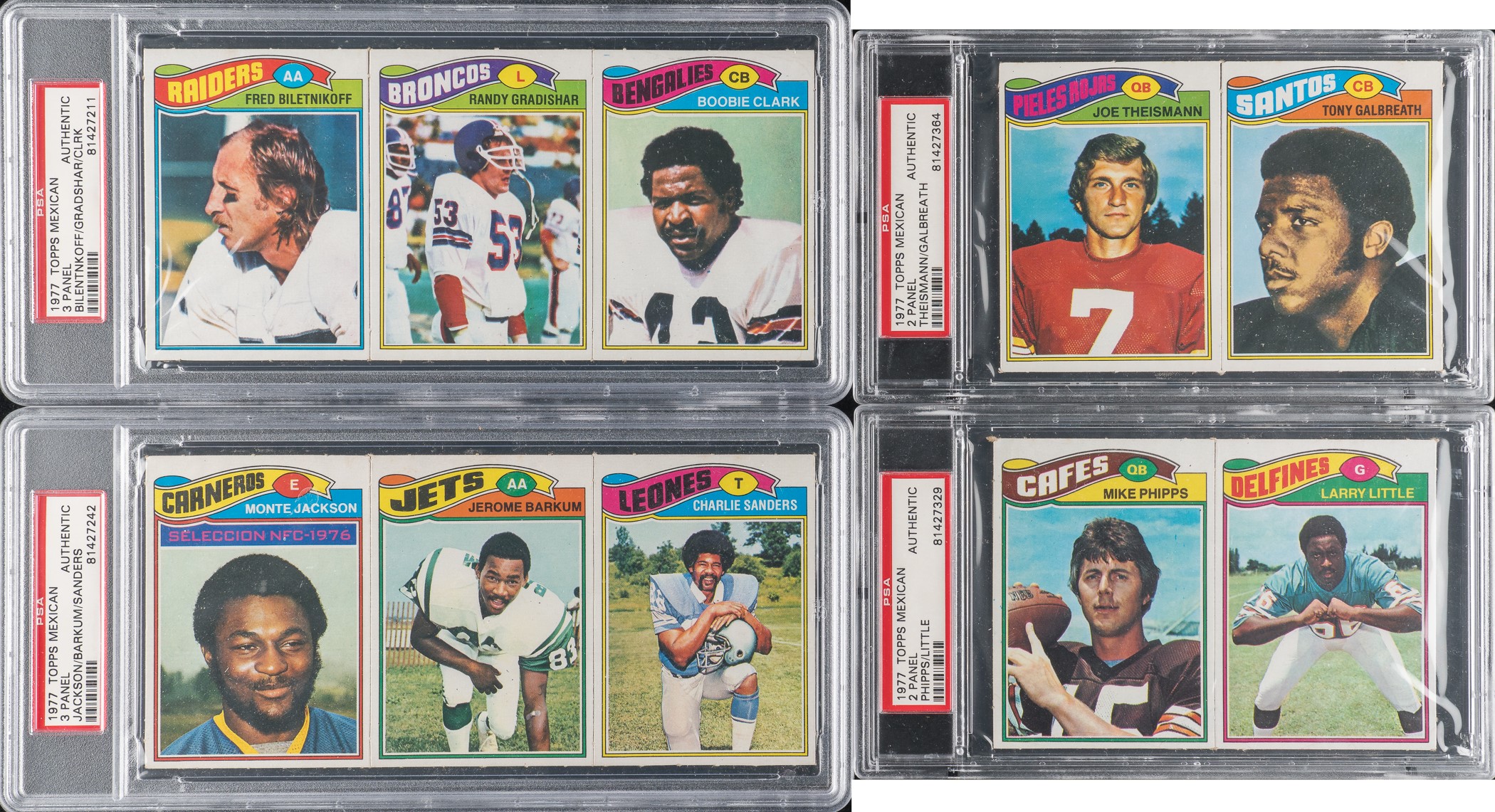 Presented is a substantial collection of 252 uncut panels from the 1977 Topps Mexican Football series, consisting of 693 cards in total, highlighted by forty-three Hall of Famers. The extremely rare Topps "Mexican" series is among the most fascinating football sets of the 1970s. They are identical in design to their American counterparts, but with the text printed in Spanish. This collection is composed of 120 two-card panels, seventy-five three-card panels, and fifty-seven four-card panels. Of the 252 panels offered in this collection, 195 have been encapsulated as Authentic by PSA, while the balance are housed in plastic screw-down holders. The forty-three Hall of Famers included are represented by multiple examples of #85 Charlie Sanders, 125 Paul Krause, 172 Larry Little, and 295 Fred Biletnikoff. All the panels appear to be in Excellent condition with bright colors and crisp images. Moderate to heavy duplication throughout.