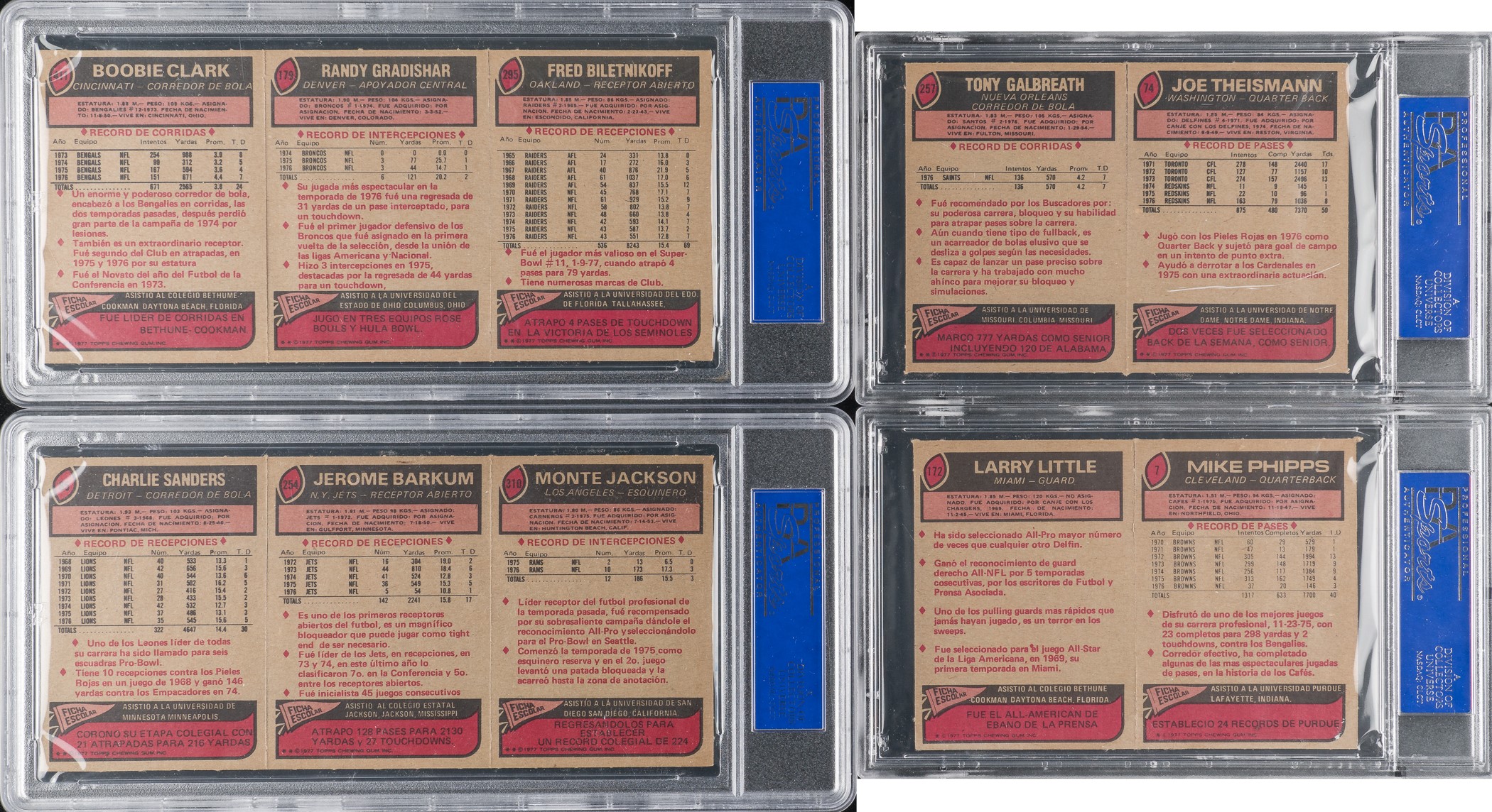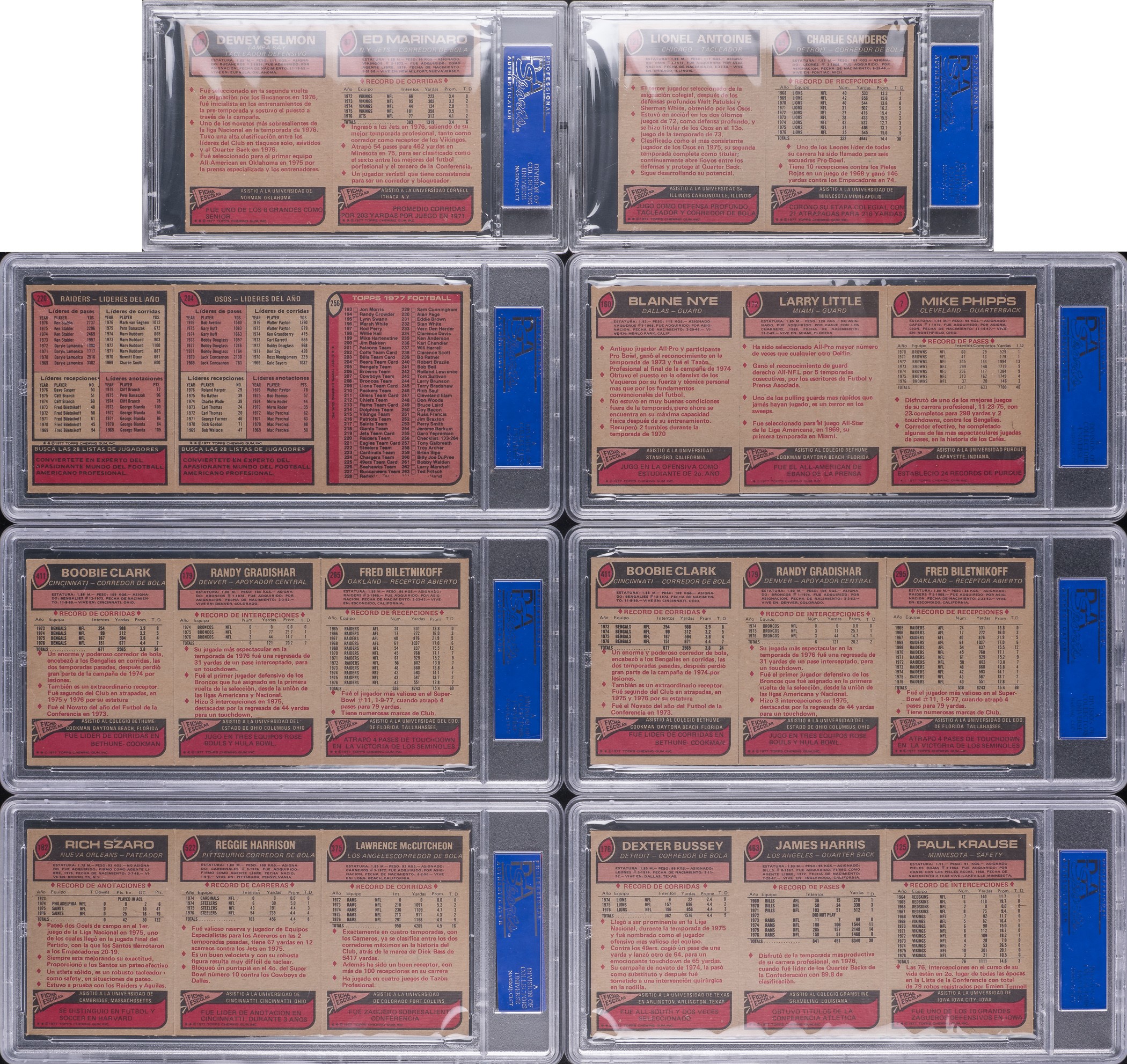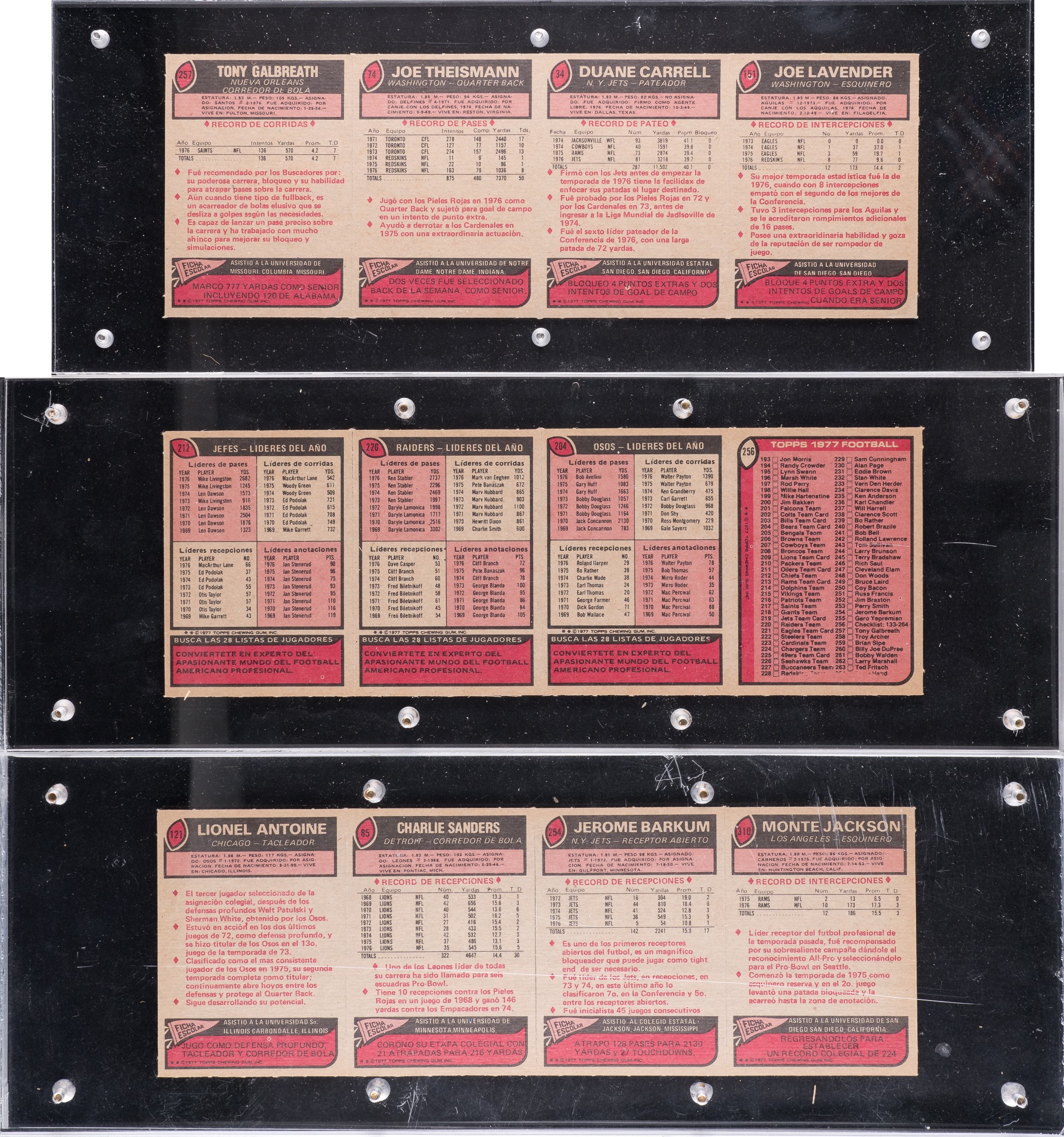 Presented is a substantial collection of 252 uncut panels from the 1977 Topps Mexican Football series, consisting of 693 cards in total, highlighted by forty-three Hall of Famers. The extremely rare Topps "Mexican" series is among the most fascinating football sets of the 1970s. They are identical in design to their American counterparts, but with the text printed in Spanish. This collection is composed of 120 two-card panels, seventy-five three-card panels, and fifty-seven four-card panels. Of the 252 panels offered in this collection, 195 have been encapsulated as Authentic by PSA, while the balance are housed in plastic screw-down holders. The forty-three Hall of Famers included are represented by multiple examples of #85 Charlie Sanders, 125 Paul Krause, 172 Larry Little, and 295 Fred Biletnikoff. All the panels appear to be in Excellent condition with bright colors and crisp images. Moderate to heavy duplication throughout.