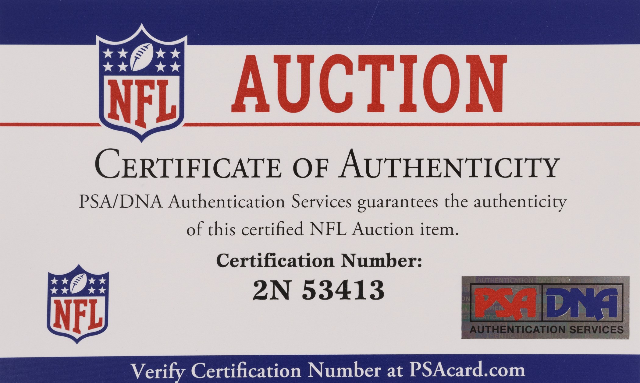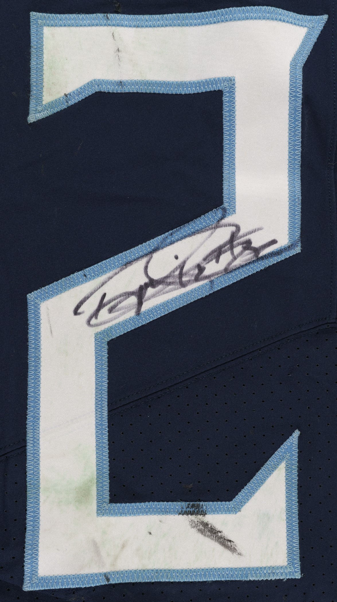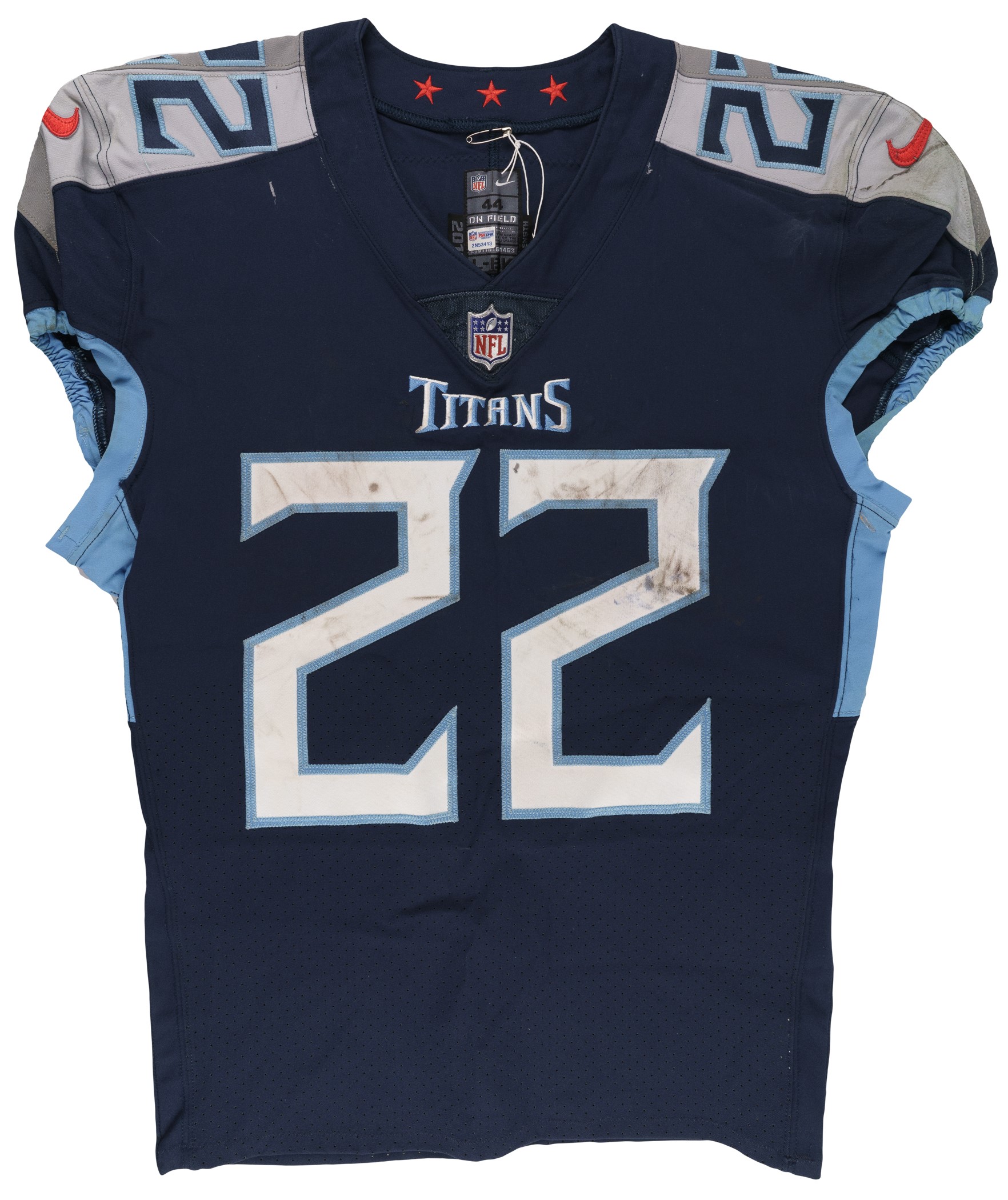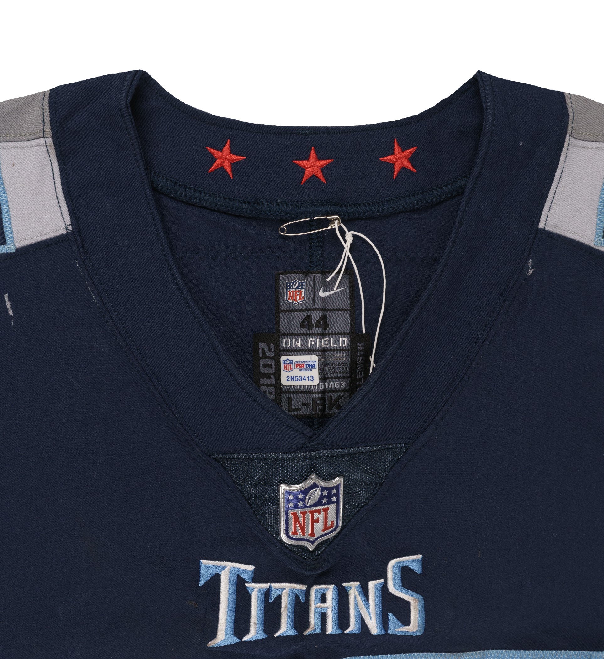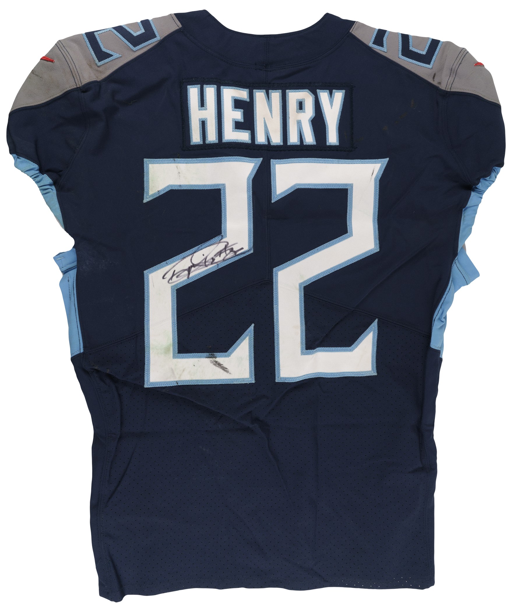 Tennessee Titans home jersey worn by running back Derrick Henry on October 14, 2018, in a game against the Baltimore Ravens at Nissan Stadium in Tennessee. This jersey was obtained at an NFL auction and is accompanied by both an NFL Auction COA (certified by PSA/DNA, together with a corresponding hologram label affixed to the jersey) and a photo of Henry from the October 14, 2018, game that clearly shows him wearing this jersey. The blue jersey features the number "22" on the front, reverse and each shoulder. "Henry" is lettered on the reverse directly above the number. The team name "Titans" is embroidered in blue and white stitch on the front, directly above the number. All front and reverse numerals, along with all letters, are appliquéd in white on blue tackle twill. All shoulder numerals are appliquéd in navy on light blue tackle twill. An "NFL On Field 44" label appears in the collar, together with a "2018" year tag, and a flag tag reading "+2 Length." Henry has signed the jersey in blue Sharpie (grading "9") on the first numeral "2" on the reverse. The jersey is original as issued, with no alteration, and displays heavy wear, including numerous stains, including a distinctive mark on the reverse number that allows for a conclusive photo match. Henry rushed for 21 yards on 7 carries and had 1 reception for 5 yards in the Titans' 21-0 loss to the Ravens on October 14, 2018. For the season, which was his third in the NFL, Henry rushed for 1.059 yards and 12 touchdowns. In 2019 Henry led the NFL in rushing and helped lead the Titans to the AFC Championship game. This is an outstanding Derrick Henry game-used jersey with the added appeal of being photo matched to a specific game. COA from NFL Auction (certified by PSA/DNA). Reserve $1,000. Estimate (open).