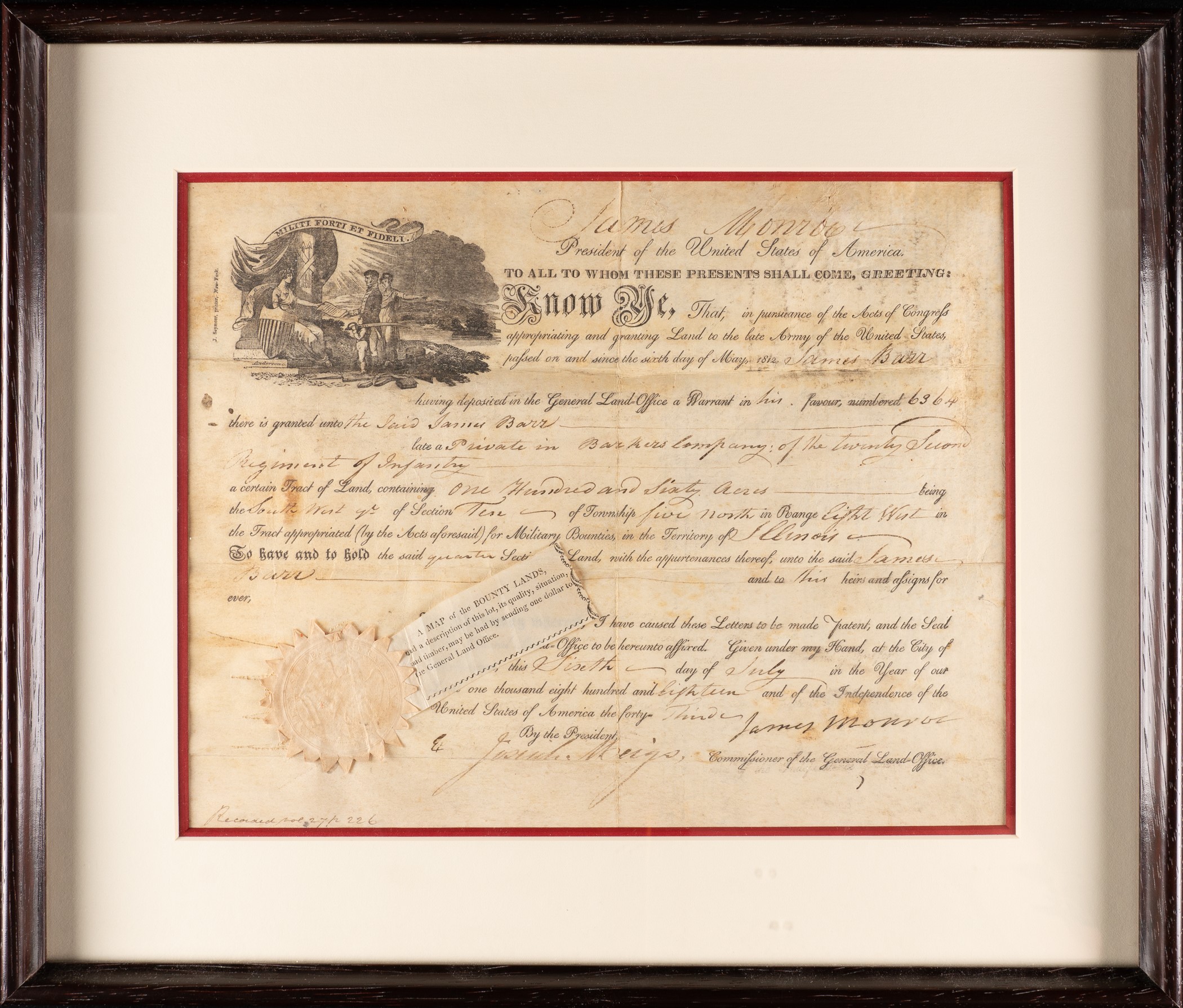 One-page document, dated July 6, 1818, signed by James Monroe (1758-1831), 5th President of the United States (1817-1825). The document, which is both printed and handwritten, grants James Barr 160 acres of land in Illinois and has been signed in black ink by President James Monroe (grading "8") and countersigned by the commissioner of the general land office. The official government seal, which is faded, is securely affixed in the lower left corner. The document (12 x 9.25 inches; visible dimensions) displays one vertical and three horizontal folds, toning, and moderated foxing. In apparent Very Good condition. Matted and framed to total dimensions of 16.75 x 14.25 inches. Auction LOA from James Spence/JSA. The size/weight of this item requires that there will be an additional shipping charge for this lot. Reserve $500. Estimate (open).