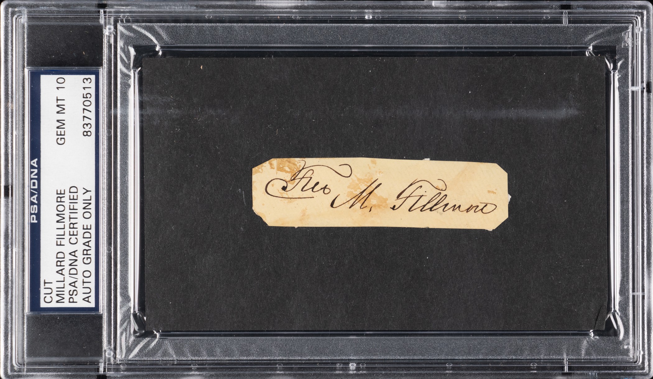 Cut signature of Millard Fillmore (1800-1874), thirteenth President of the United States. PSA/DNA has encapsulated the cut and graded the signature GEM MINT 10. Fillmore's signature has been scripted in black ink and contrasts beautifully against the light background of the unlined sheet. The cut (3 x .75 inches), which has been trimmed to its current dimensions, displays a few small areas of adhesive residue. It has been affixed to a larger black mount measuring 5 x 3 inches. Reserve $200. Estimate (open).