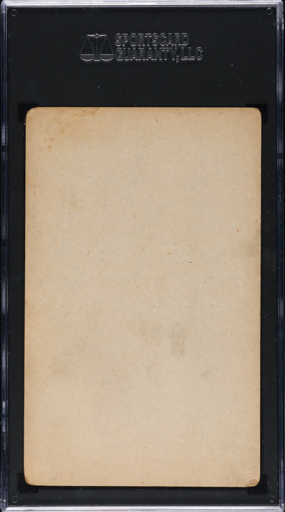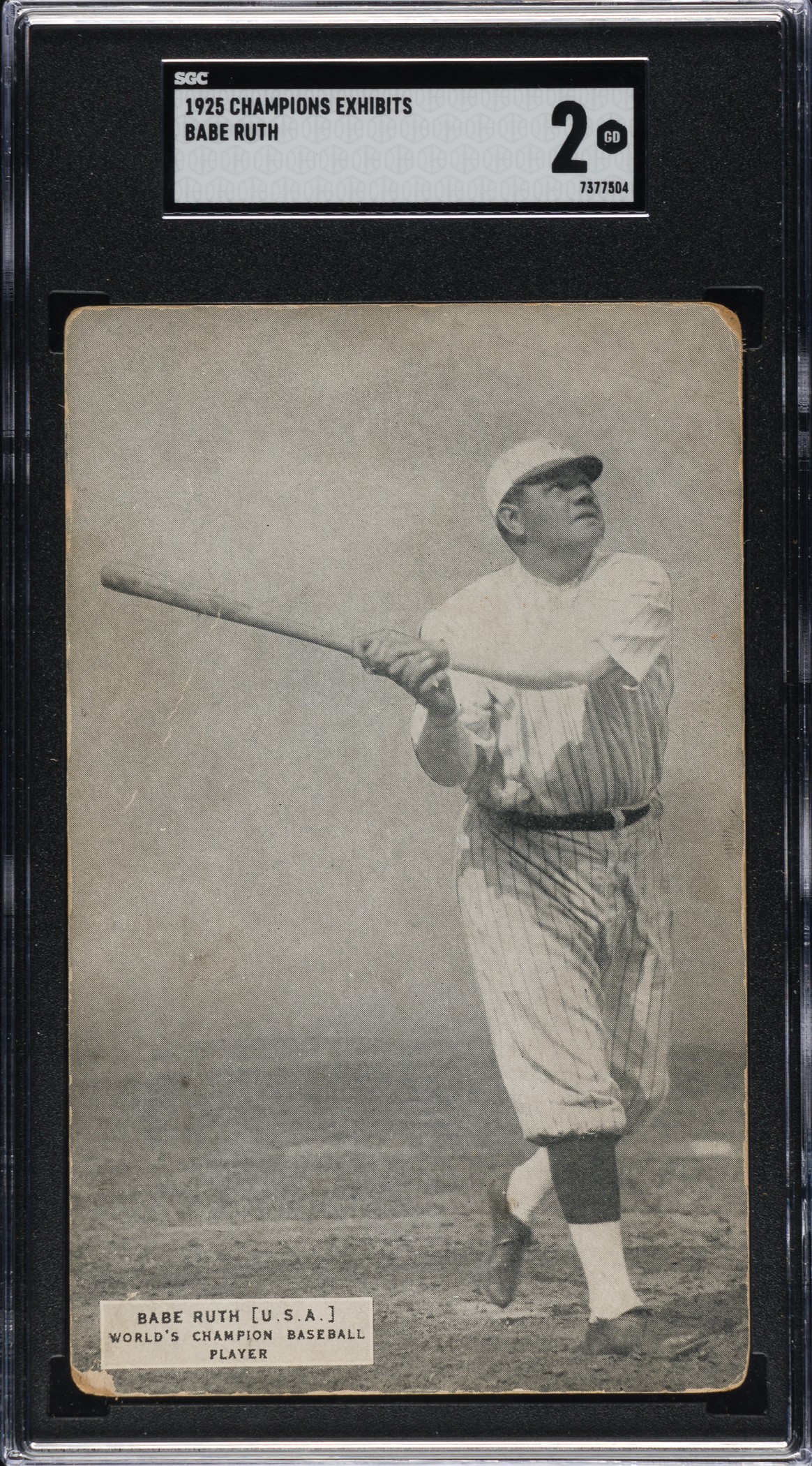 Extremely rare Exhibit-style card (3-3/8 x 5-3/8 inches) featuring Babe Ruth in a follow-through swing. One of the few Ruth cards dating from the mid-1920s, this striking card was one in a series of thirty-two cards featuring the top athletes of the day, with a different athlete representing each sport. Babe Ruth is the only baseball player in the set. A small white box in the lower left corner has the printed notation “Babe Ruth [U.S.A.] World’s Champion Baseball Player.” Graded GOOD 2 by SGC (submitted by REA) due to light creasing, honest corner wear, and minor soiling on the blank reverse. One of Babe Ruth’s rarest Exhibit cards! This is a special and very distinctive looking Babe Ruth card that has always been one of our favorites and which has received very little attention in large part simply because of its great rarity. Reserve $500. Estimate (open).