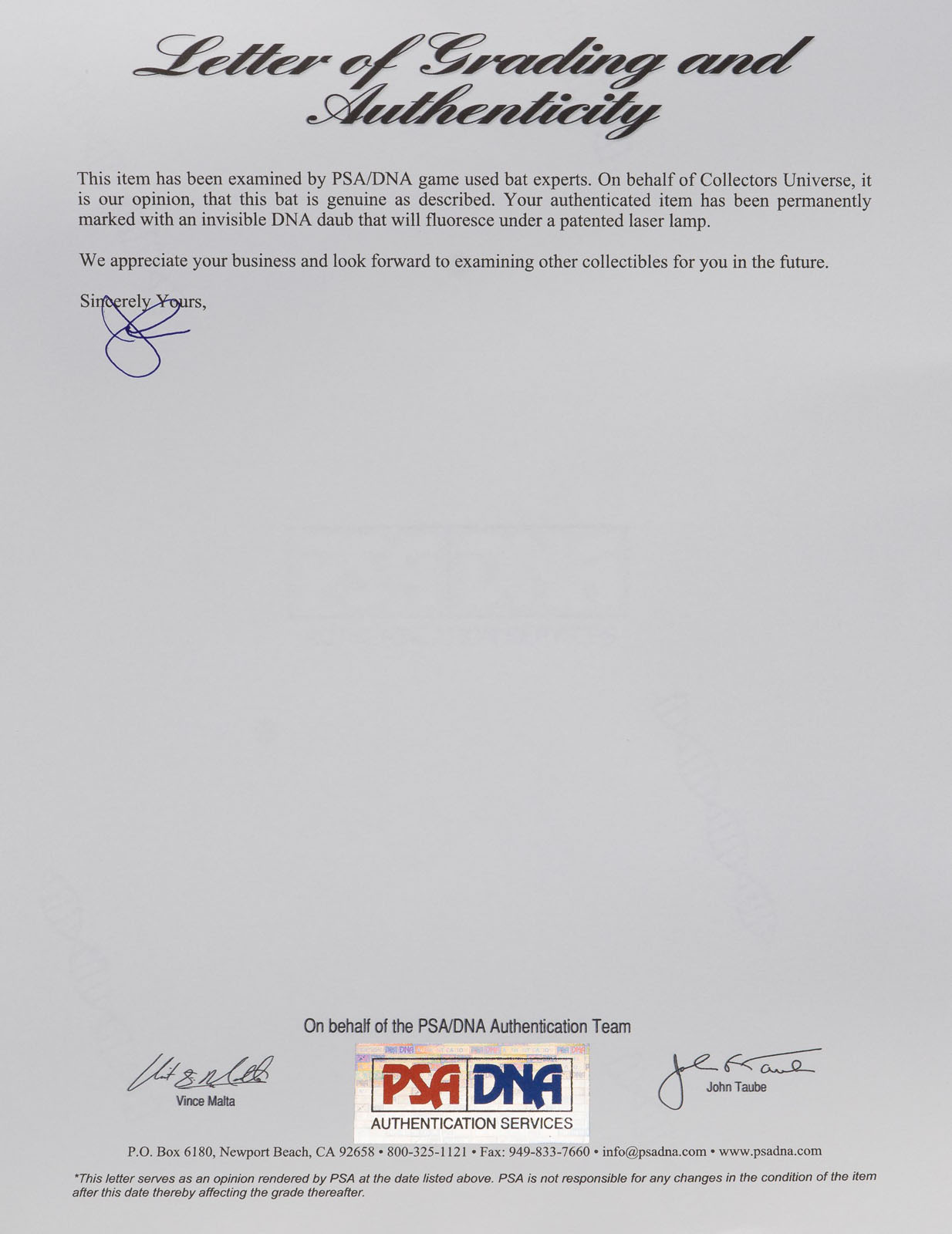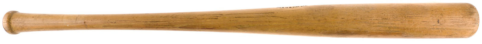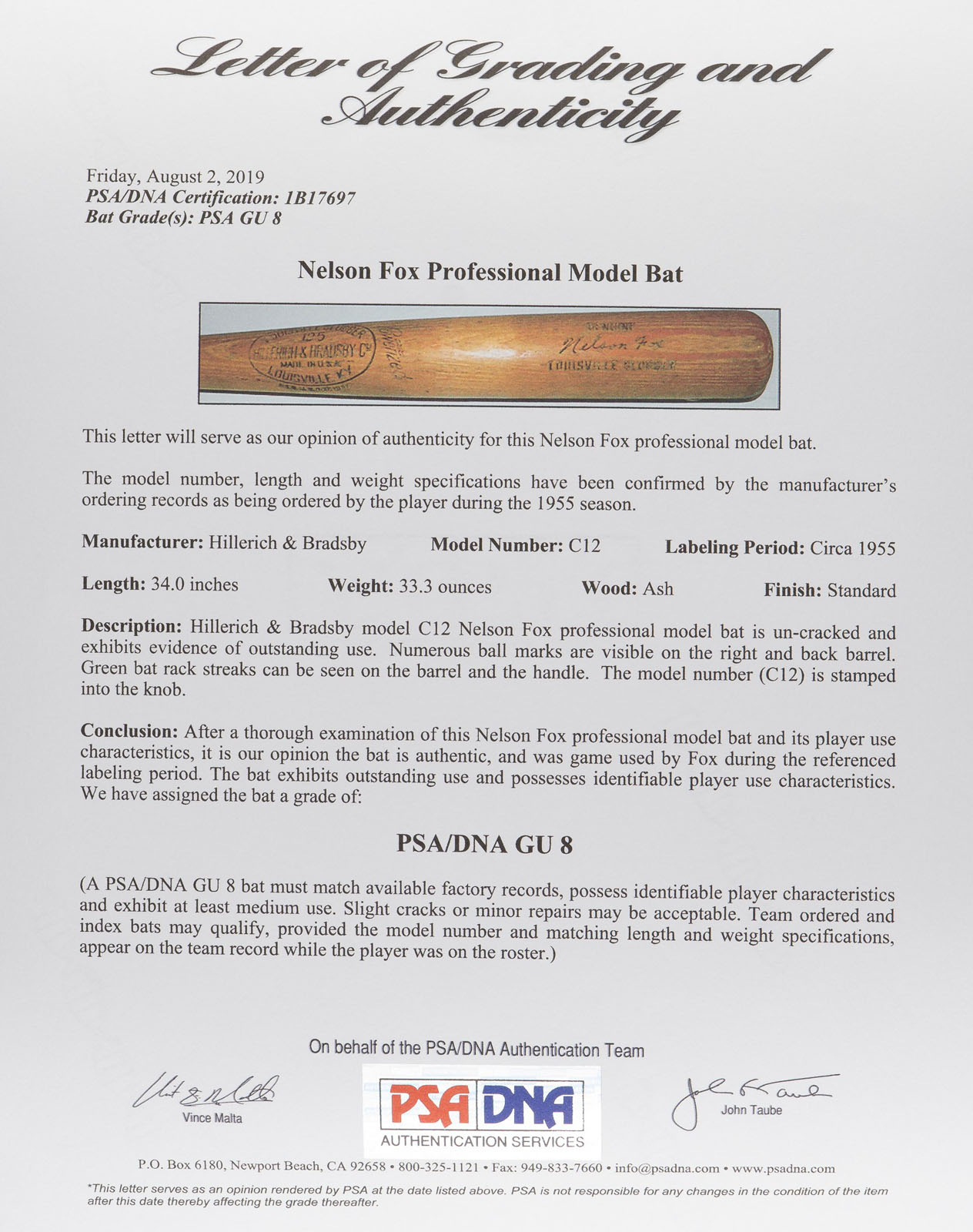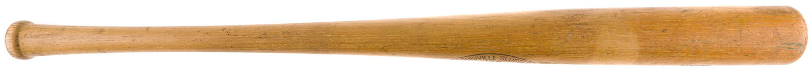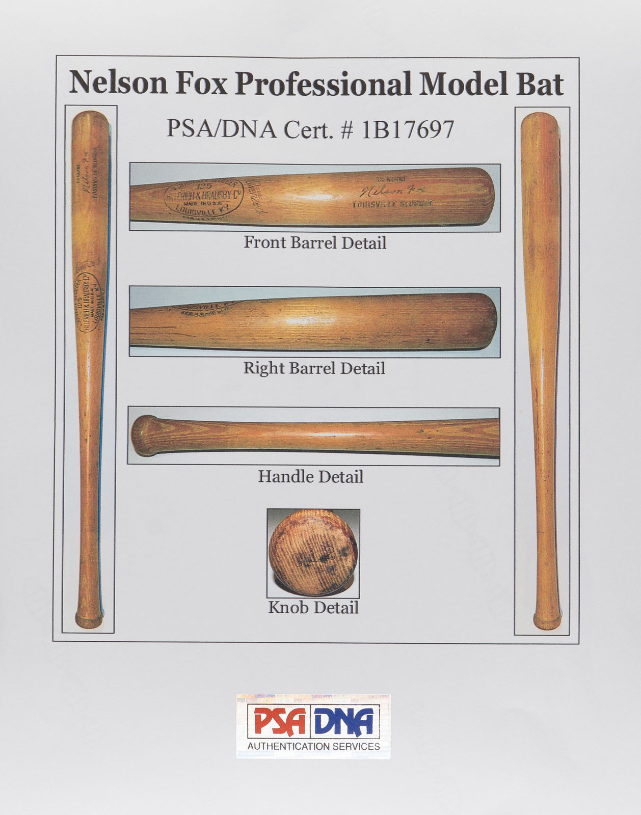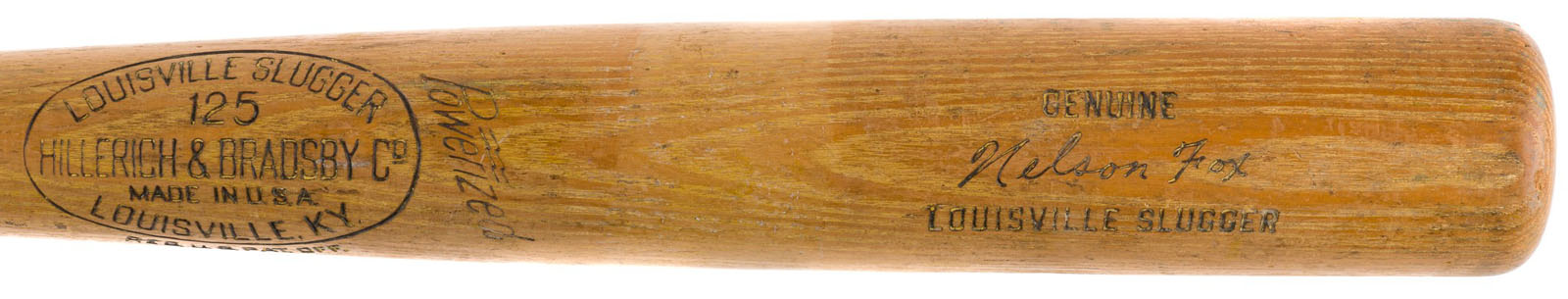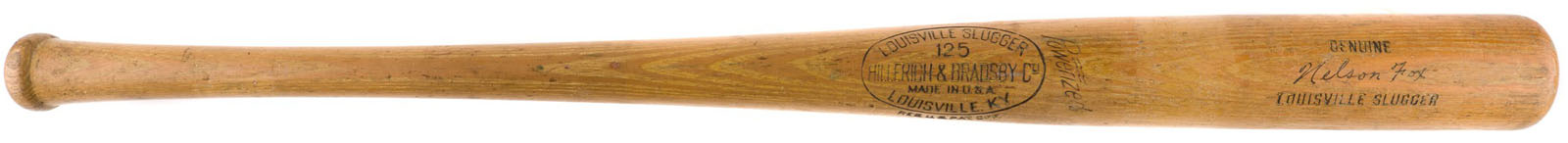 Nellie Fox H&B signature-model ("C12") bat dating from the mid 1950s. Graded GU 8 by PSA/DNA. The bat, which is not cracked, displays evidence of outstanding use, including numerous ball marks on the right and back barrel, and green bat-rack marks on the barrel and handle. Second baseman Nellie Fox was the main catalyst of the "Go Go" White Sox in the 1950s and one of the game's most durable players. Fox set a record for consecutive games at second base, playing 798 straight between August 7, 1956, and September 3, 1960. Dependable both in the field and at the plate, he batted over .300 and led the league in fielding percentage at his position six times over the course of his nineteen-year career. Fox was also one of the most difficult men to strike out. In 9,232 at bats, Fox struck out only 216 times, which ranks as the third-best percentage in Major League history. He was elected to the Hall of Fame in 1997. Length: 34 inches. Weight: 33.3 ounces. LOA from John Taube of PSA/DNA. Reserve $500. Estimate (open).
